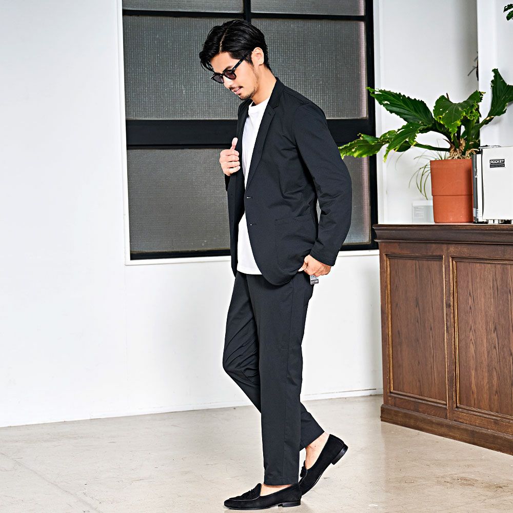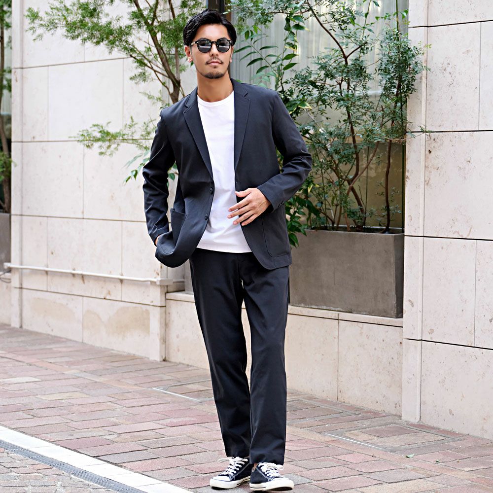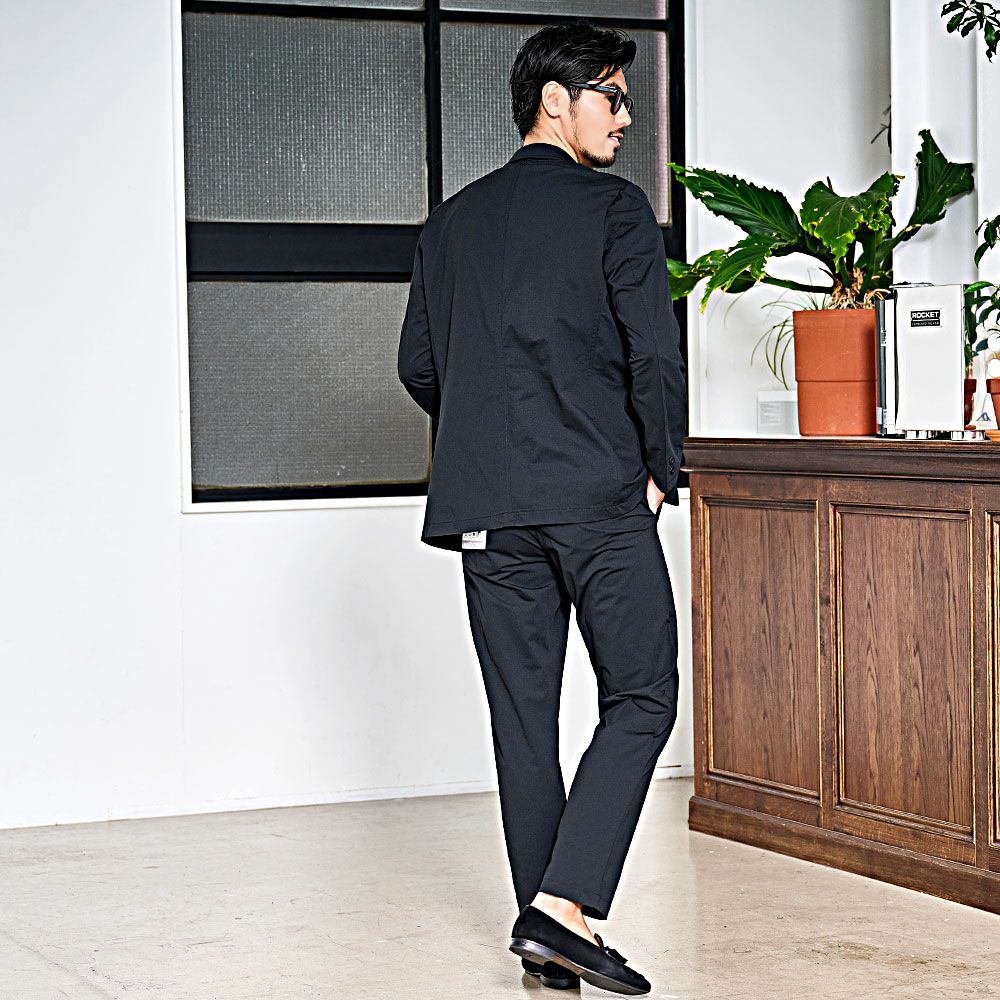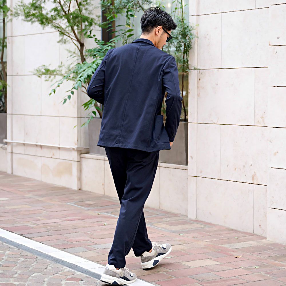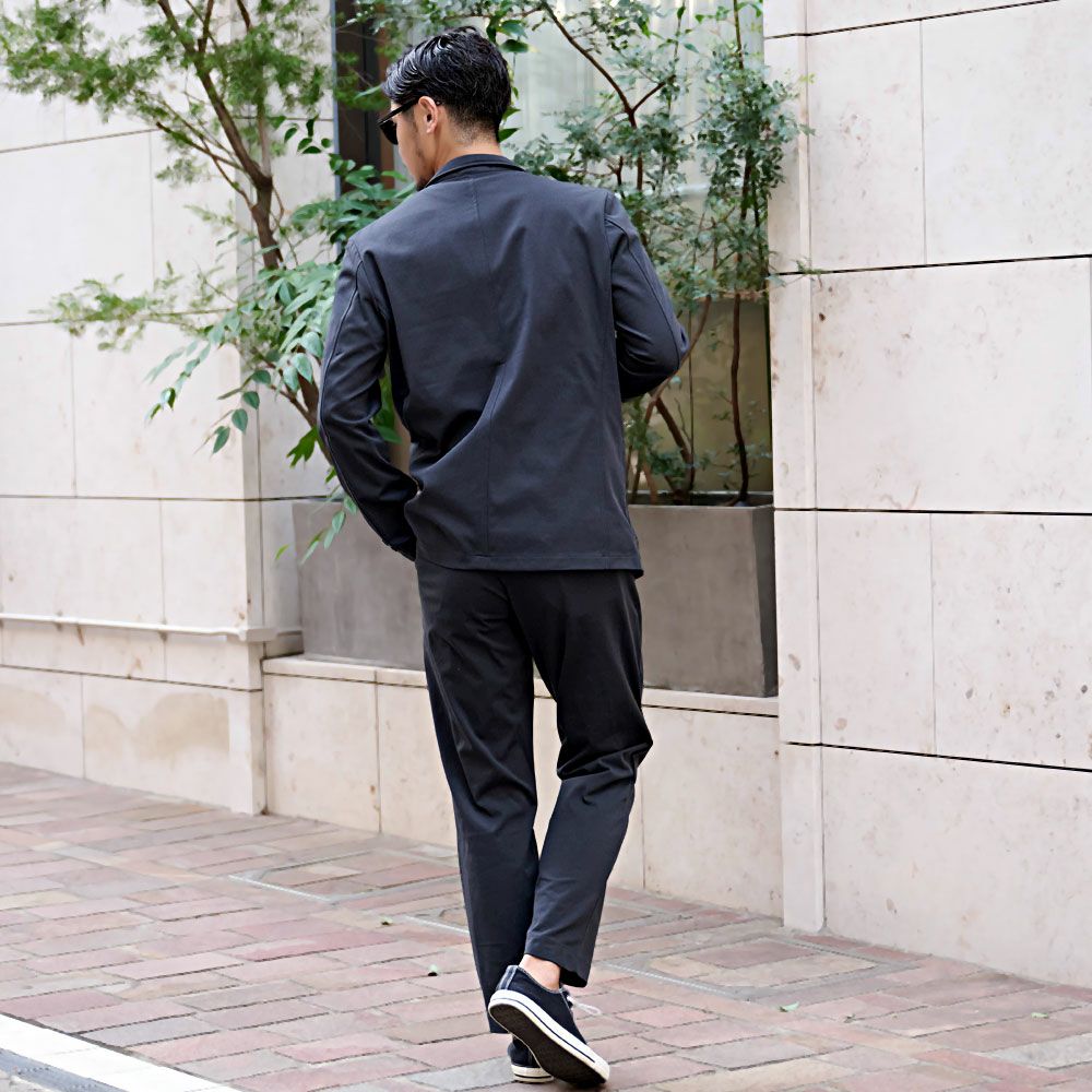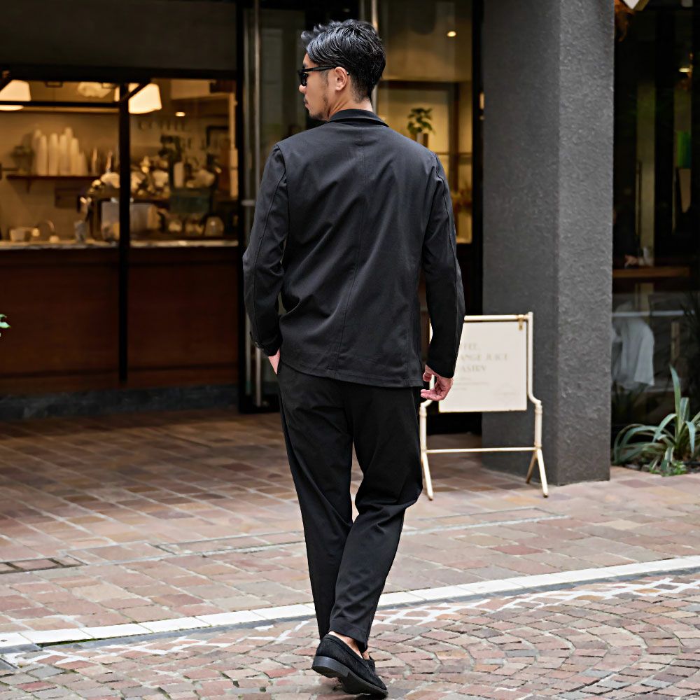 艶があり高級感溢れるストレッチ素材を使用したテーラードジャケットとテーパードパンツのセットアップ。
