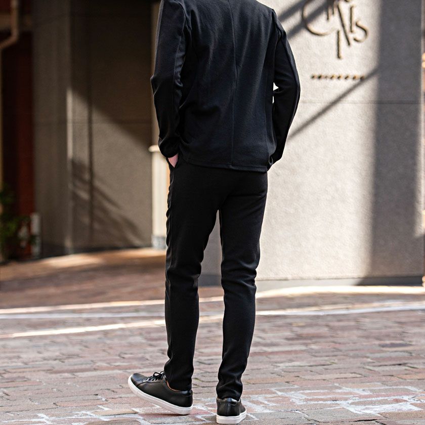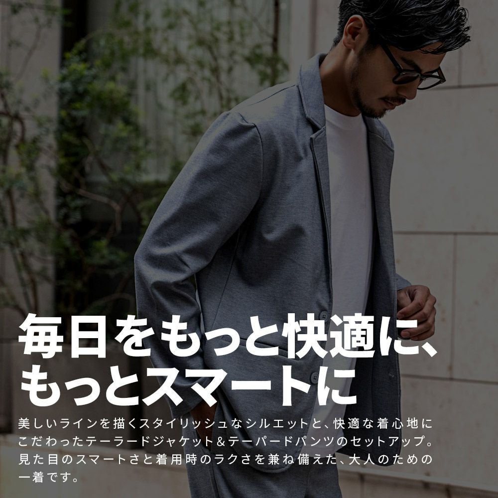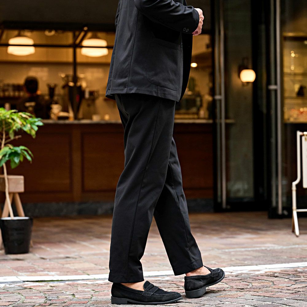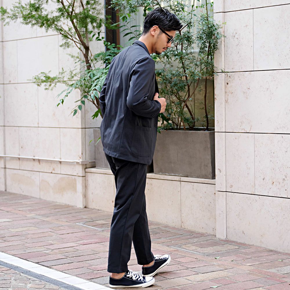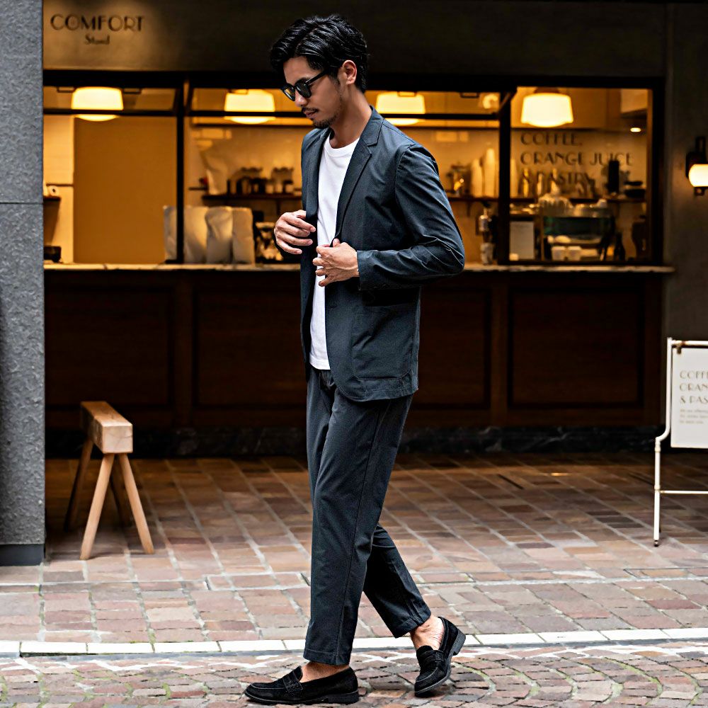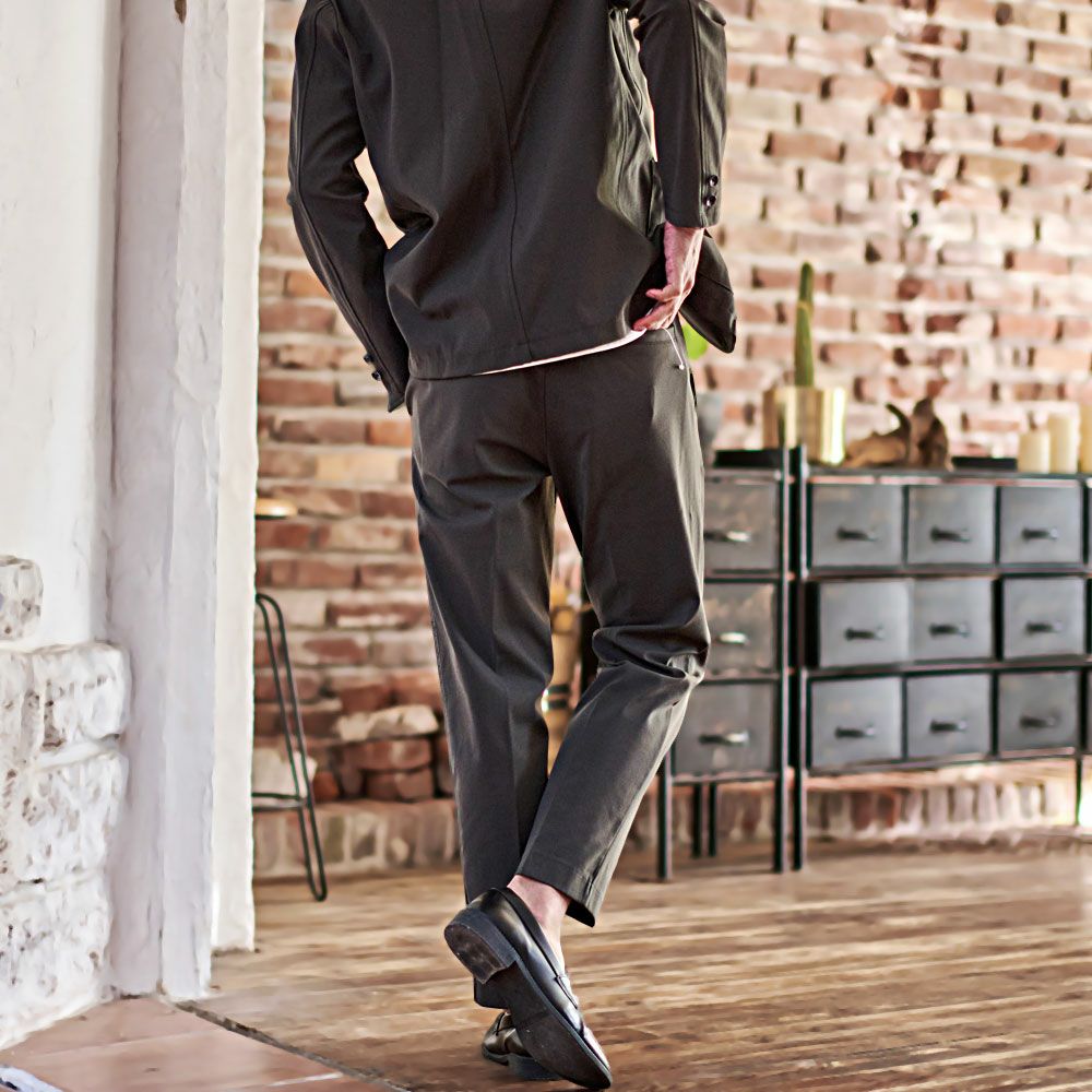 艶があり高級感溢れるストレッチ素材を使用したテーラードジャケットとテーパードパンツのセットアップ。