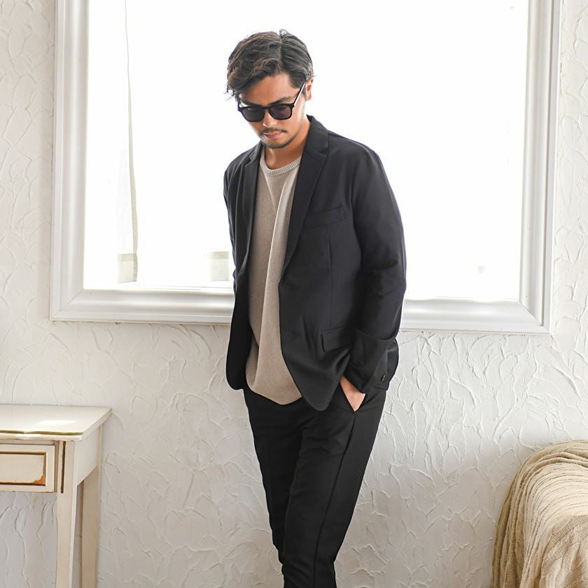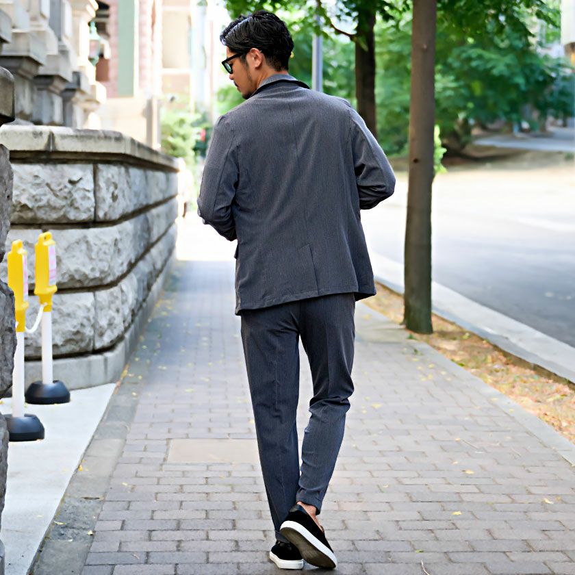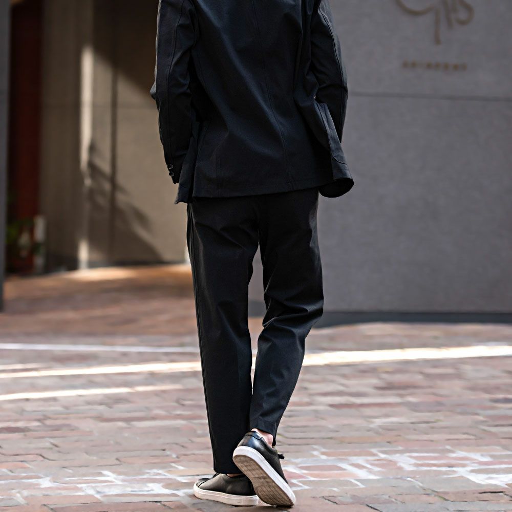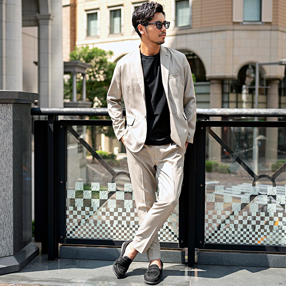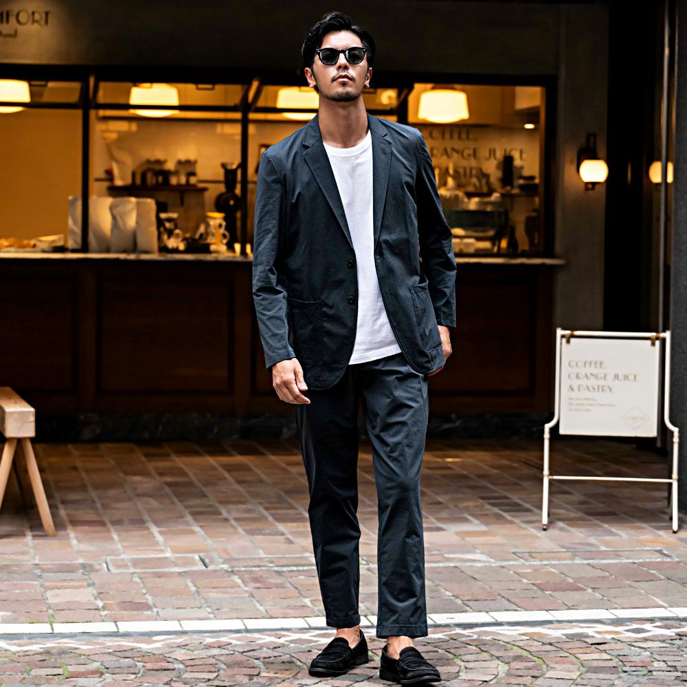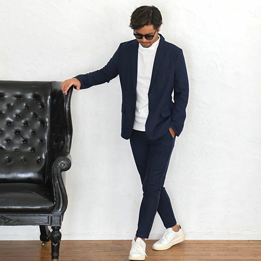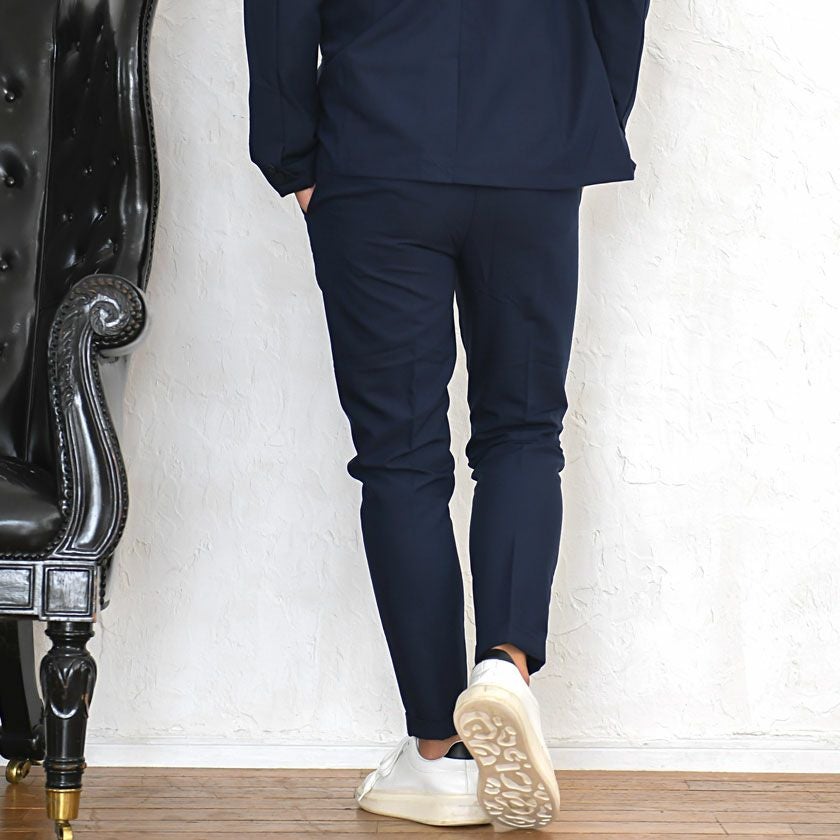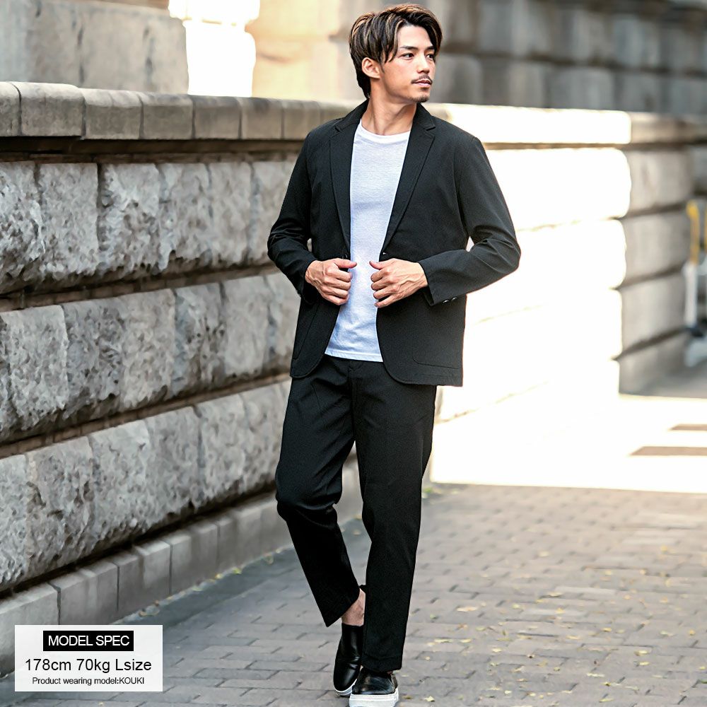 艶があり高級感溢れるストレッチ素材を使用したテーラードジャケットとテーパードパンツのセットアップ。