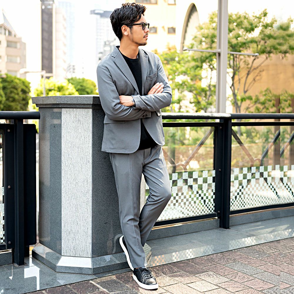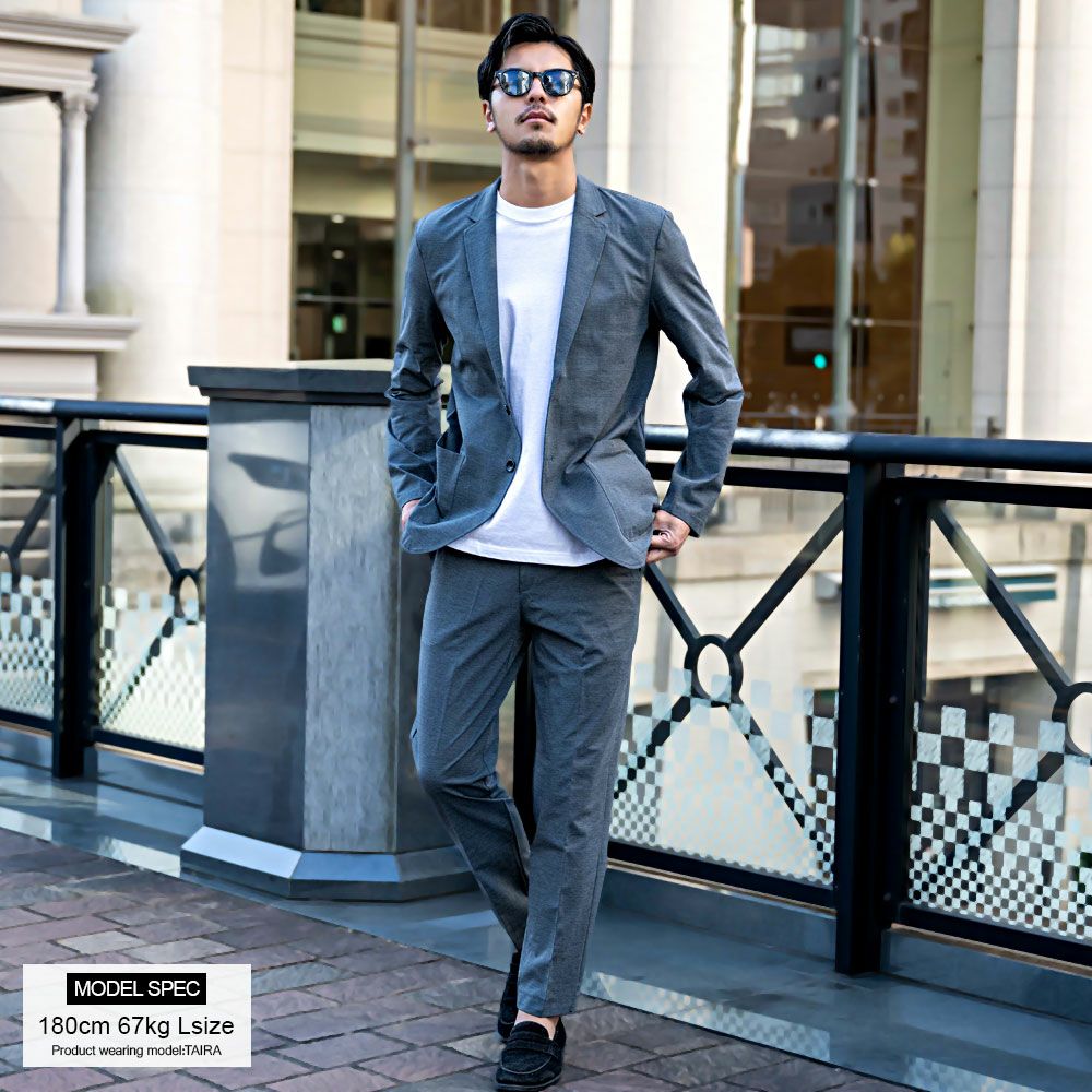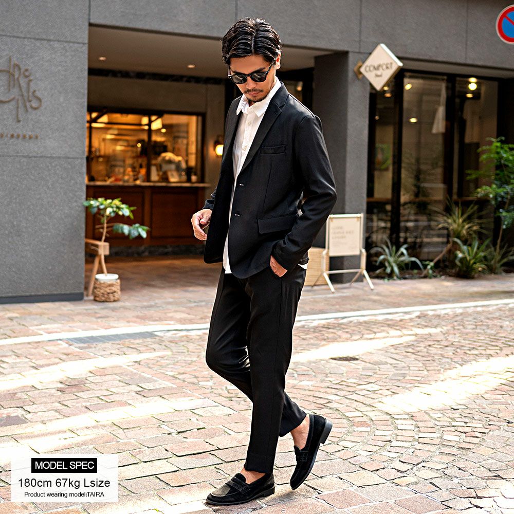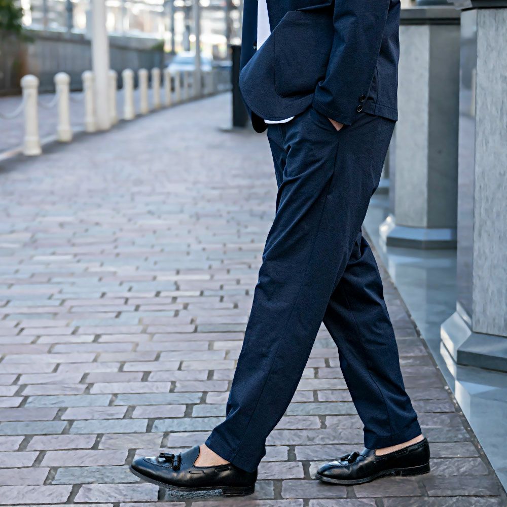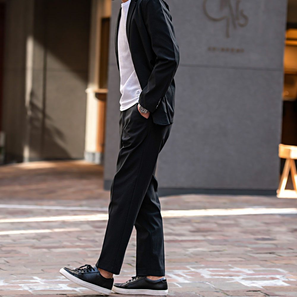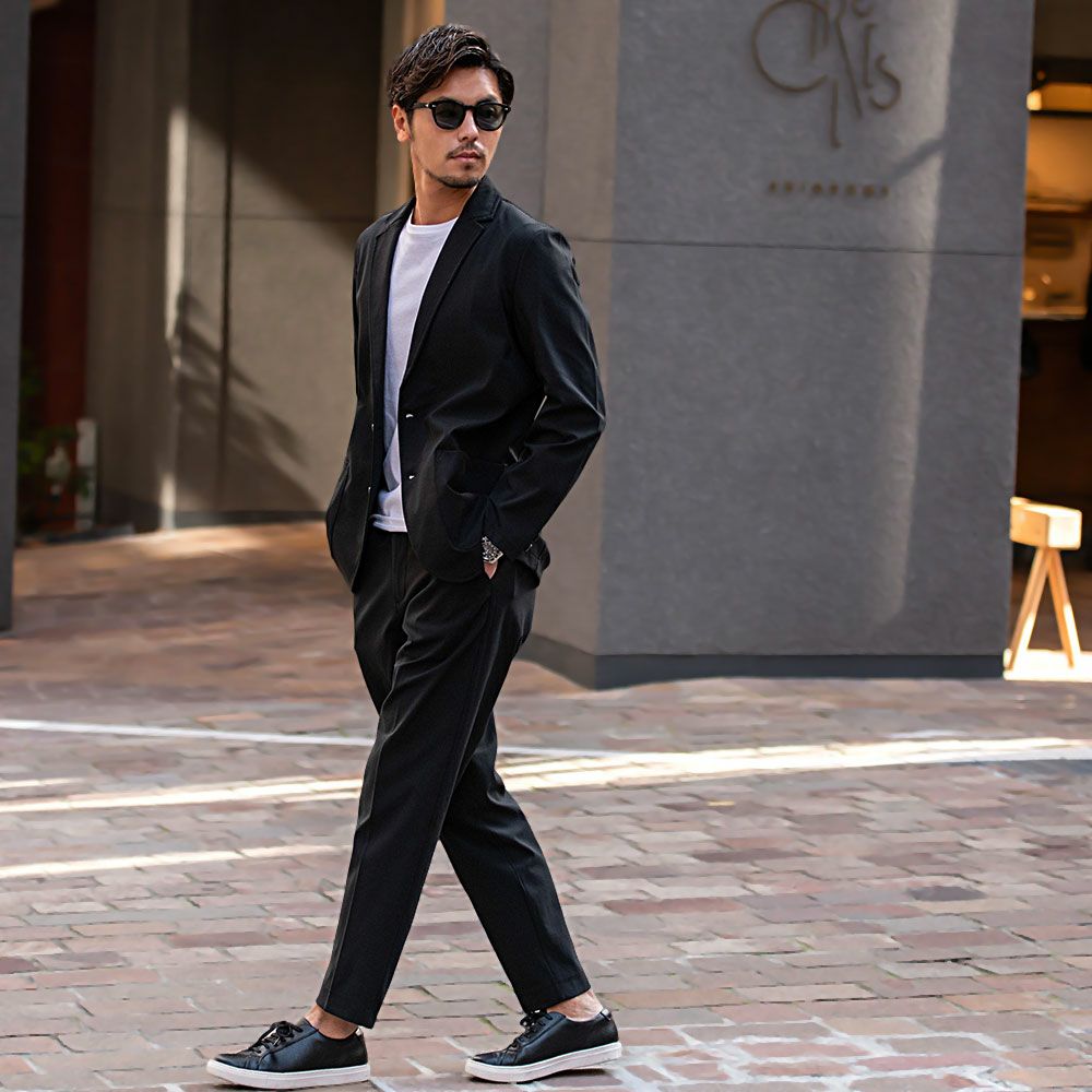 艶があり高級感溢れるストレッチ素材を使用したテーラードジャケットとテーパードパンツのセットアップ。
