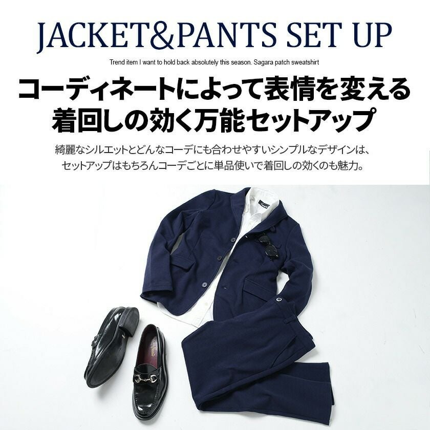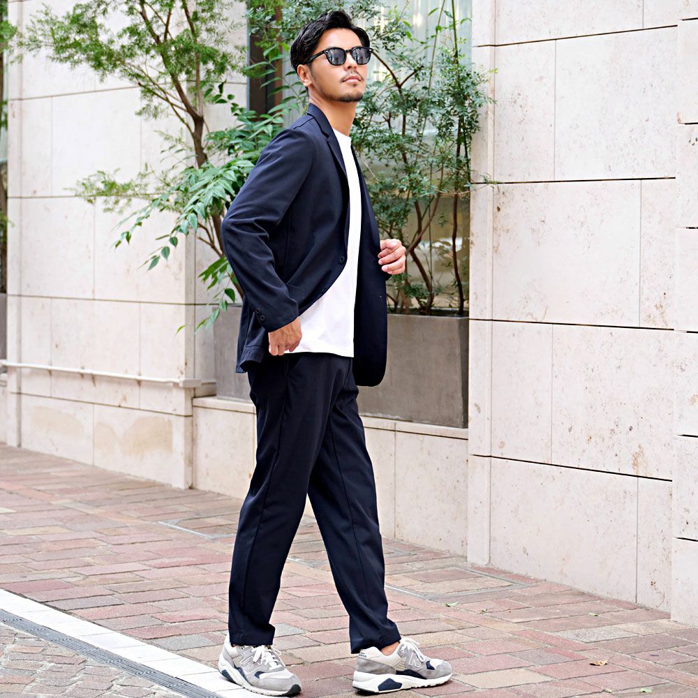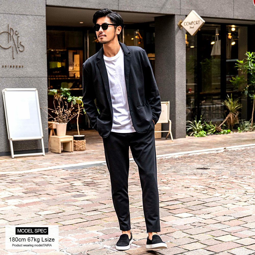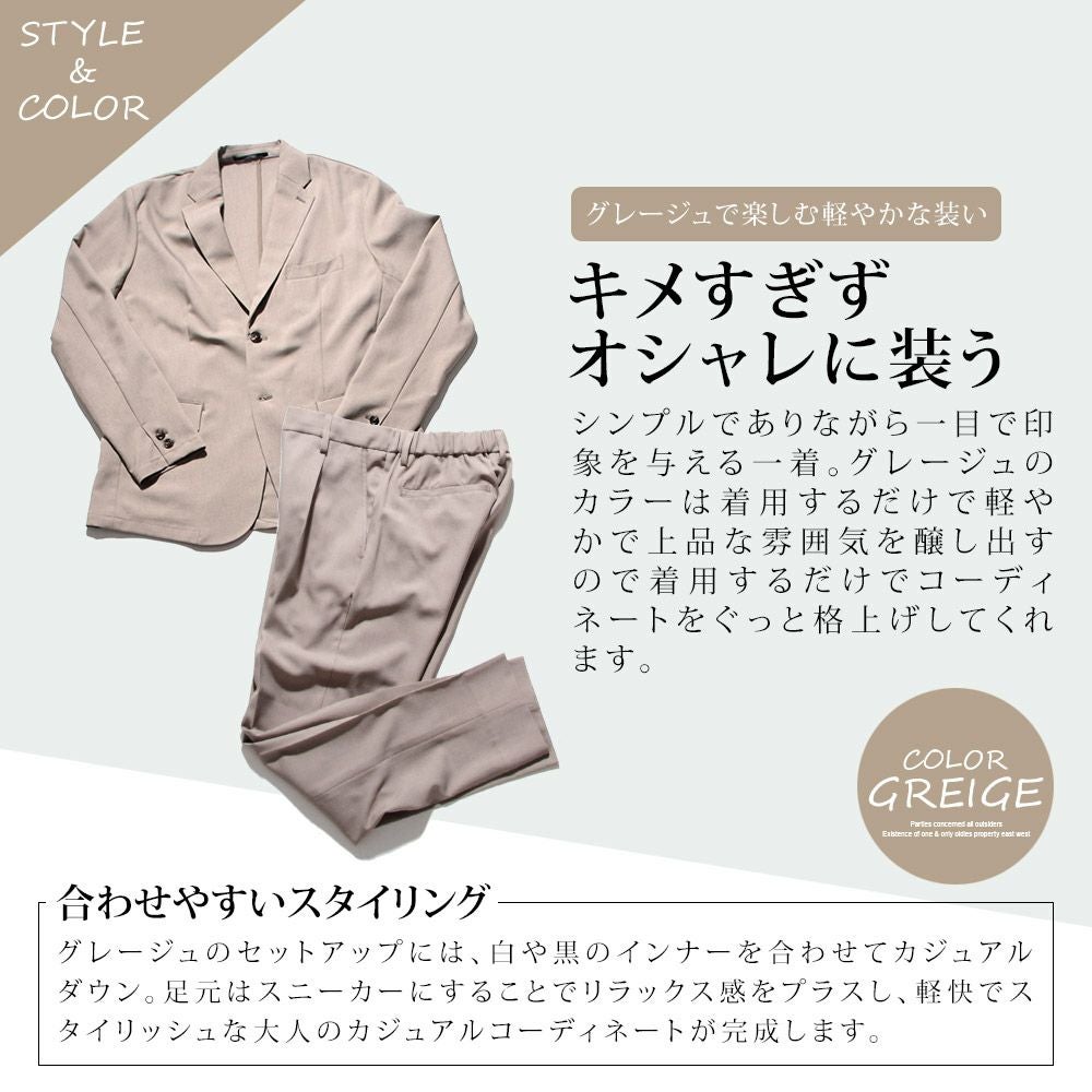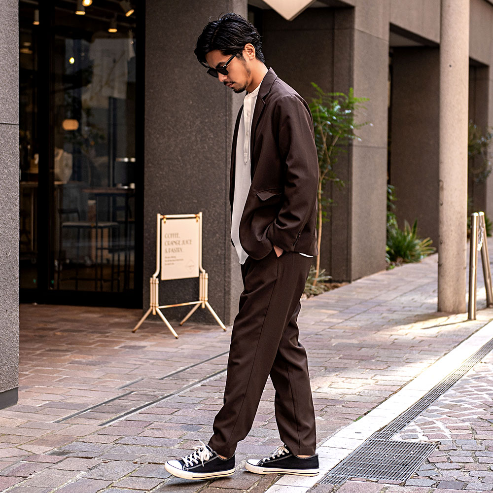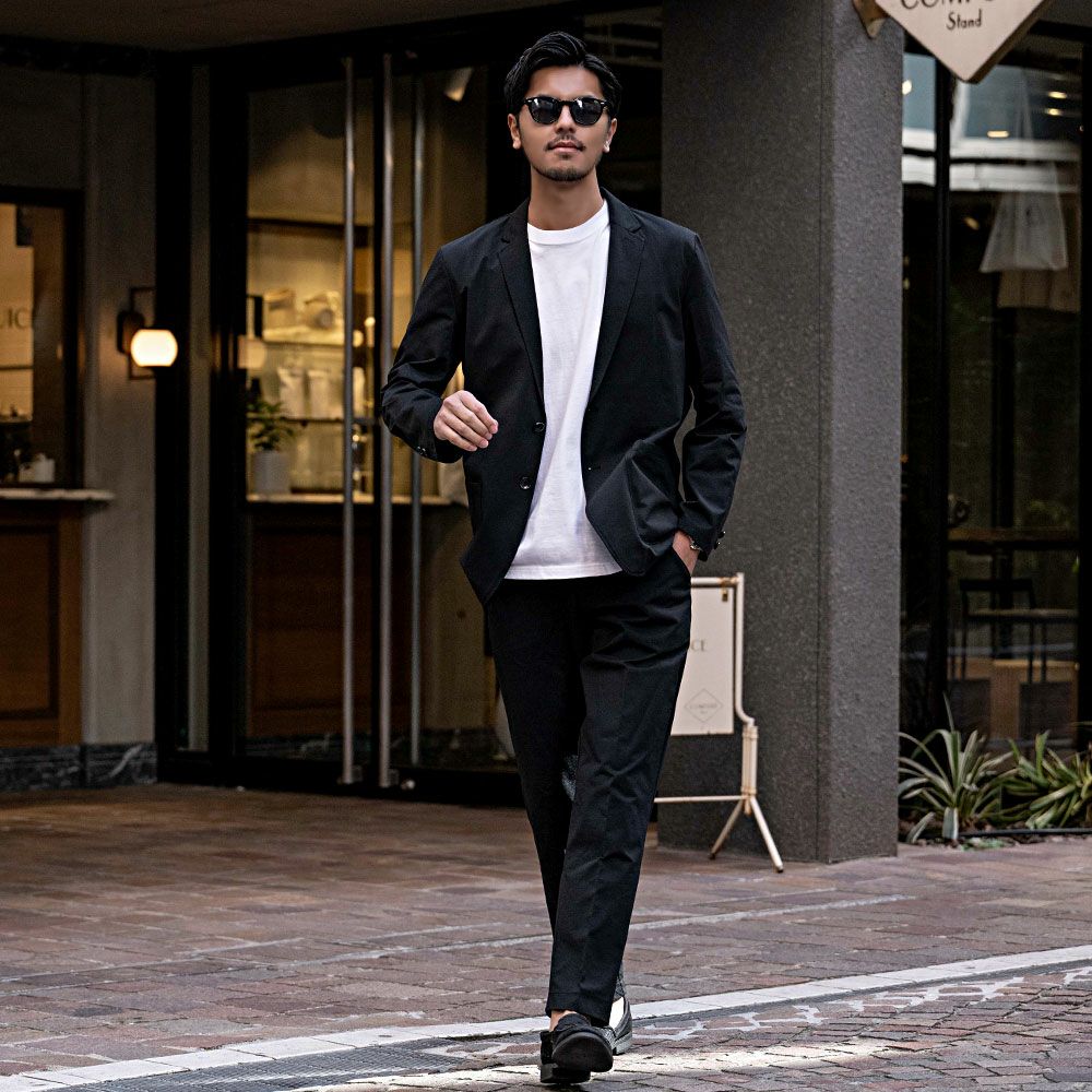 艶があり高級感溢れるストレッチ素材を使用したテーラードジャケットとテーパードパンツのセットアップ。
