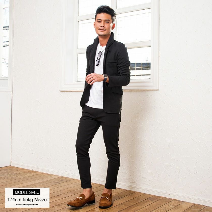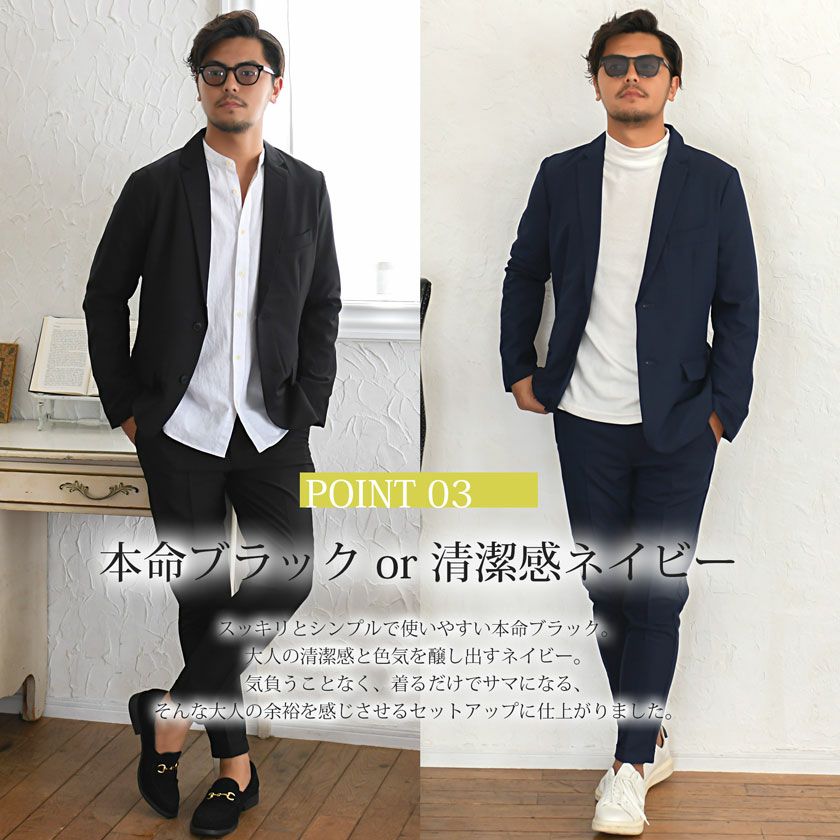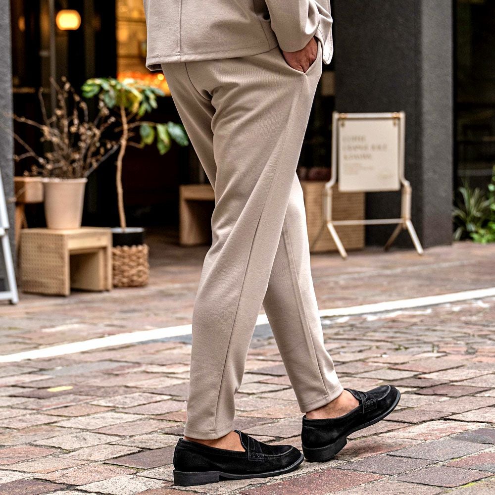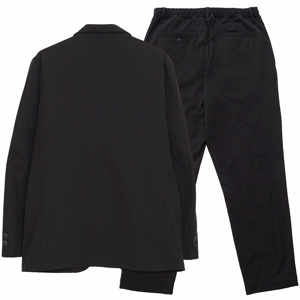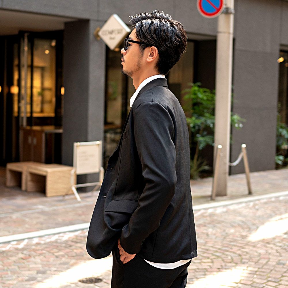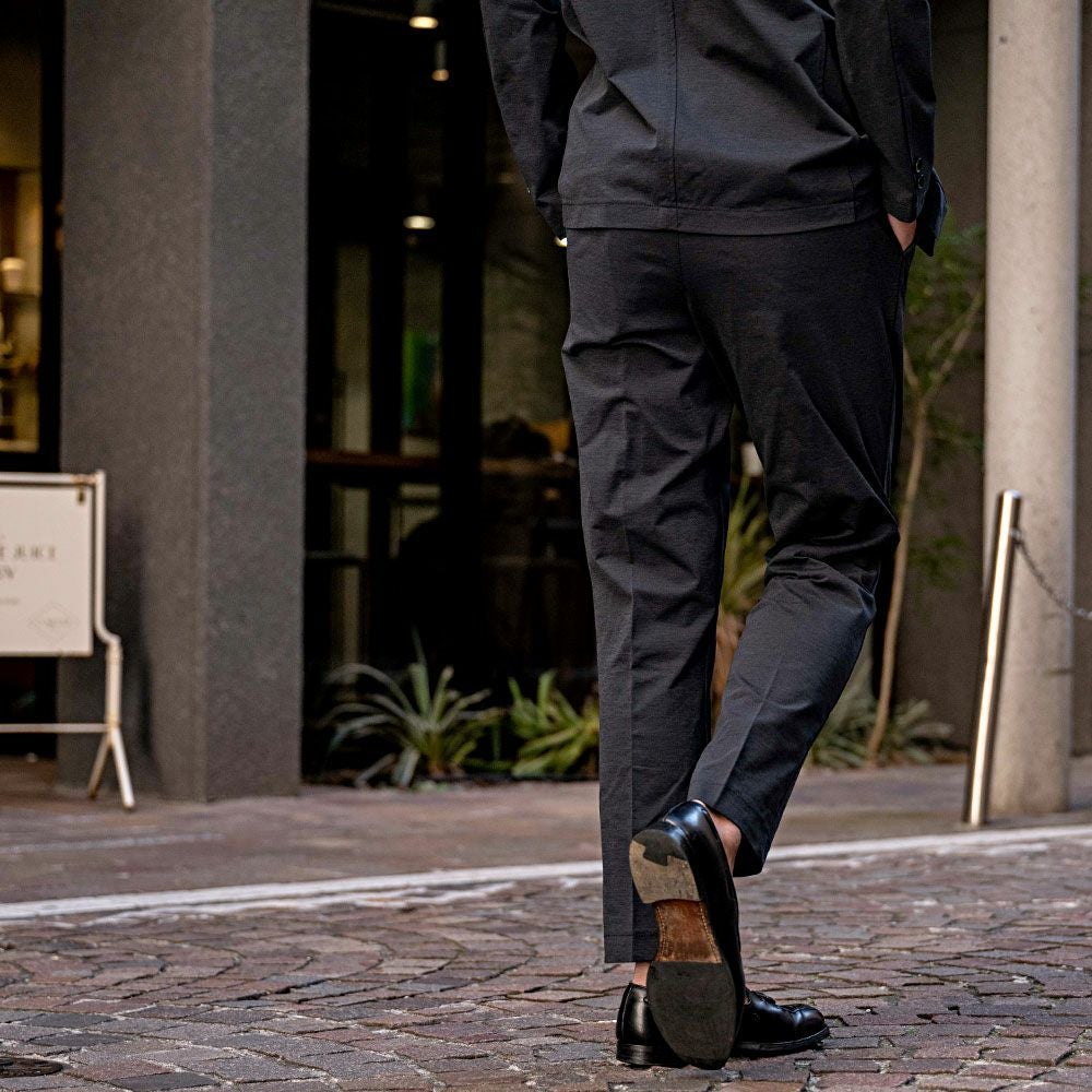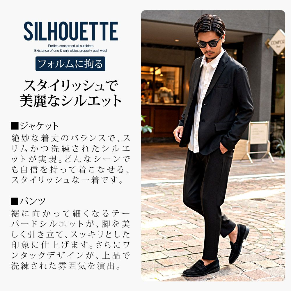 艶があり高級感溢れるストレッチ素材を使用したテーラードジャケットとテーパードパンツのセットアップ。