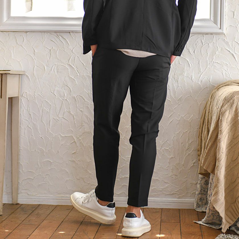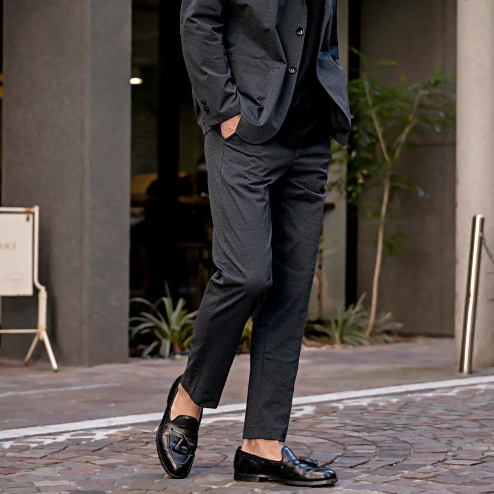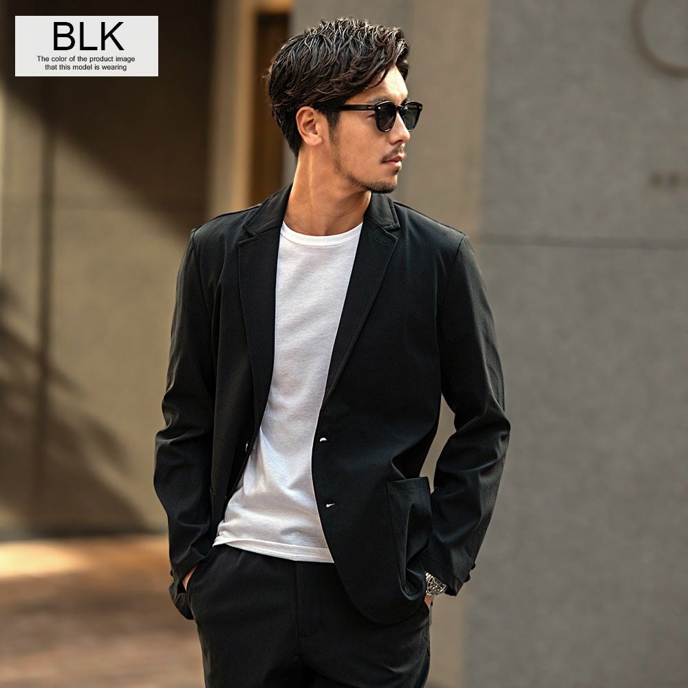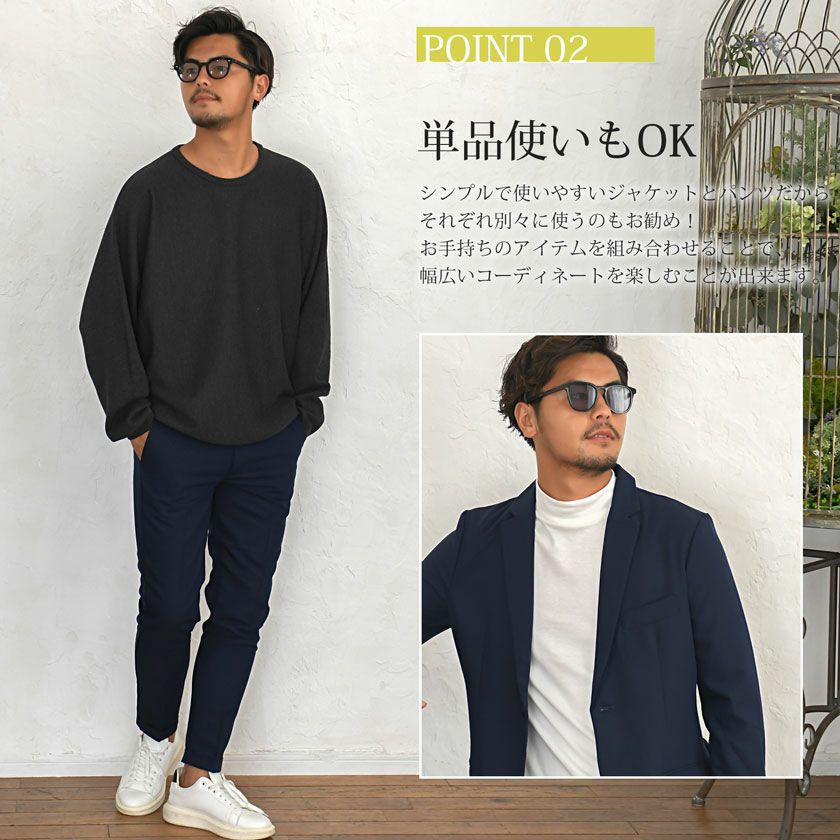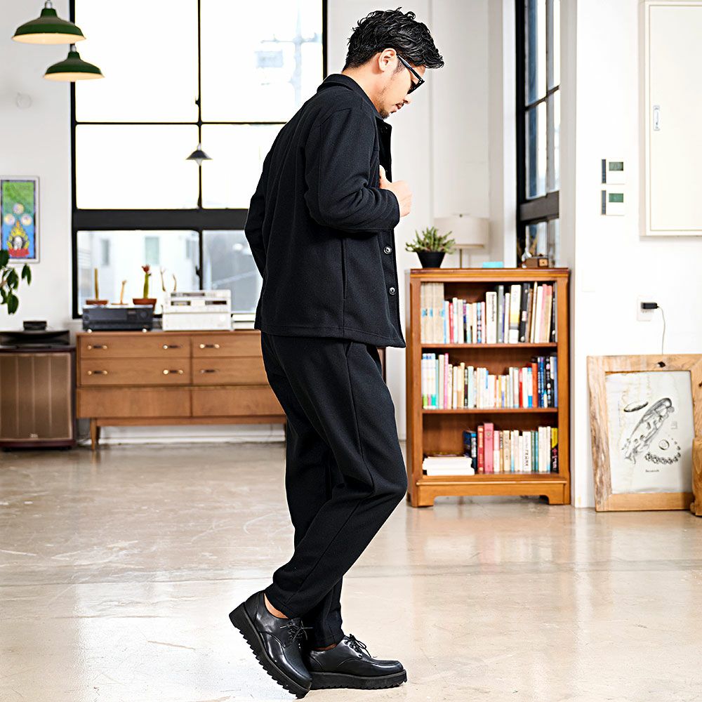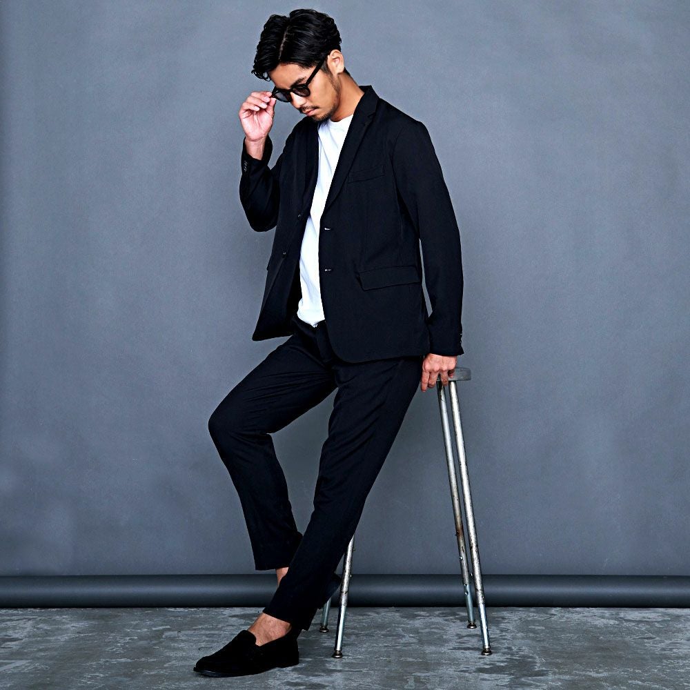 艶があり高級感溢れるストレッチ素材を使用したテーラードジャケットとテーパードパンツのセットアップ。