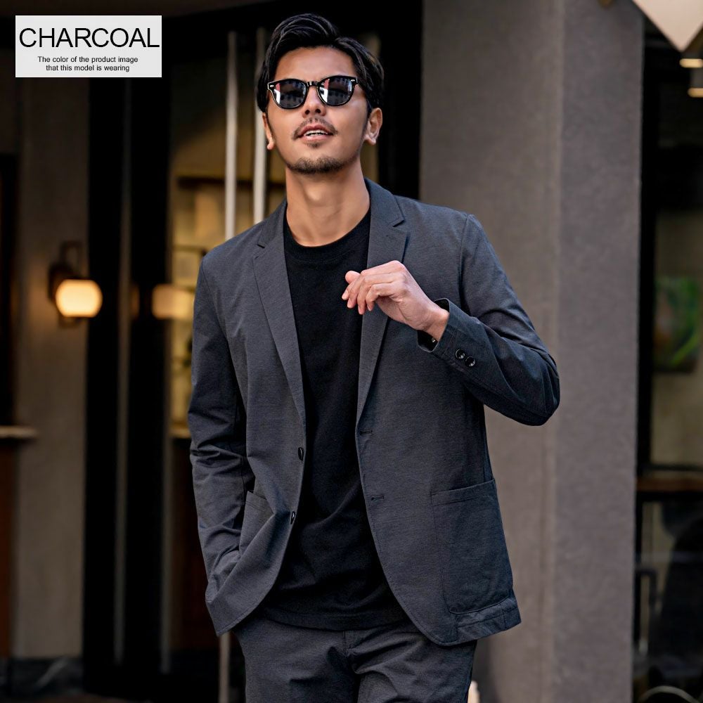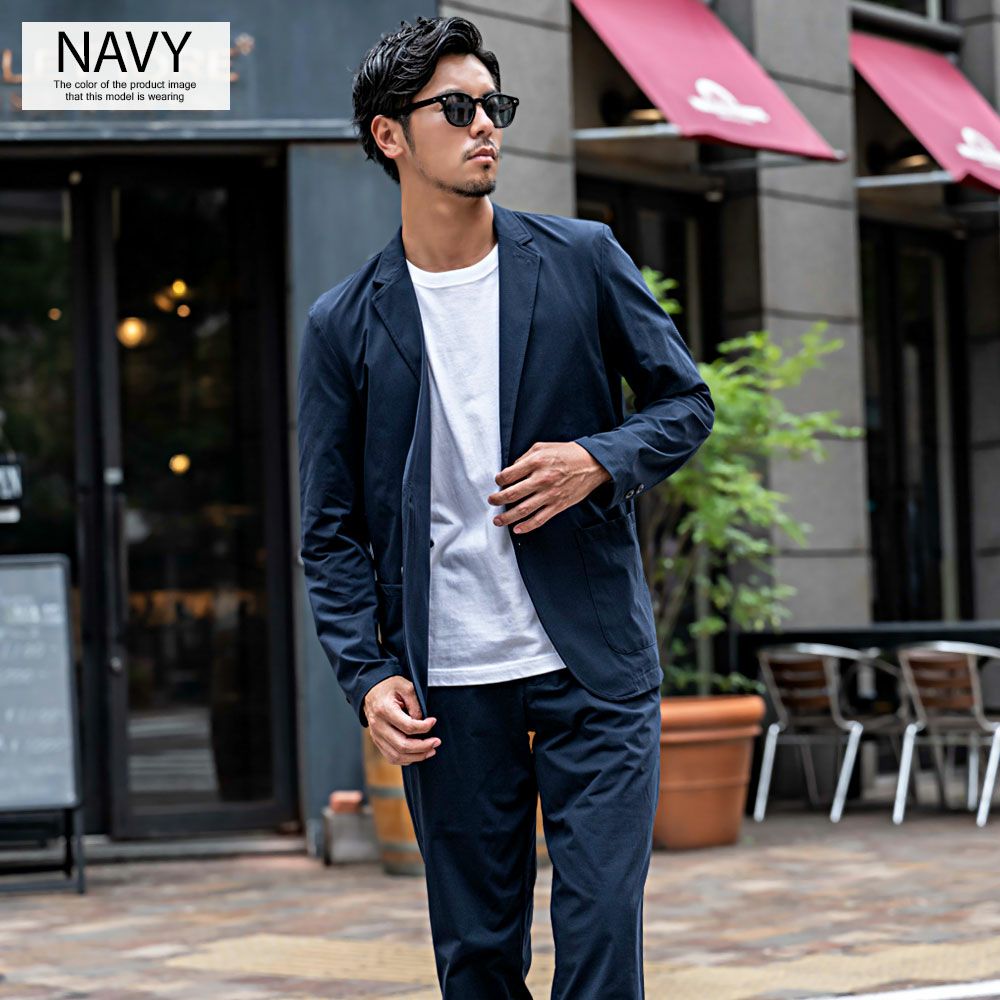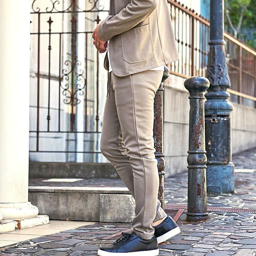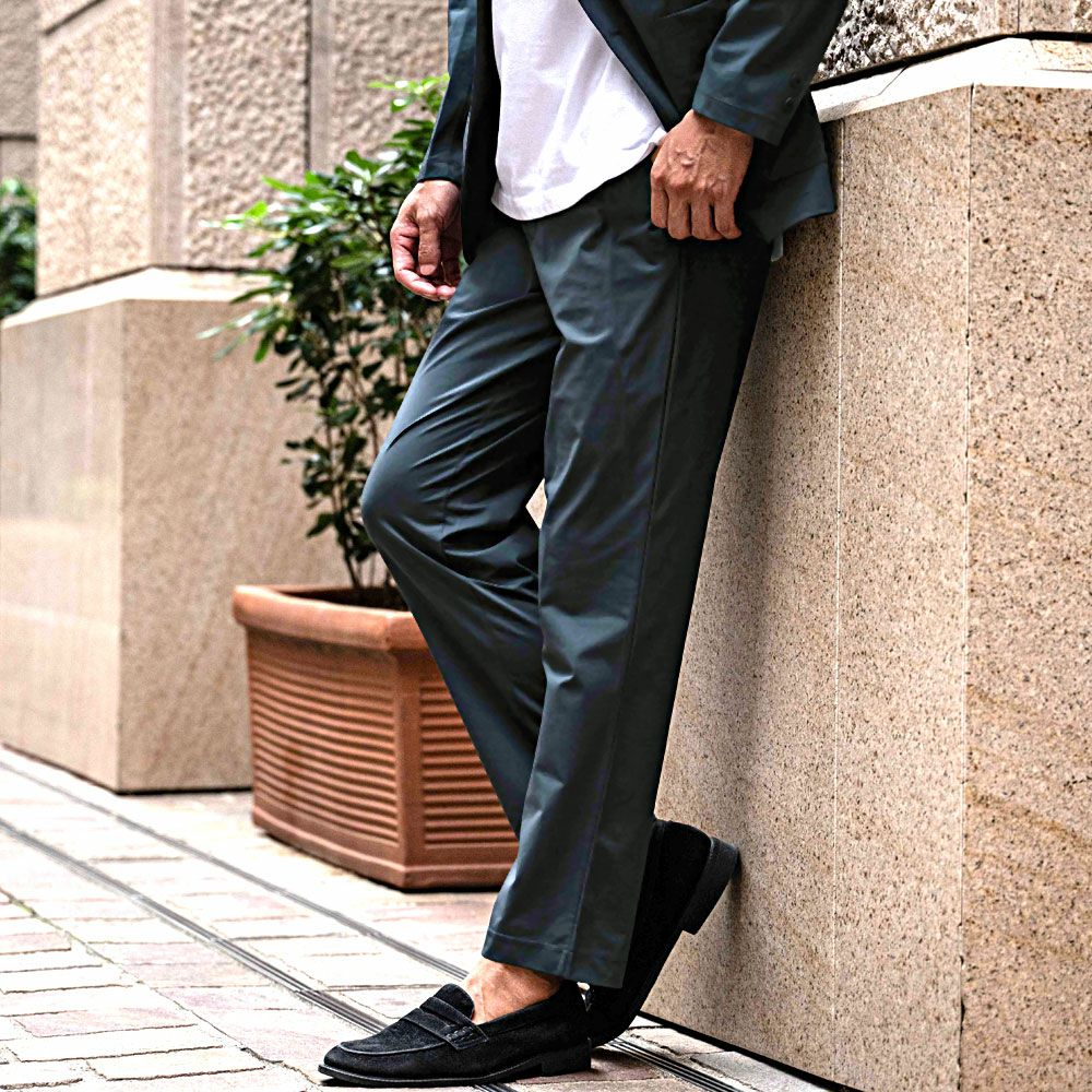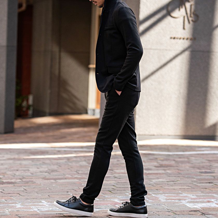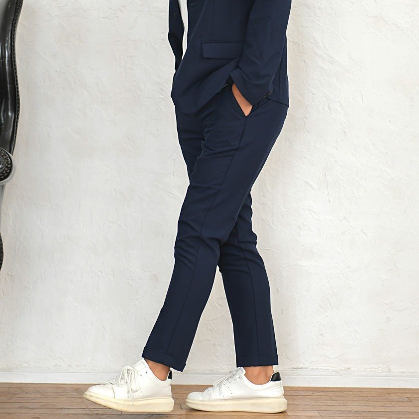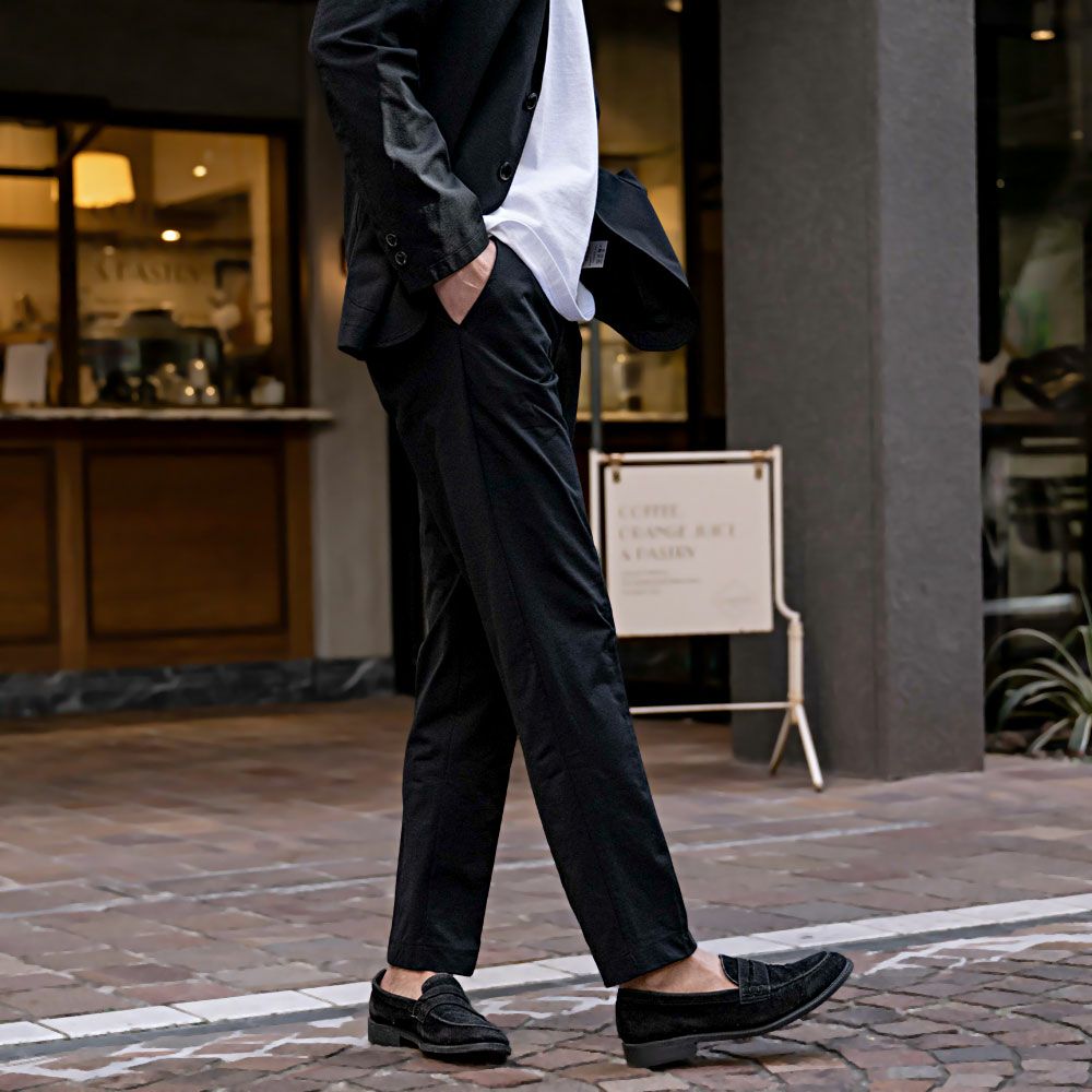 艶があり高級感溢れるストレッチ素材を使用したテーラードジャケットとテーパードパンツのセットアップ。