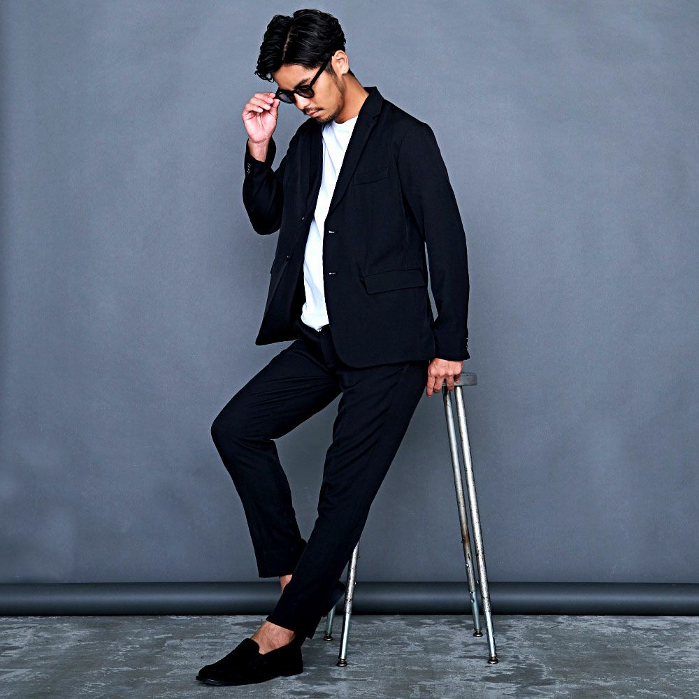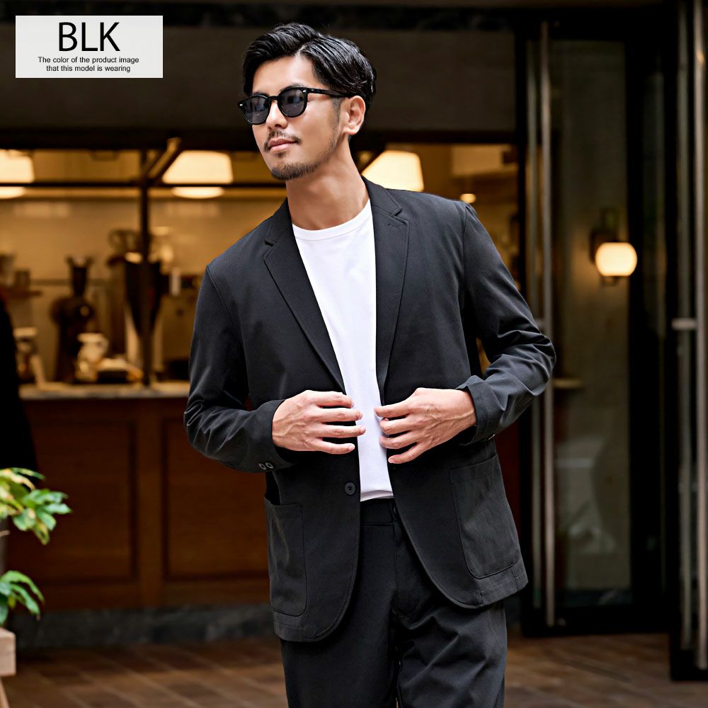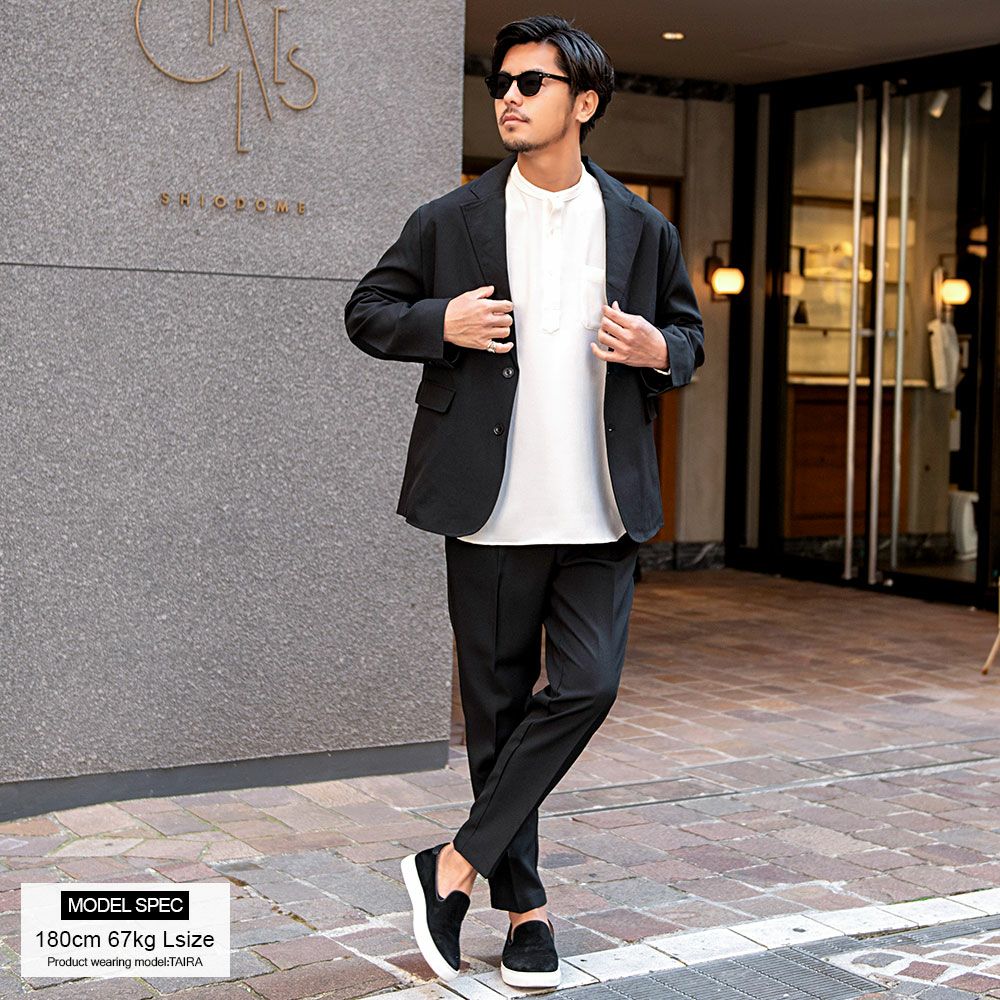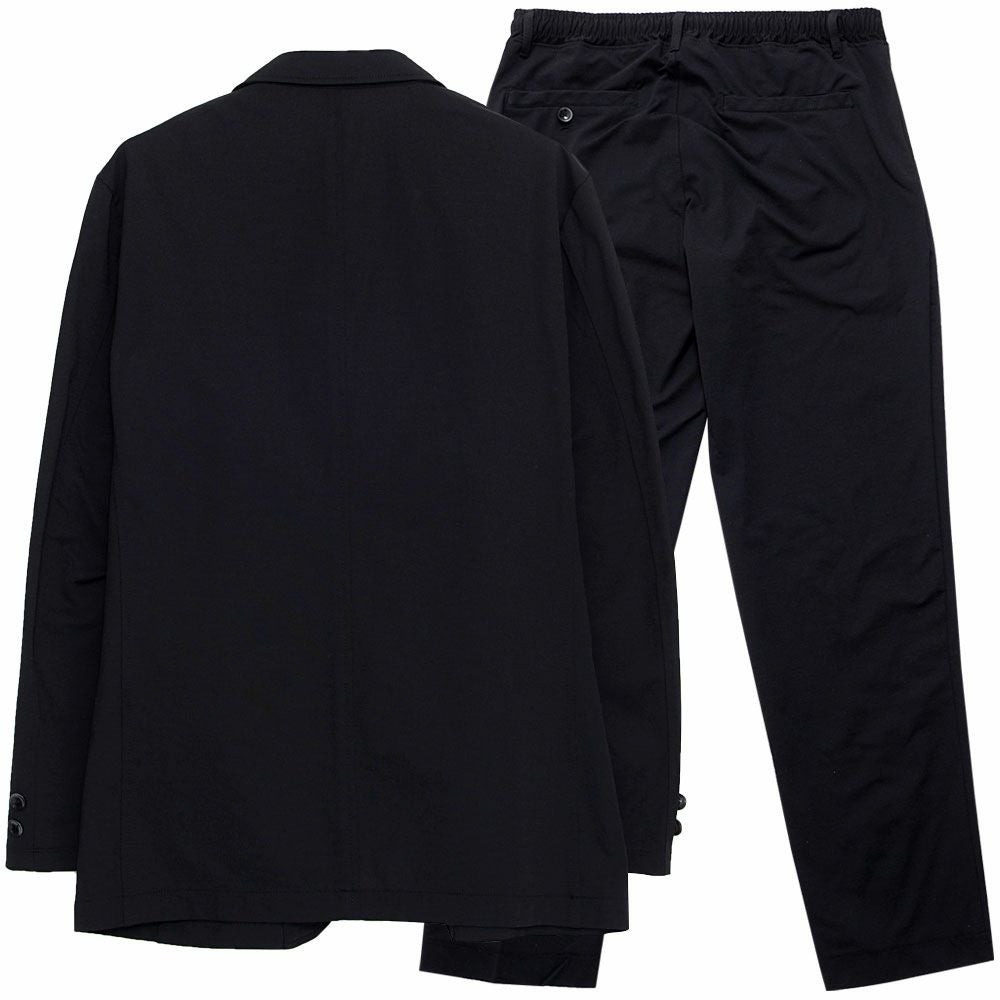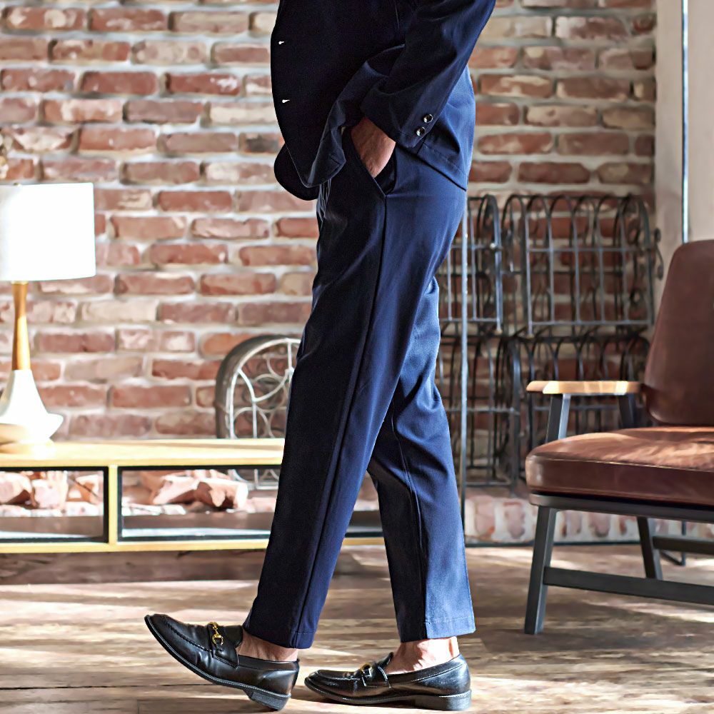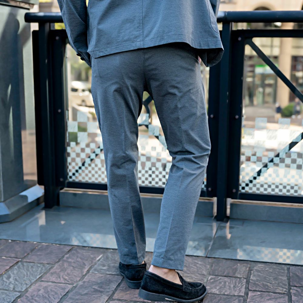 艶があり高級感溢れるストレッチ素材を使用したテーラードジャケットとテーパードパンツのセットアップ。