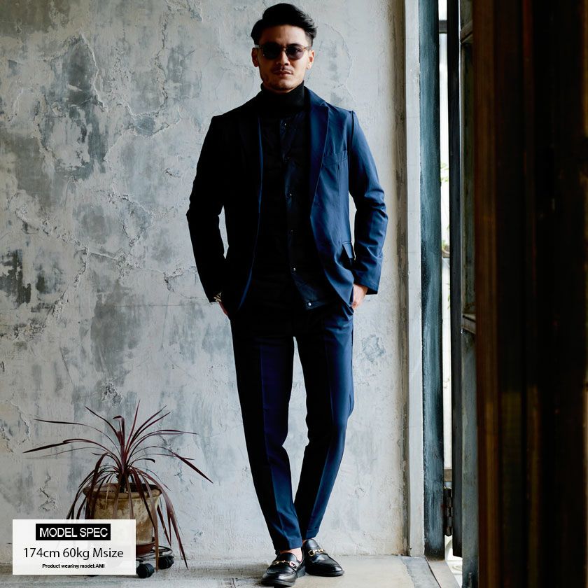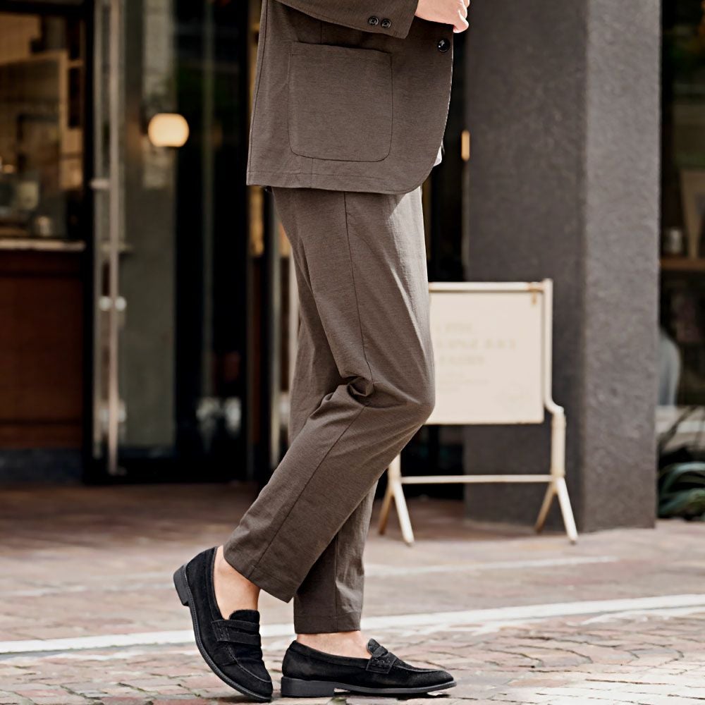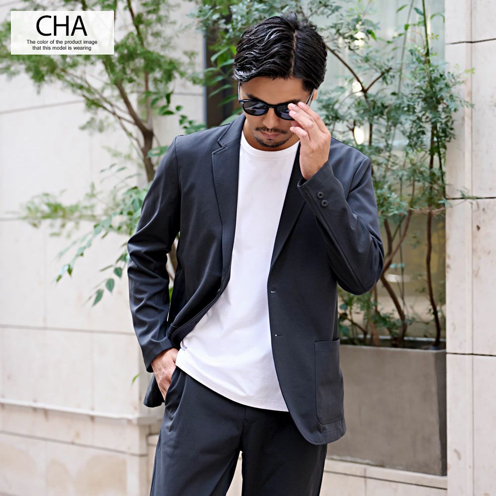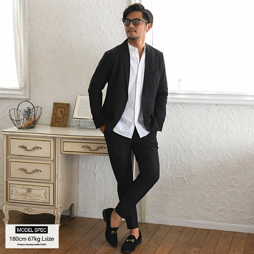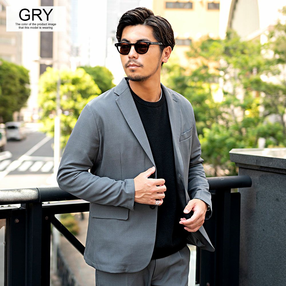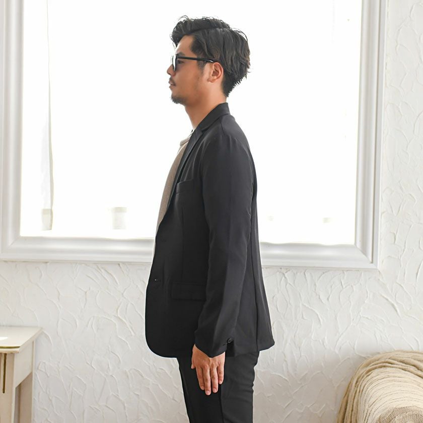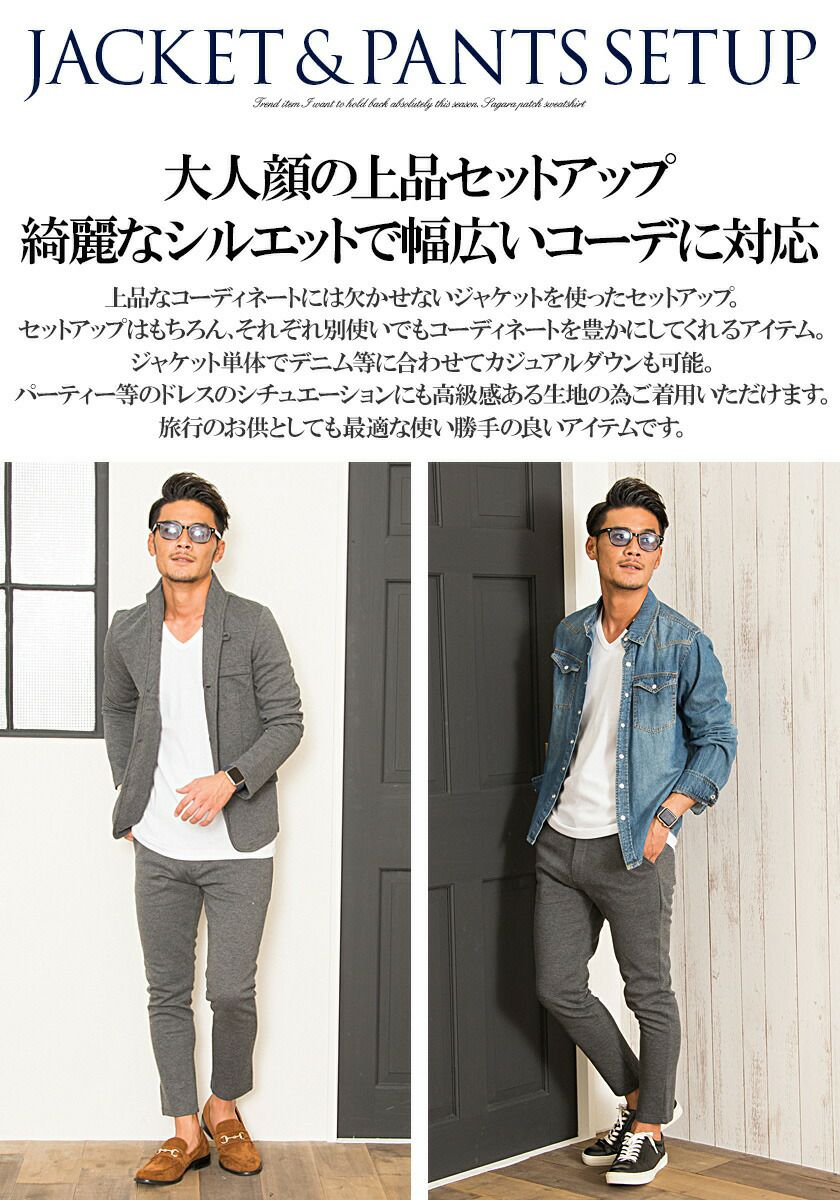 艶があり高級感溢れるストレッチ素材を使用したテーラードジャケットとテーパードパンツのセットアップ。