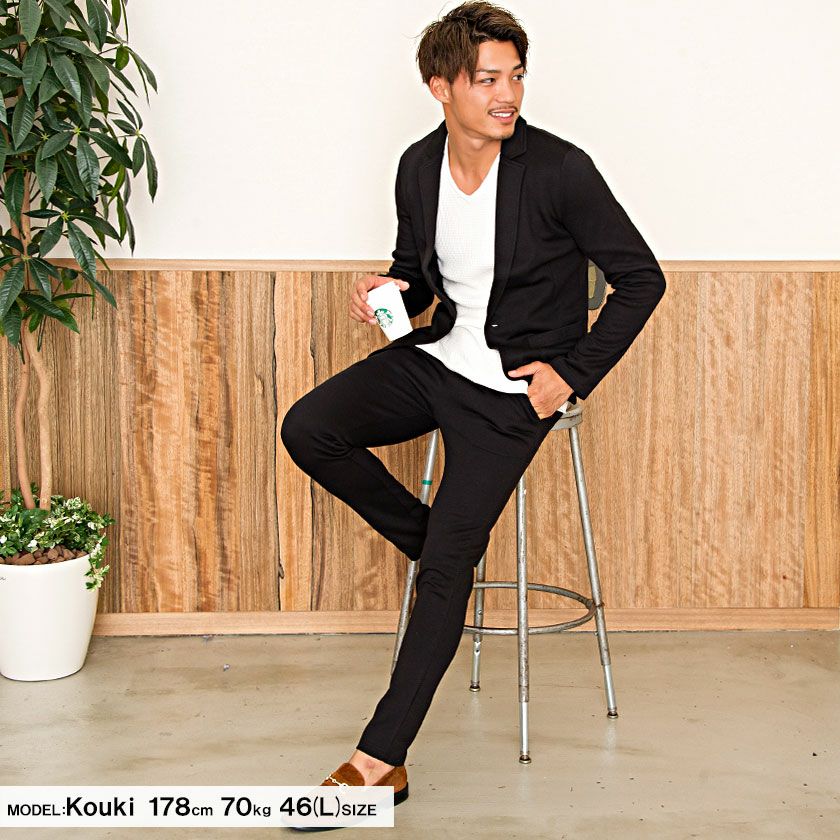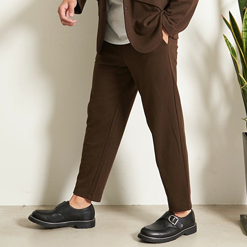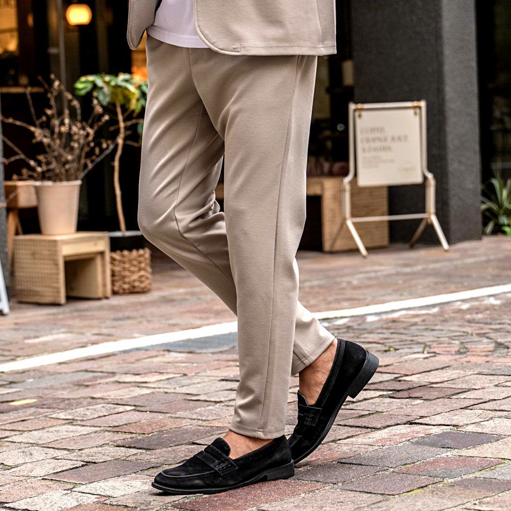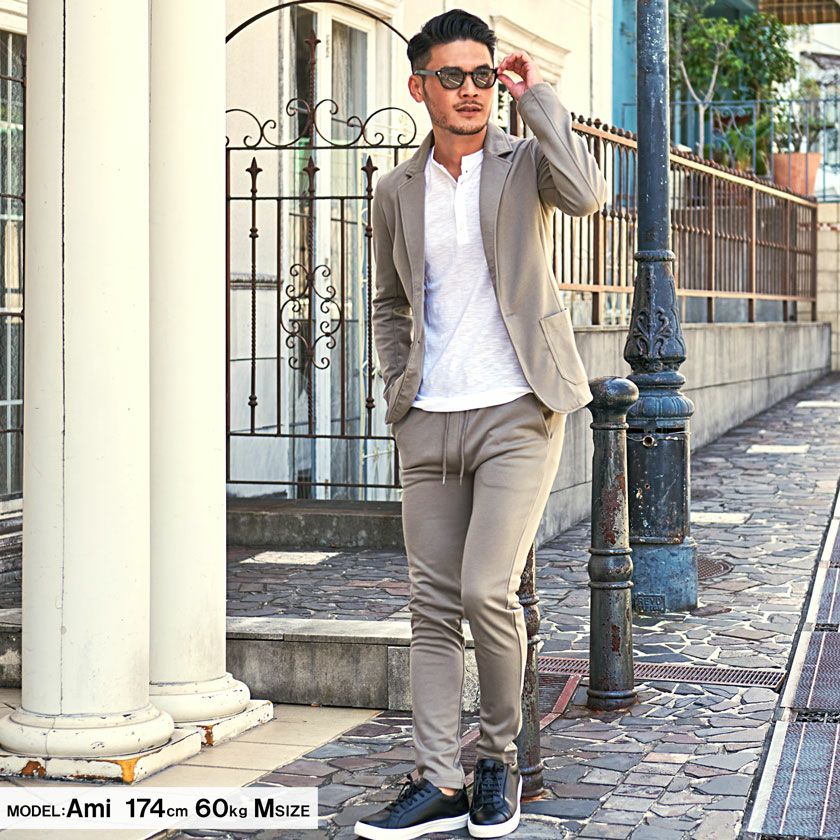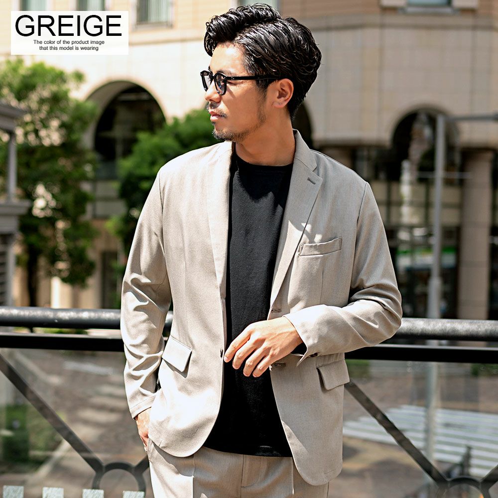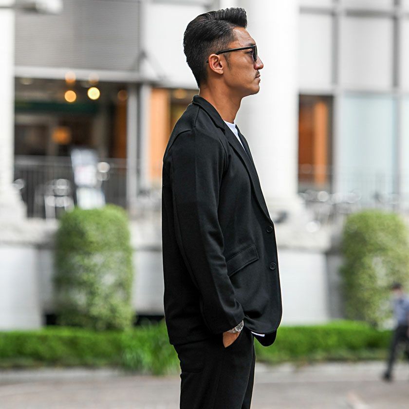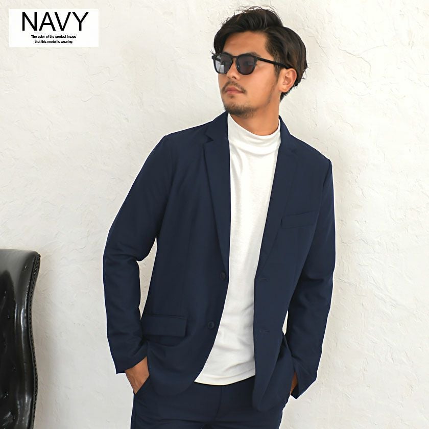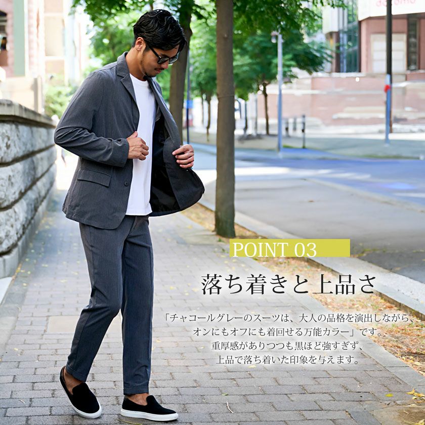 艶があり高級感溢れるストレッチ素材を使用したテーラードジャケットとテーパードパンツのセットアップ。
