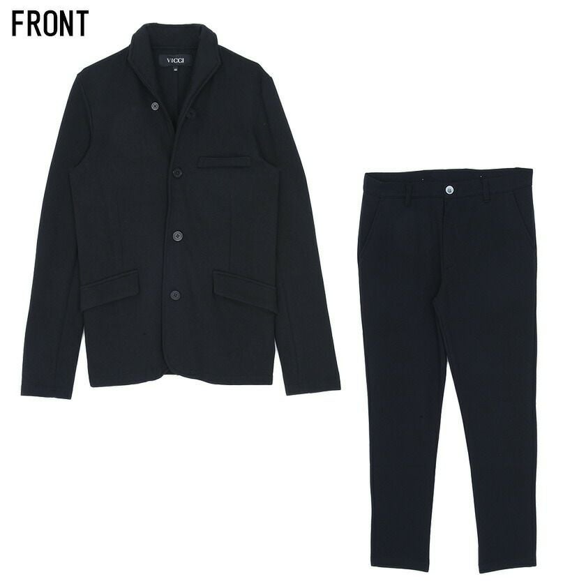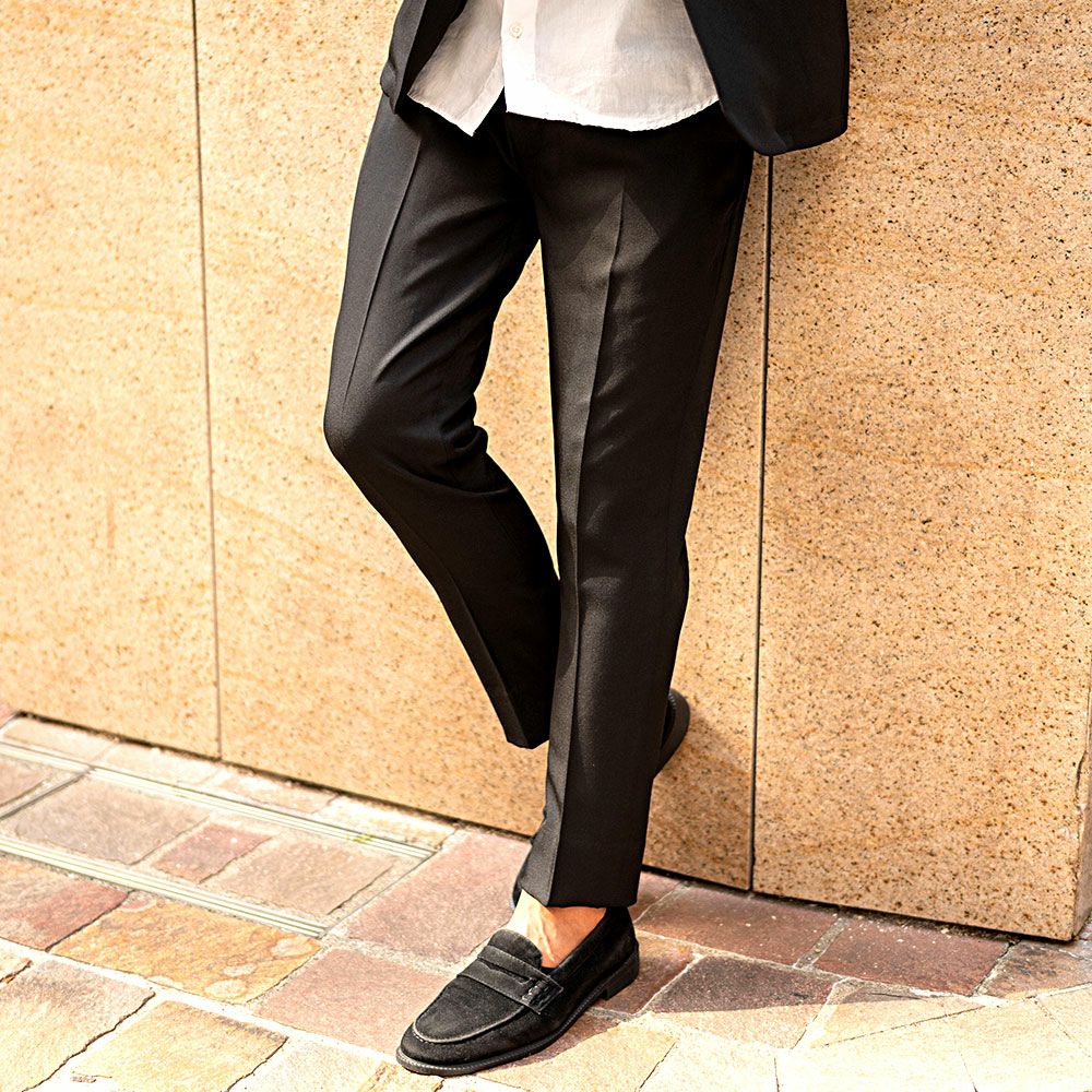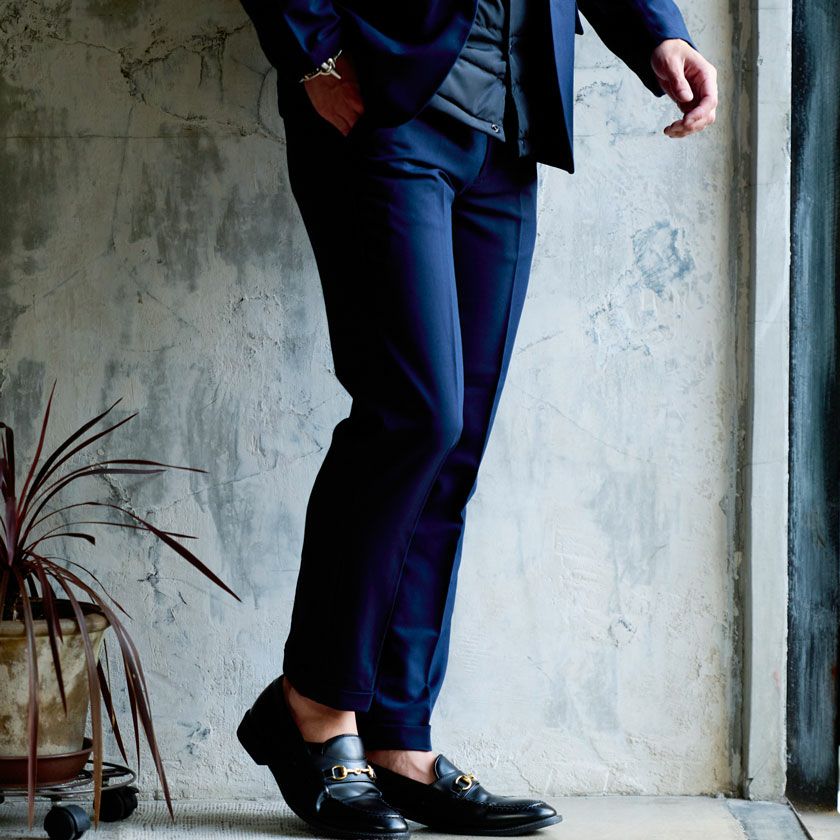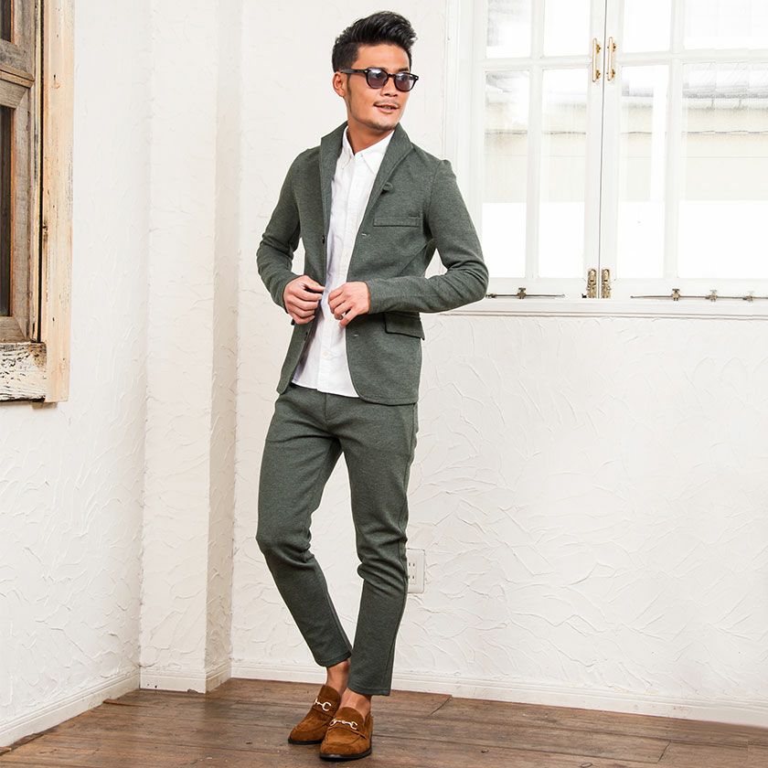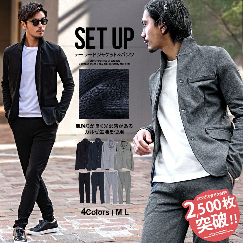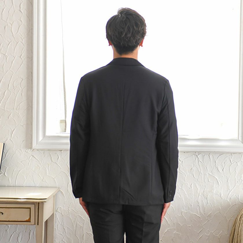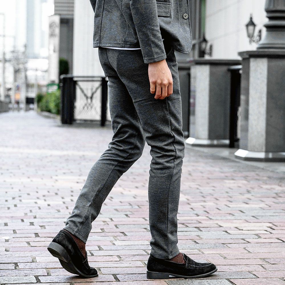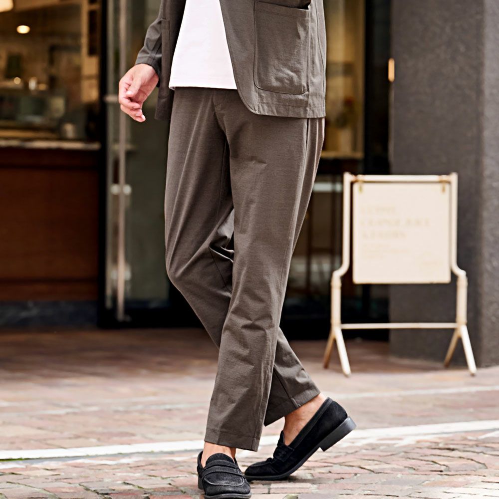 艶があり高級感溢れるストレッチ素材を使用したテーラードジャケットとテーパードパンツのセットアップ。