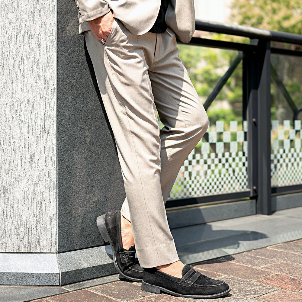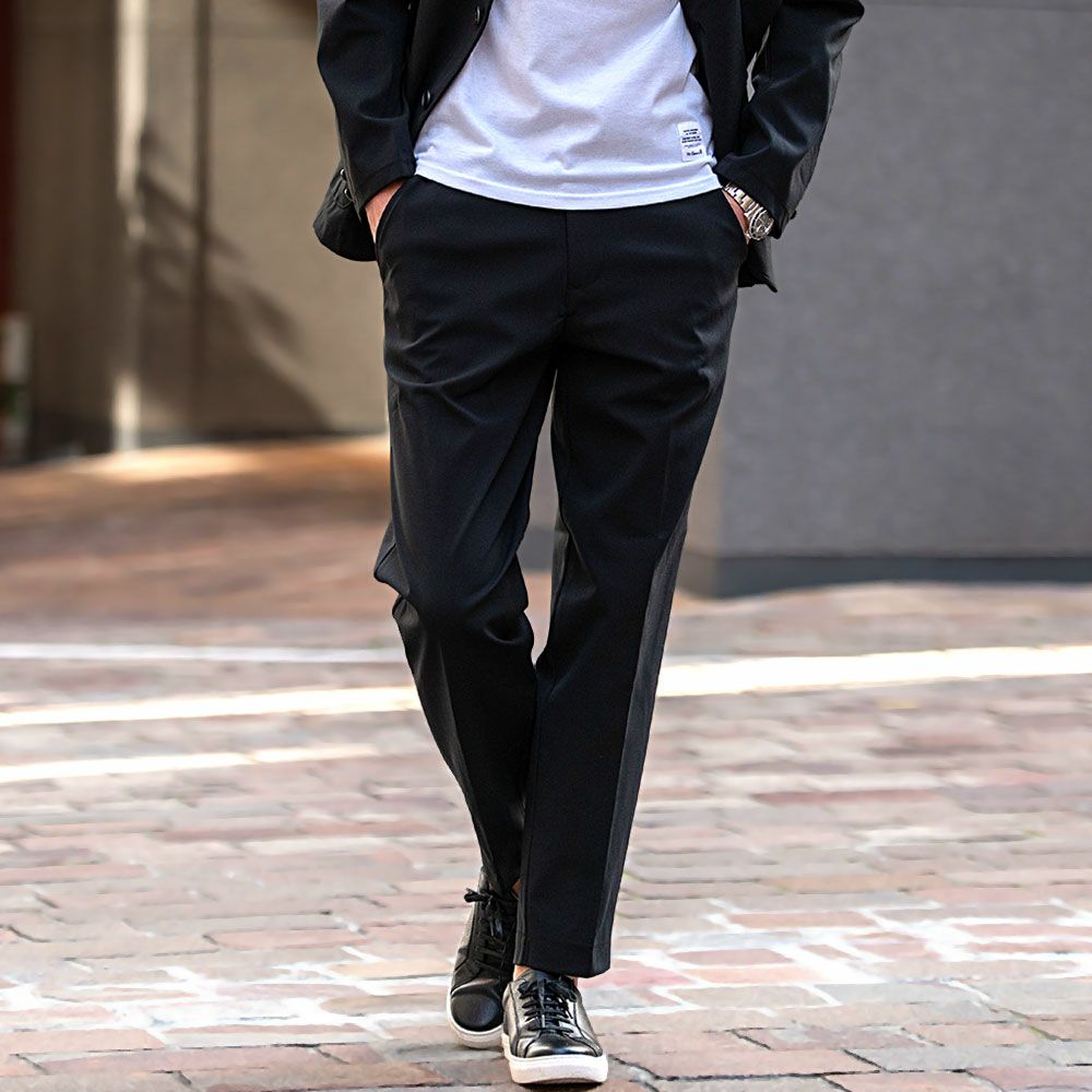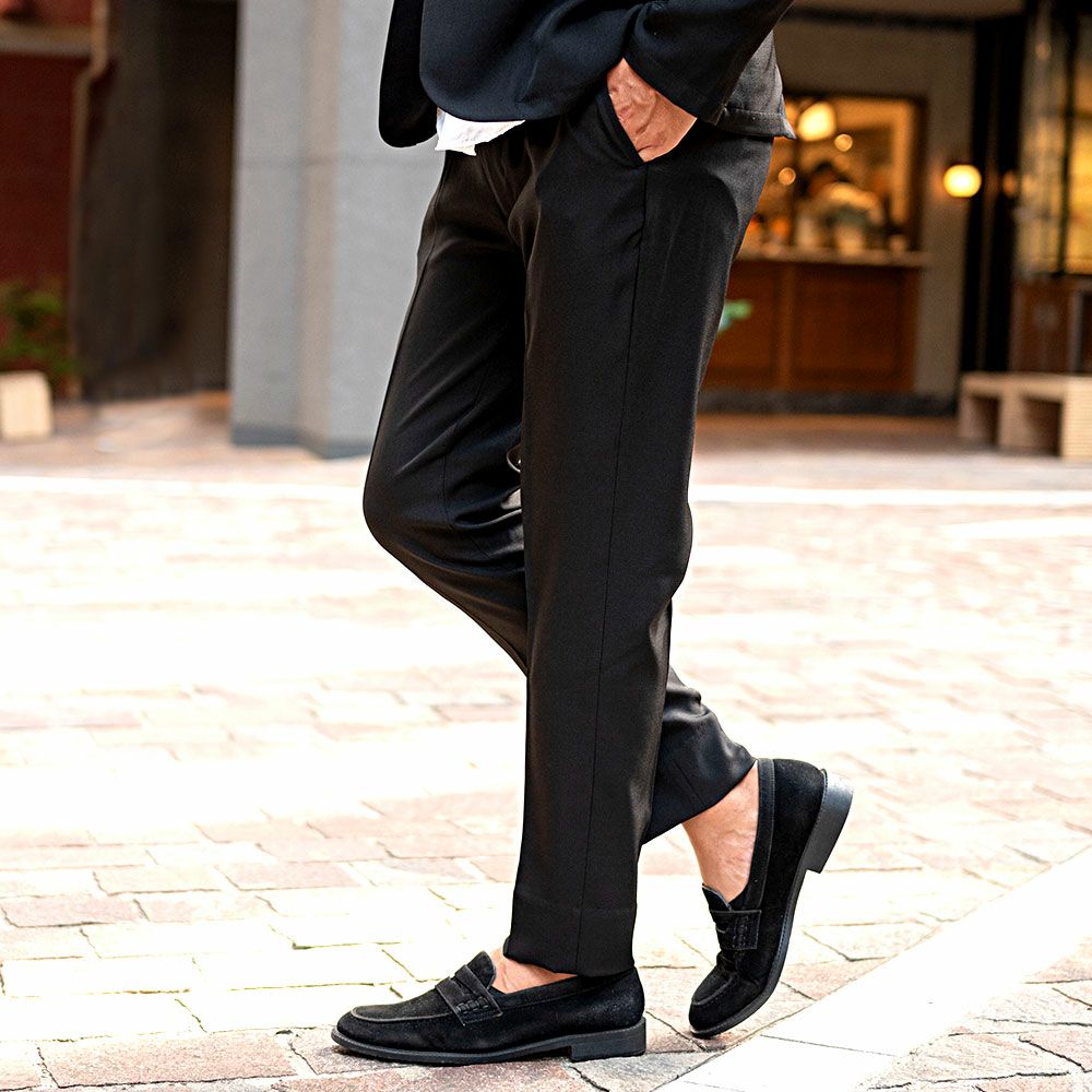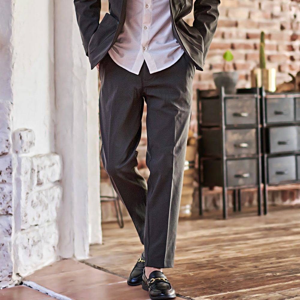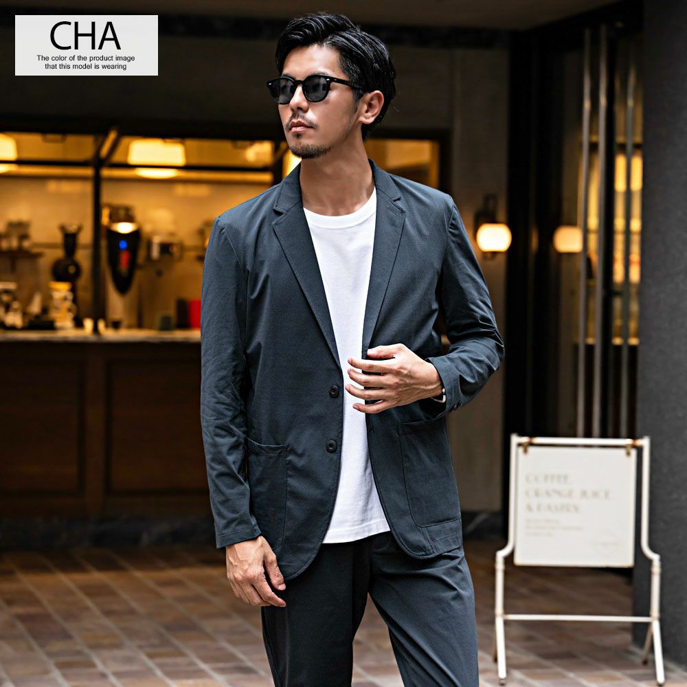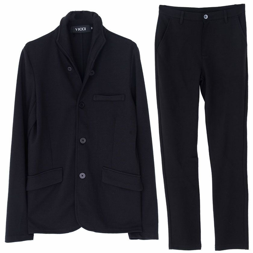 艶があり高級感溢れるストレッチ素材を使用したテーラードジャケットとテーパードパンツのセットアップ。