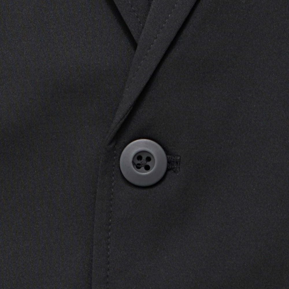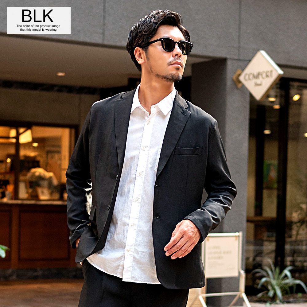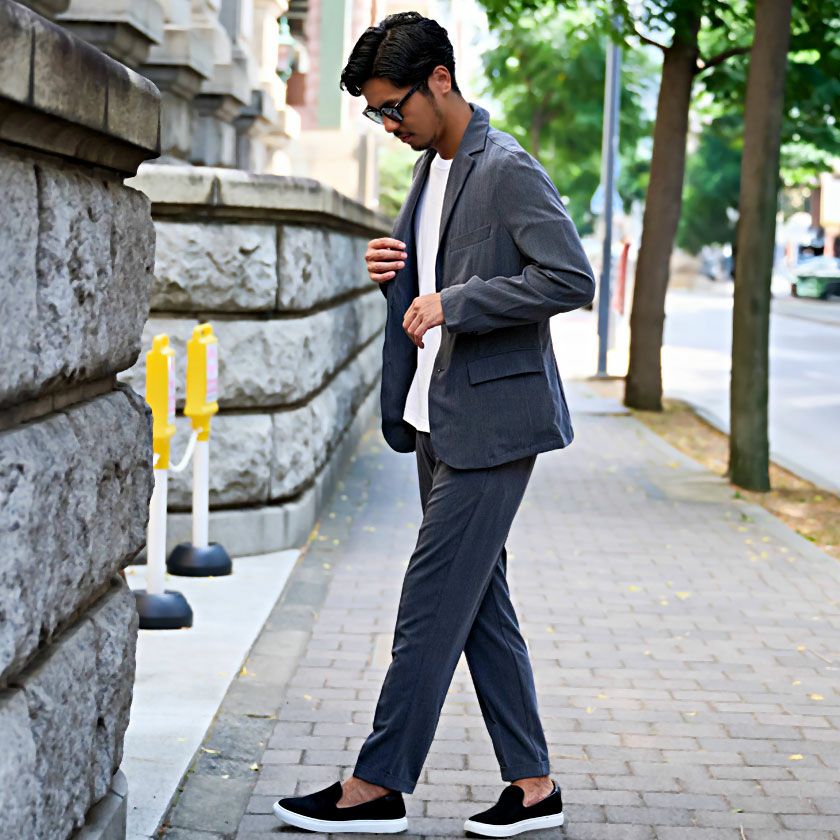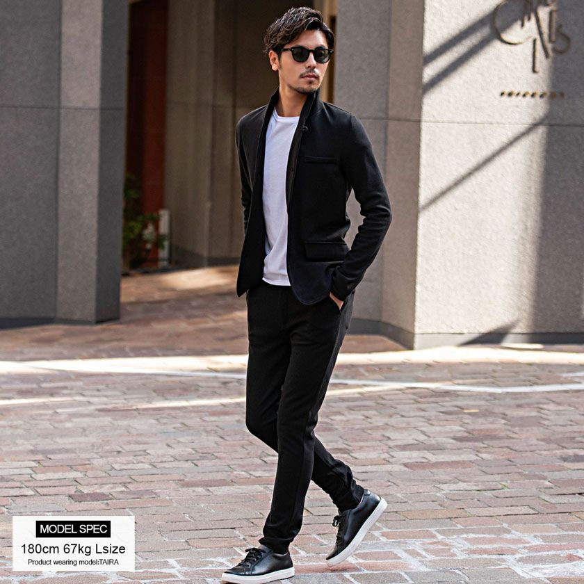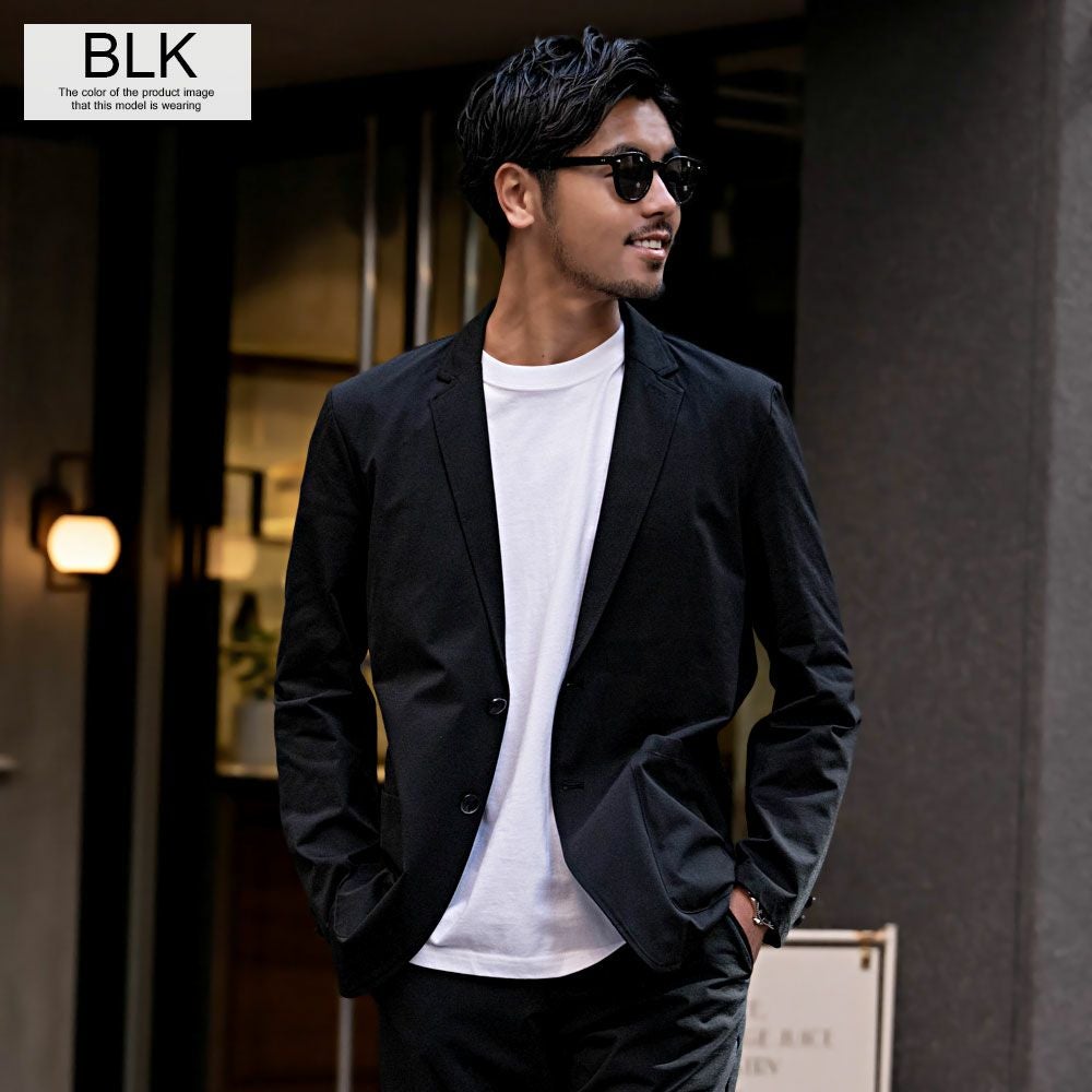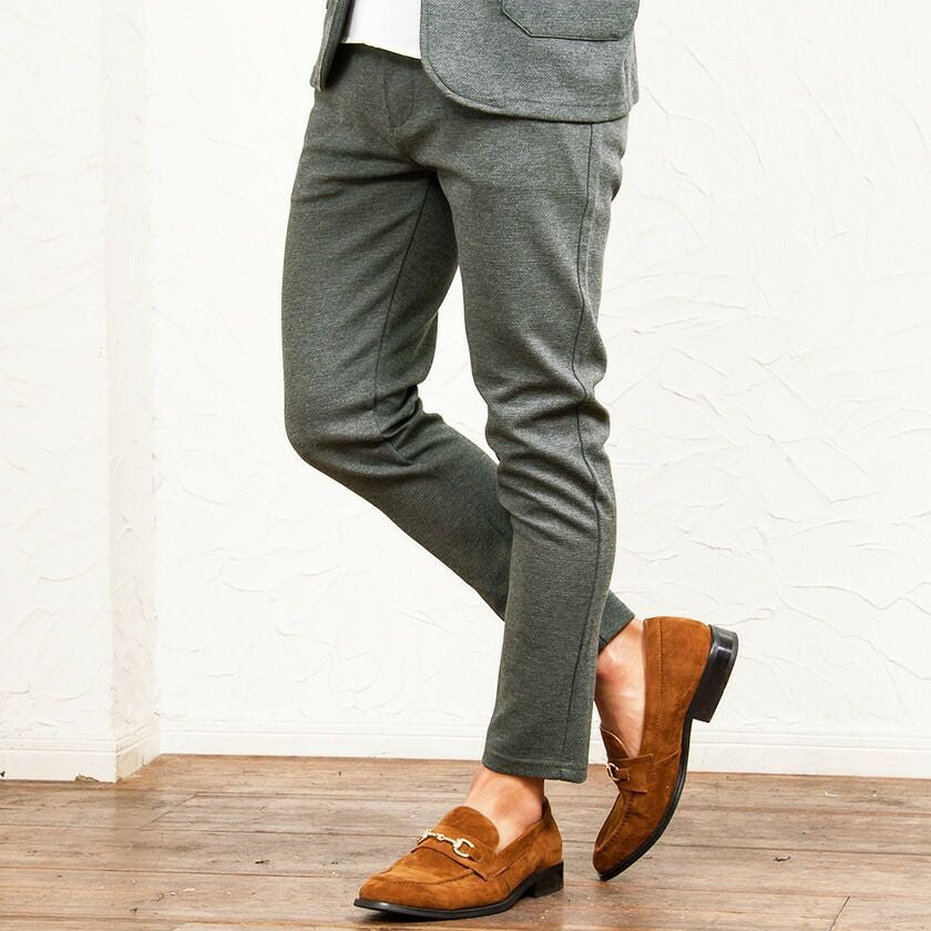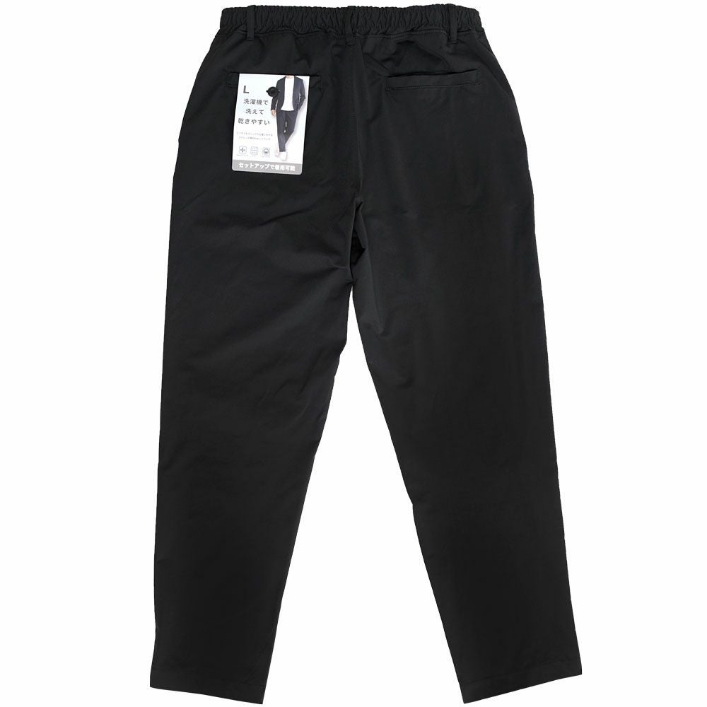 艶があり高級感溢れるストレッチ素材を使用したテーラードジャケットとテーパードパンツのセットアップ。