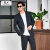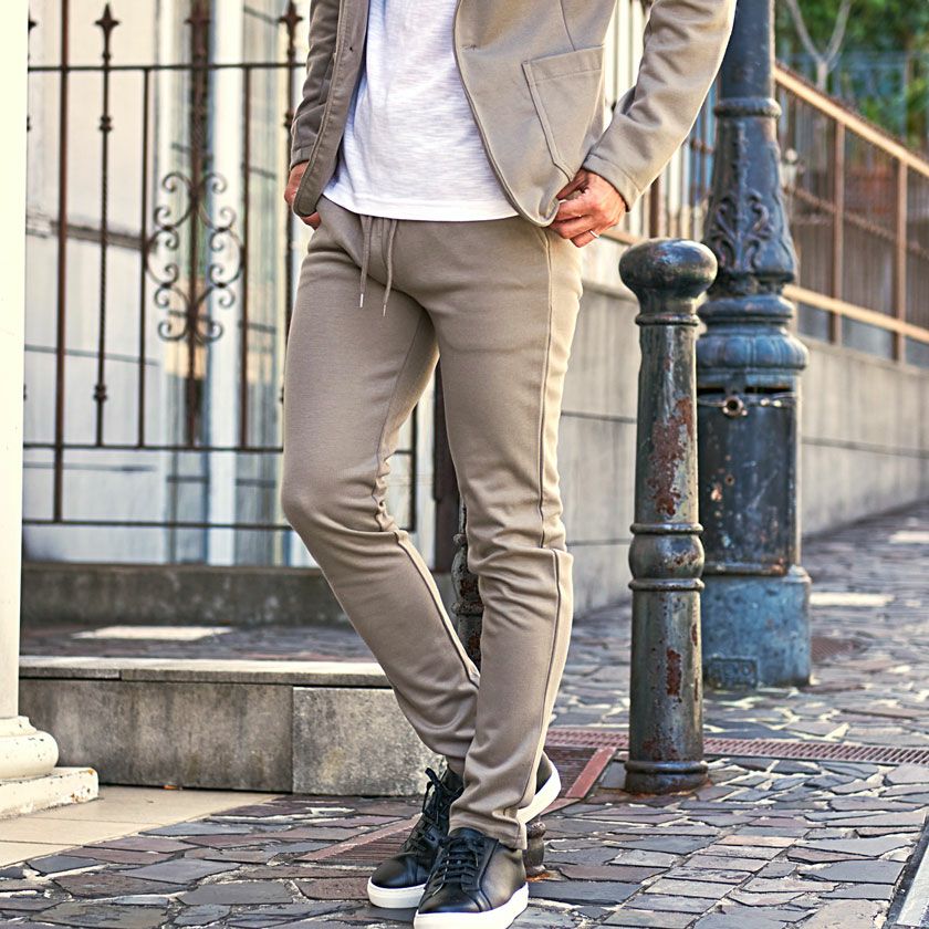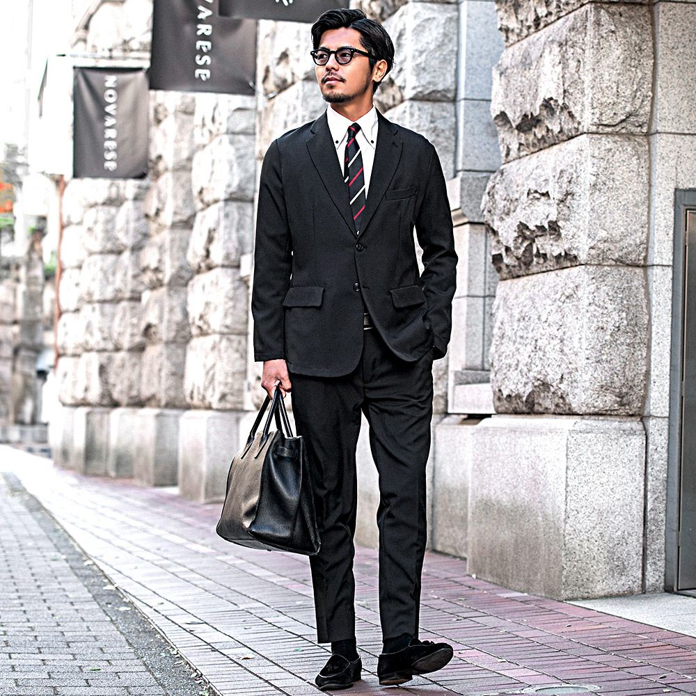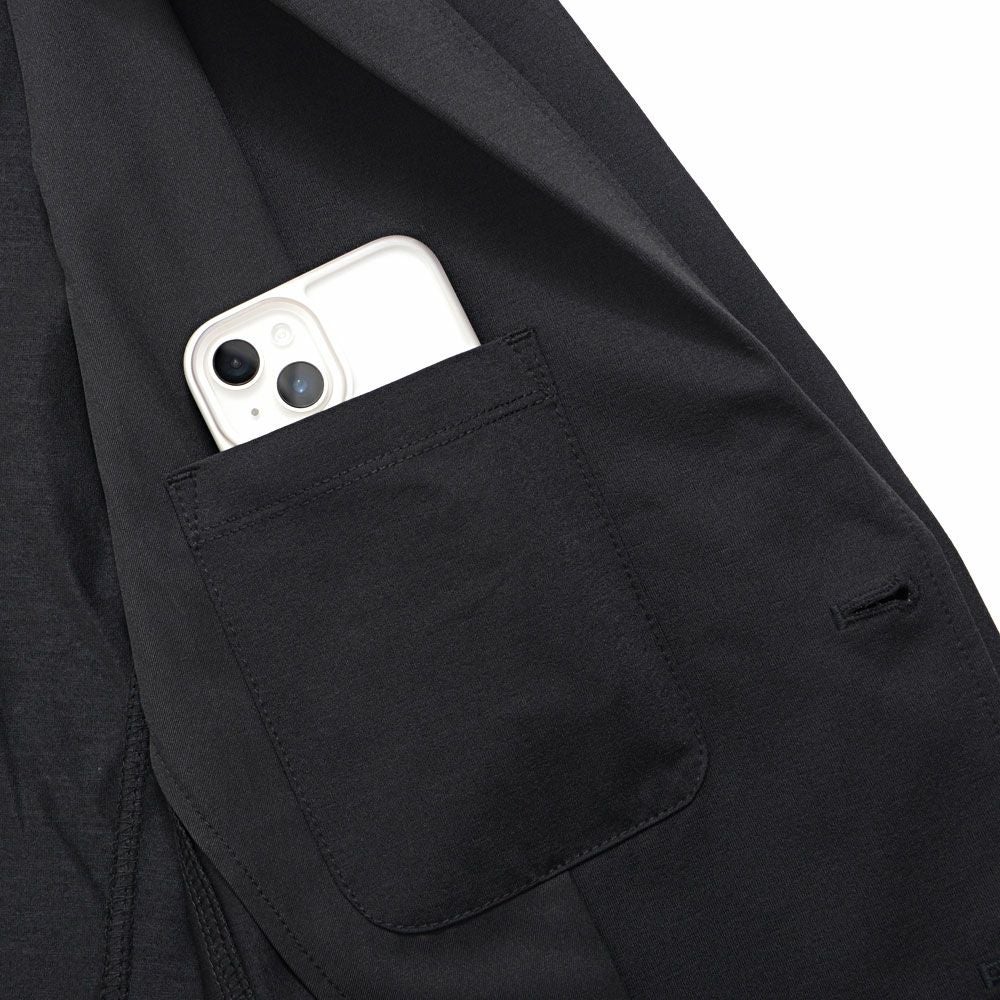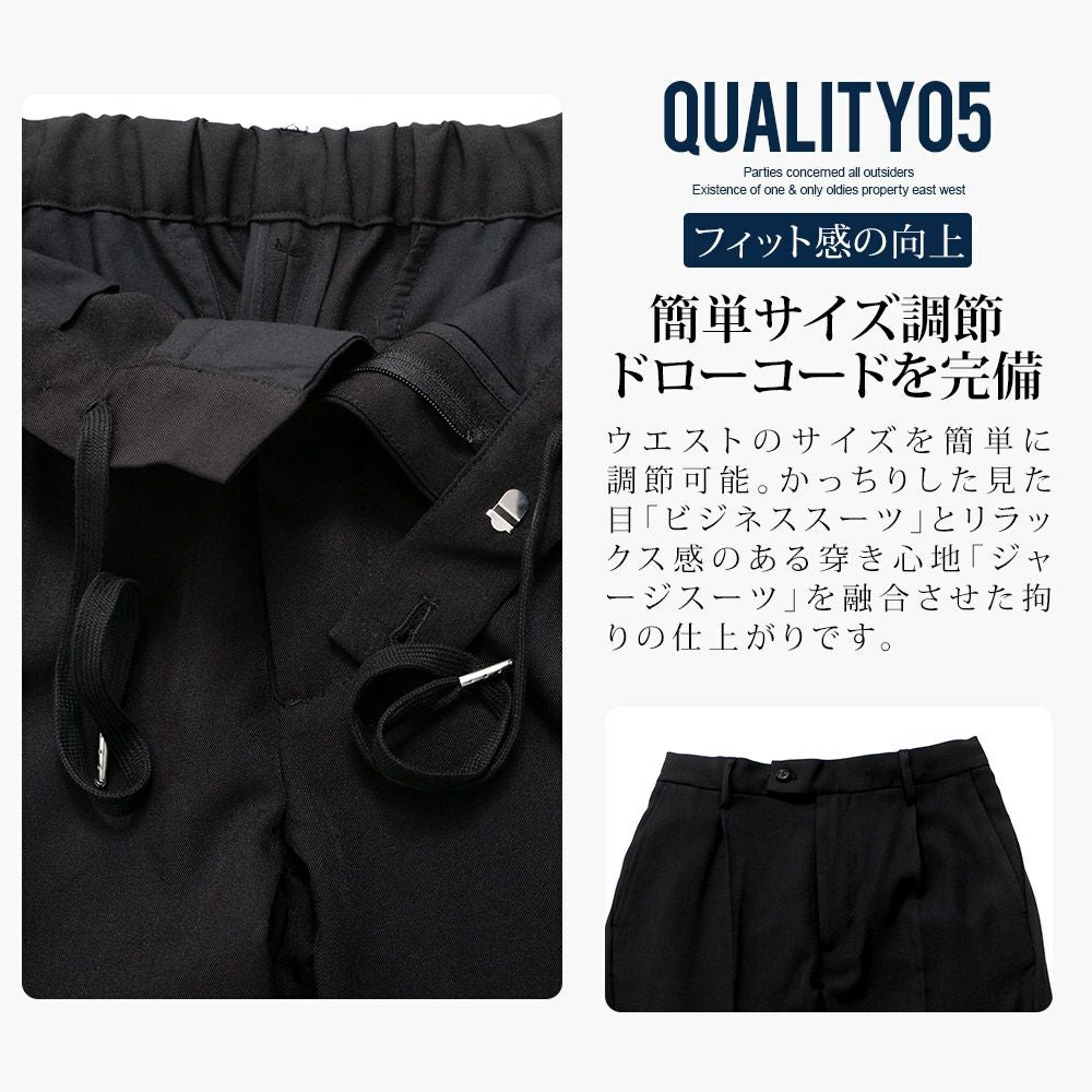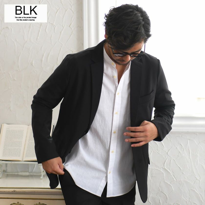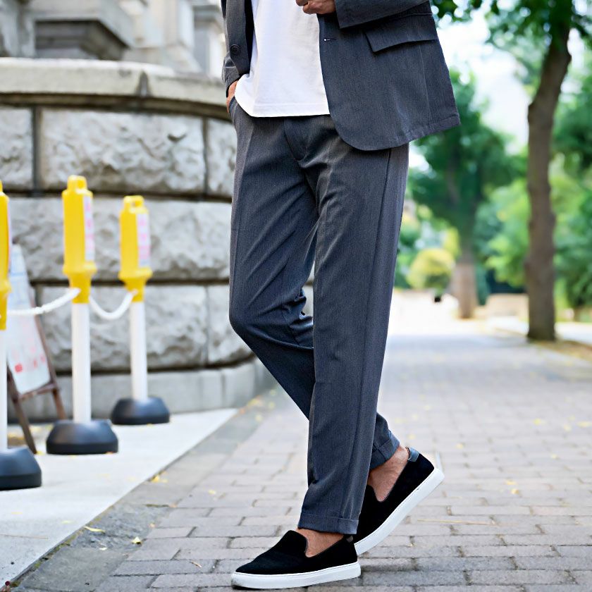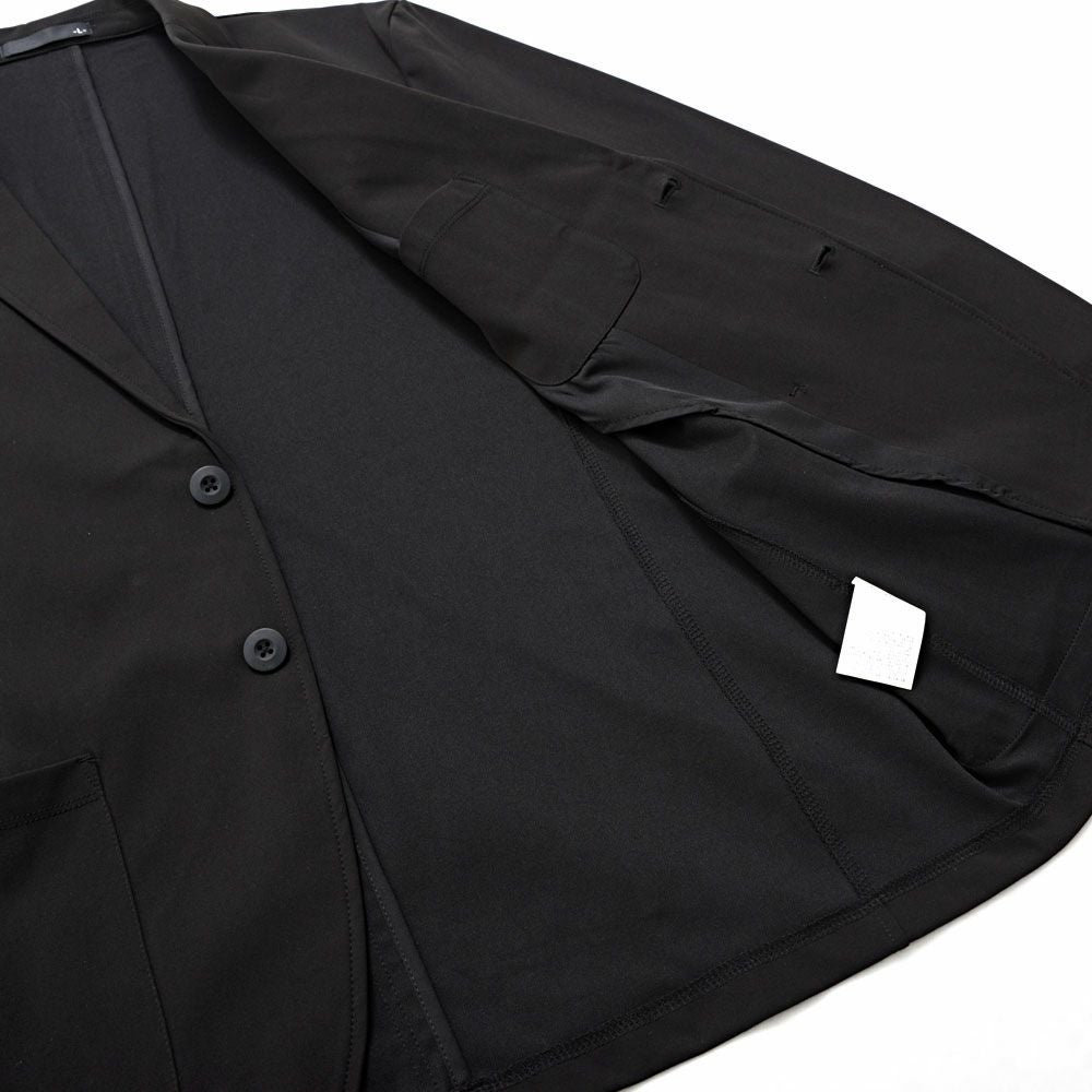 艶があり高級感溢れるストレッチ素材を使用したテーラードジャケットとテーパードパンツのセットアップ。