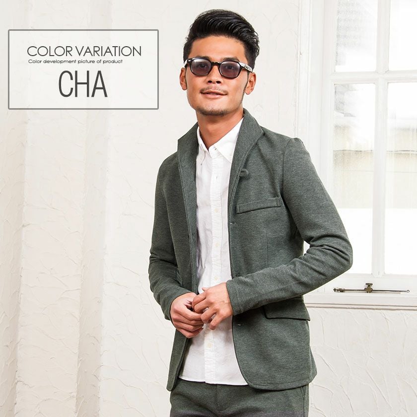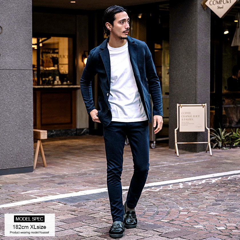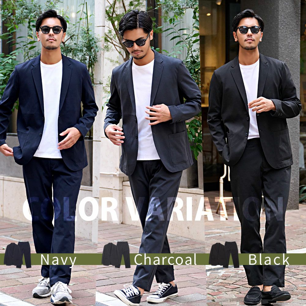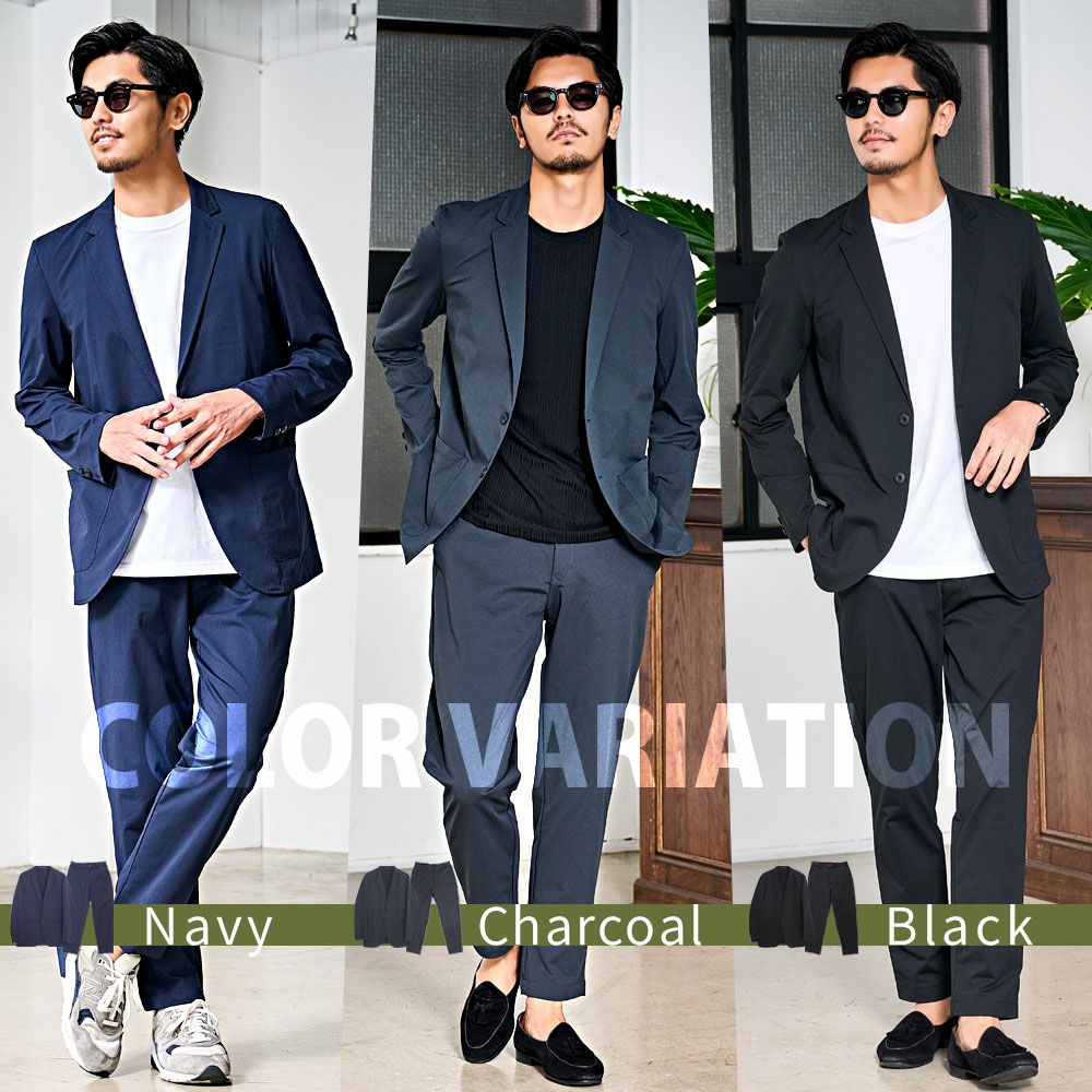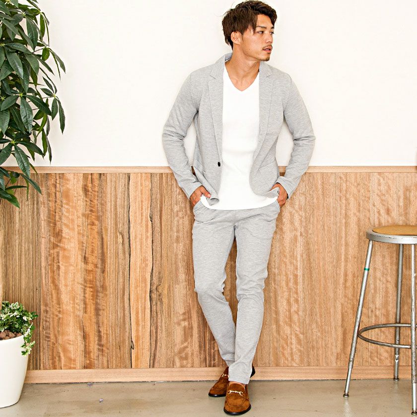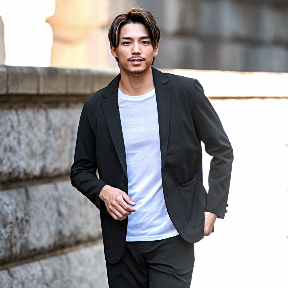ジャケットとパンツと半袖Tシャツの3点セット。インナーの半袖Tシャツは柔らかなサーマル素材を使用したクルーネックタイプとスタイリッシュなテレコ素材を使用したVネックの2タイプ。