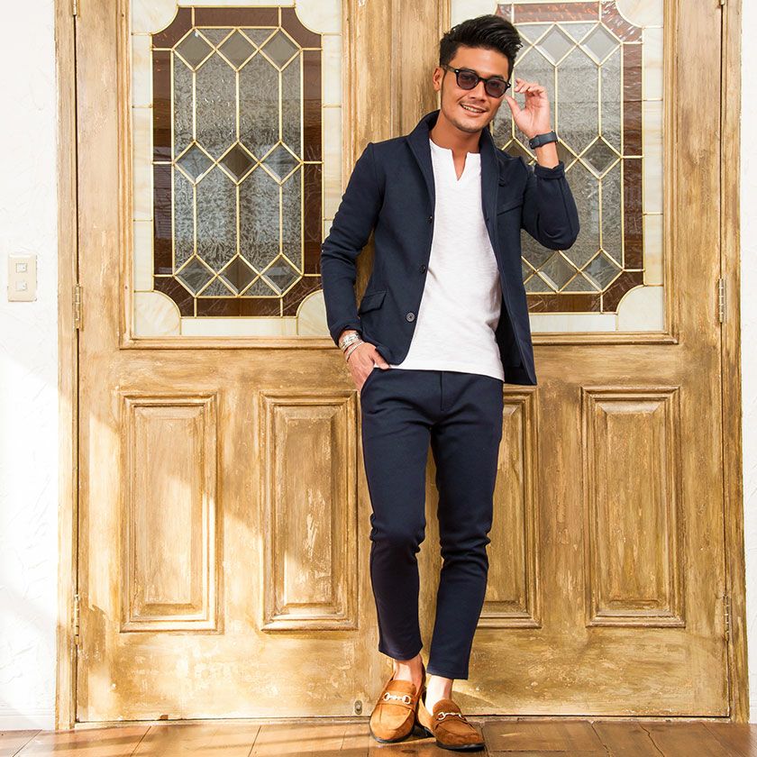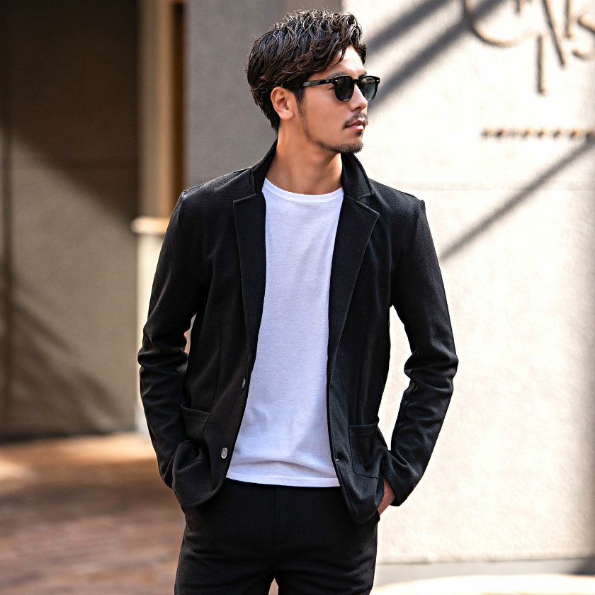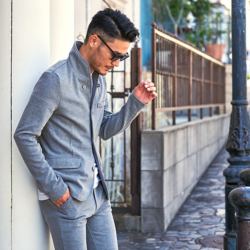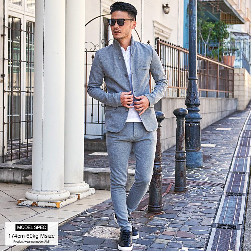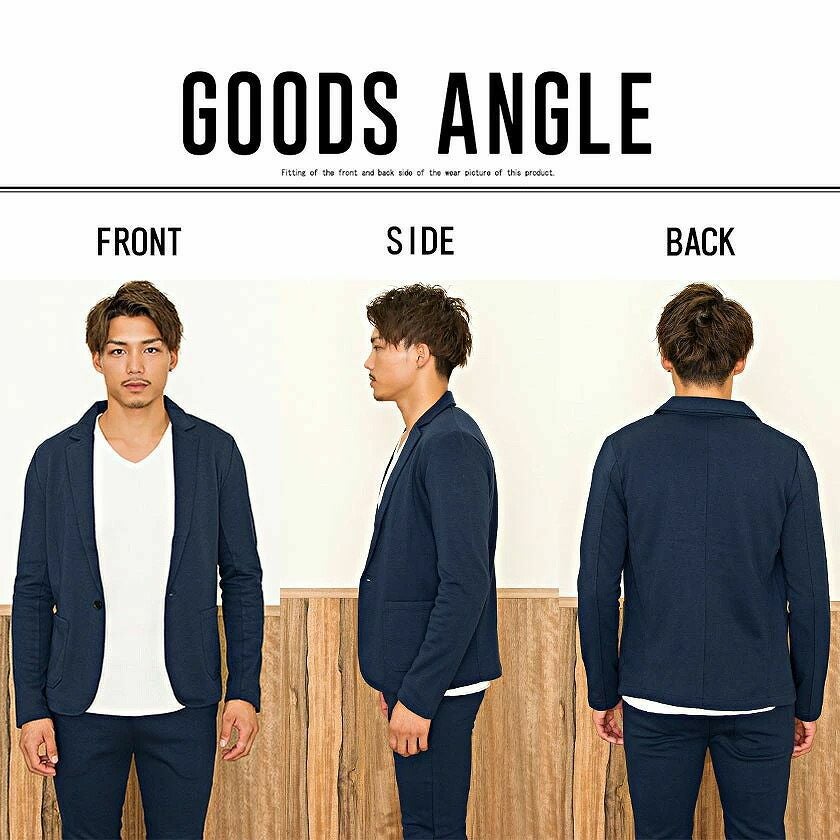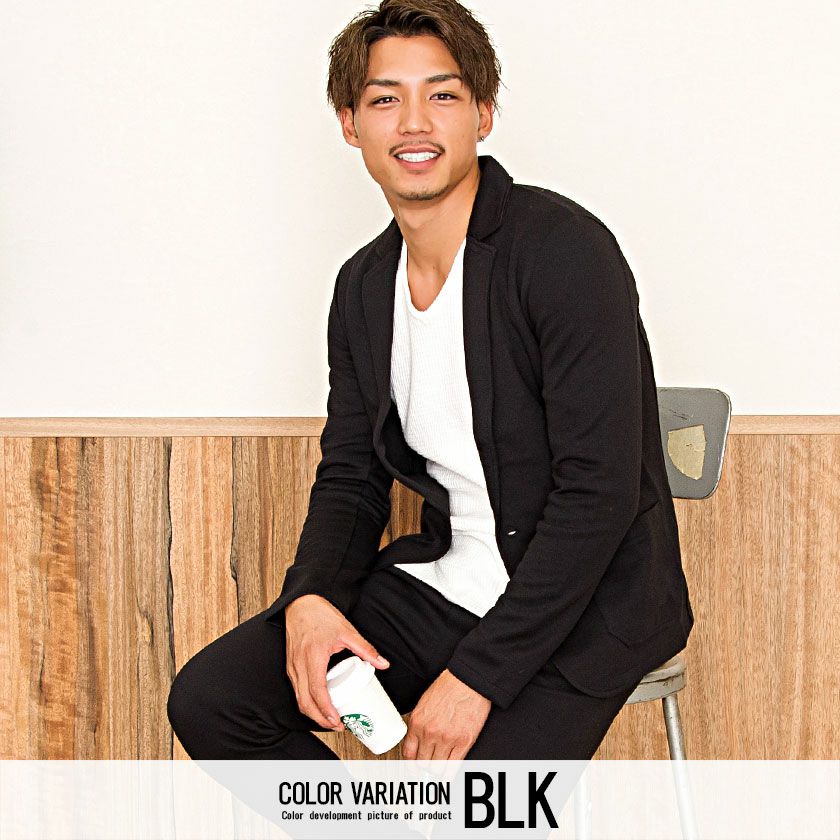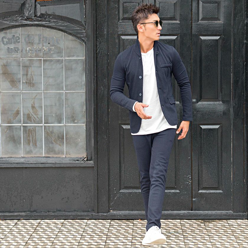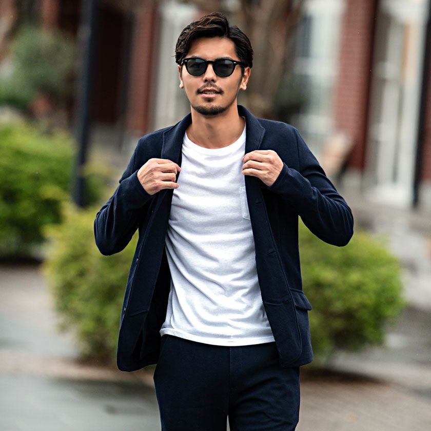 ジャケットとパンツと半袖Tシャツの3点セット。インナーの半袖Tシャツは柔らかなサーマル素材を使用したクルーネックタイプとスタイリッシュなテレコ素材を使用したVネックの2タイプ。