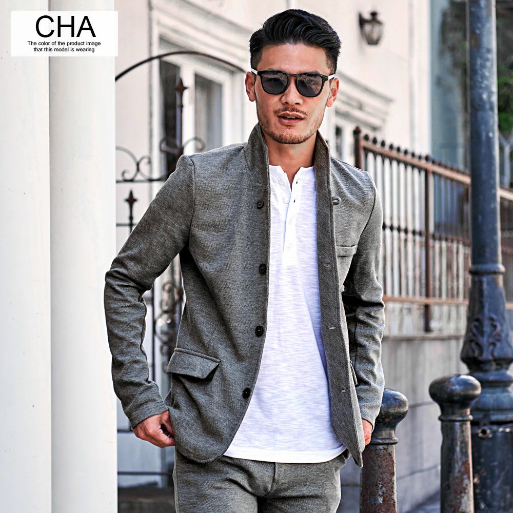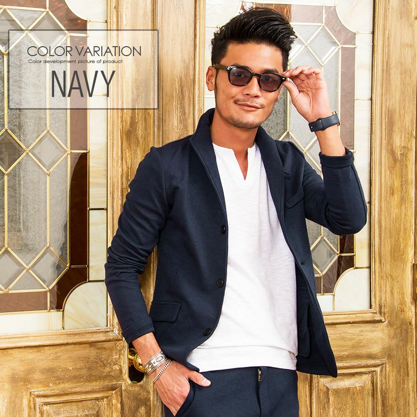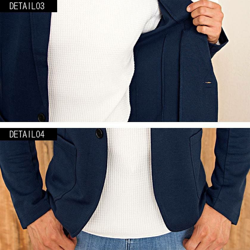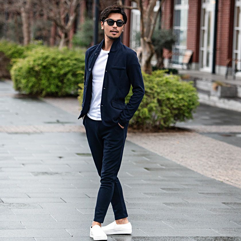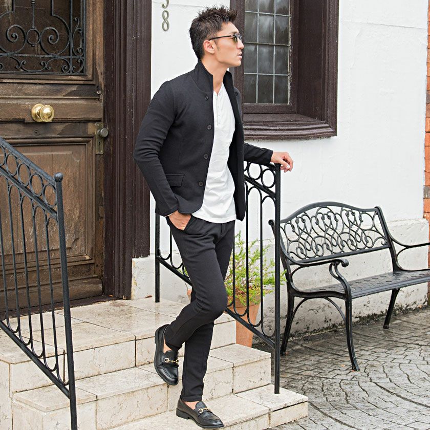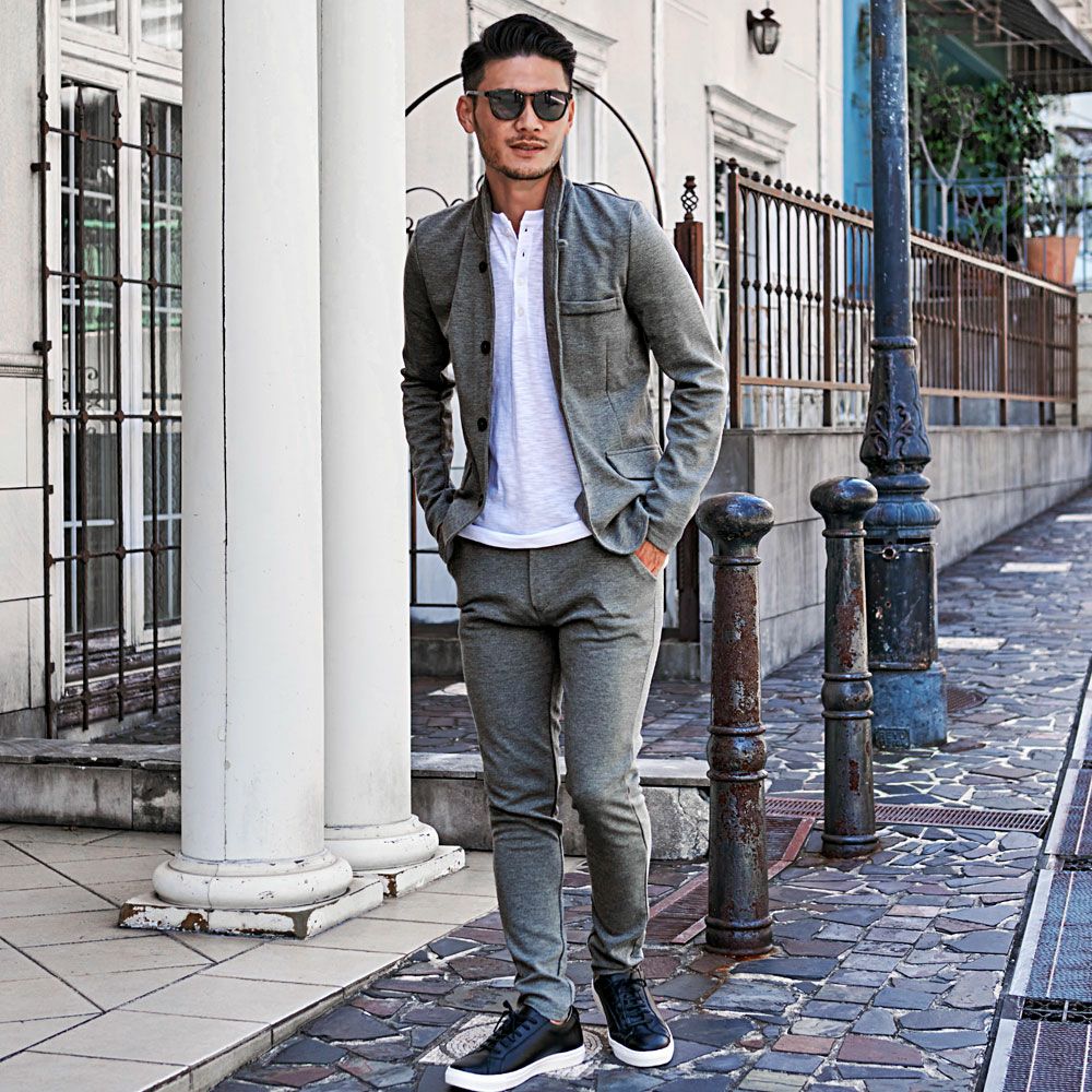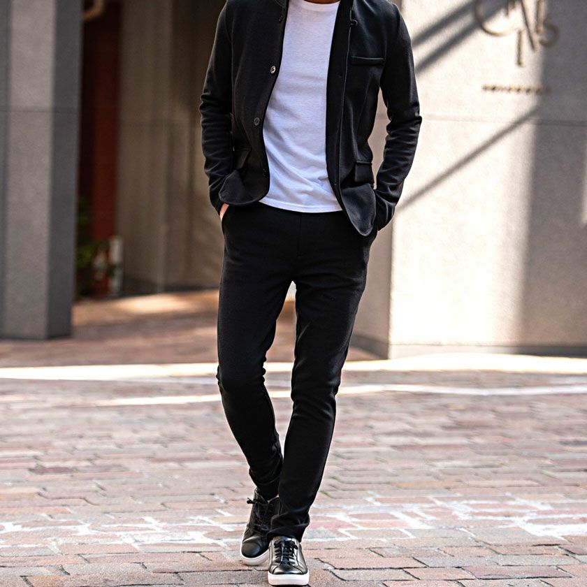 ジャケットとパンツと半袖Tシャツの3点セット。インナーの半袖Tシャツは柔らかなサーマル素材を使用したクルーネックタイプとスタイリッシュなテレコ素材を使用したVネックの2タイプ。