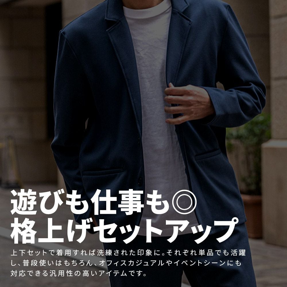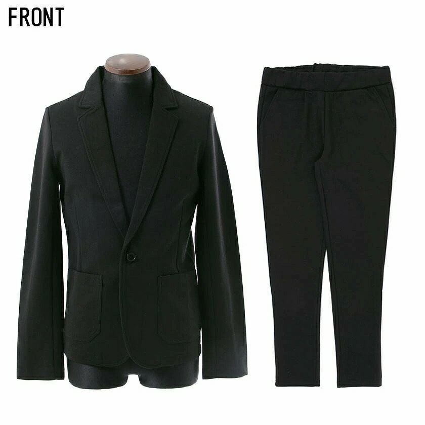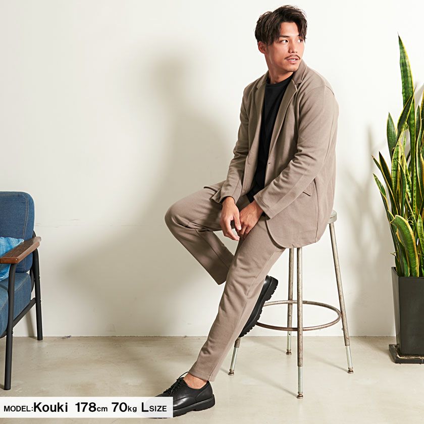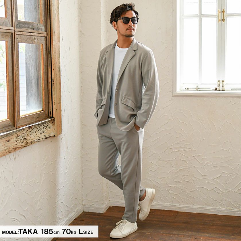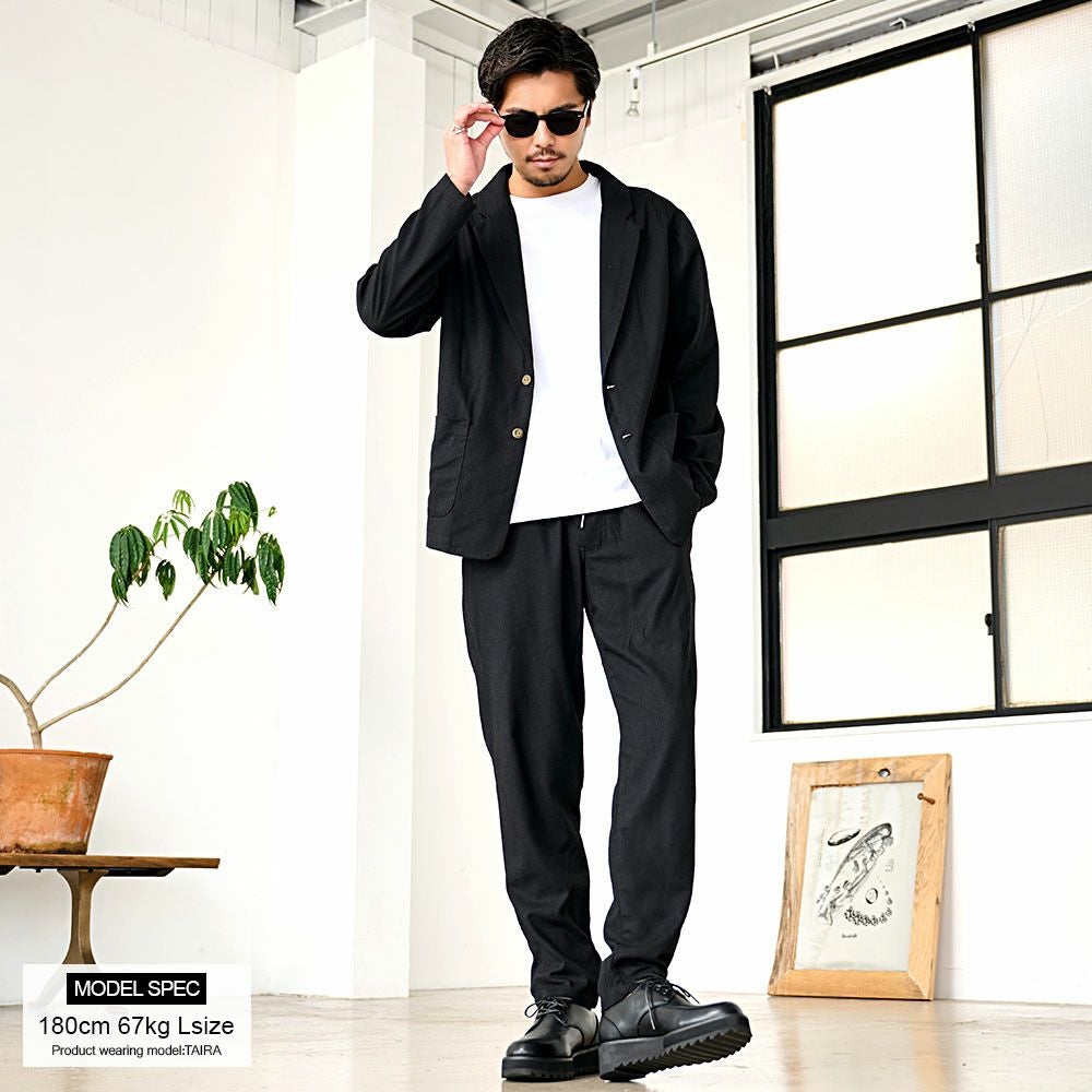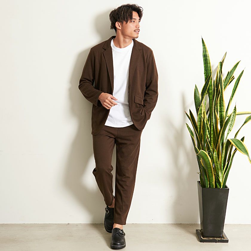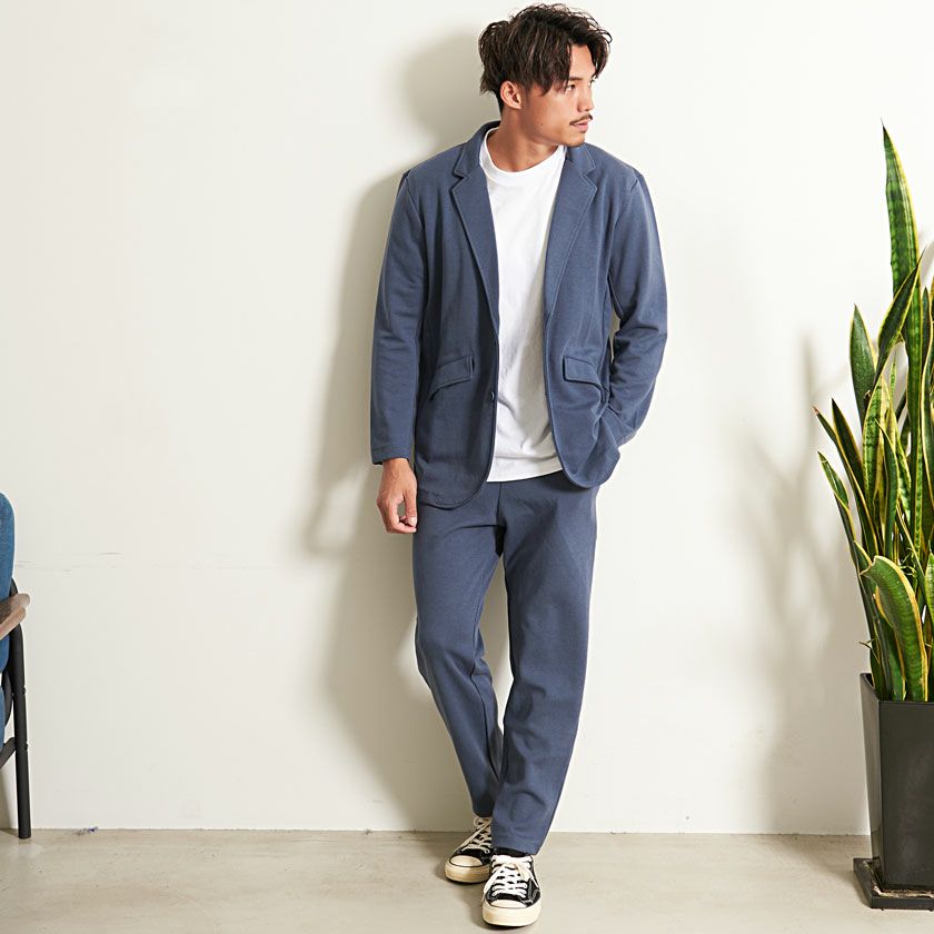 シンプルでベーシックなデザインのテーラードジャケットとイージーパンツの2点セット。