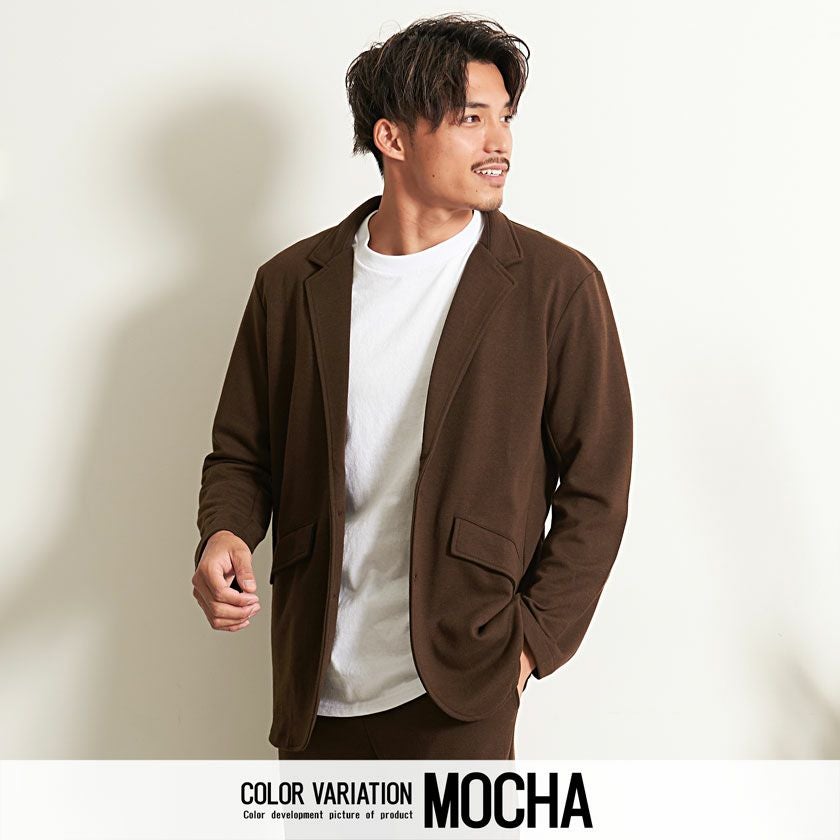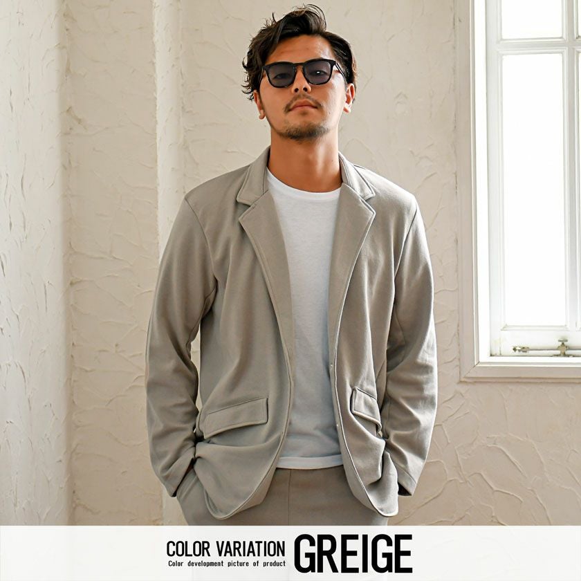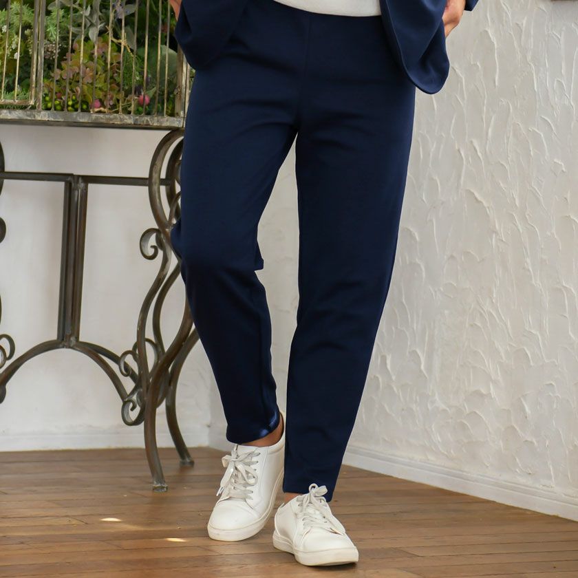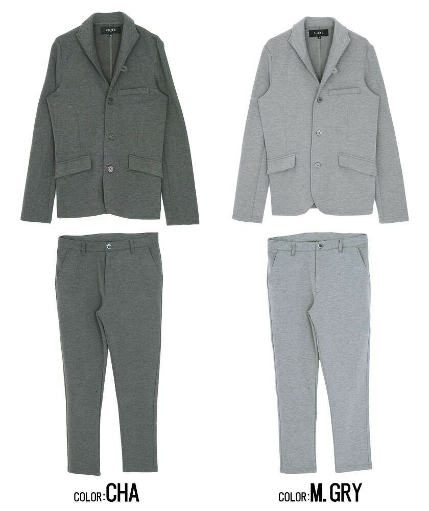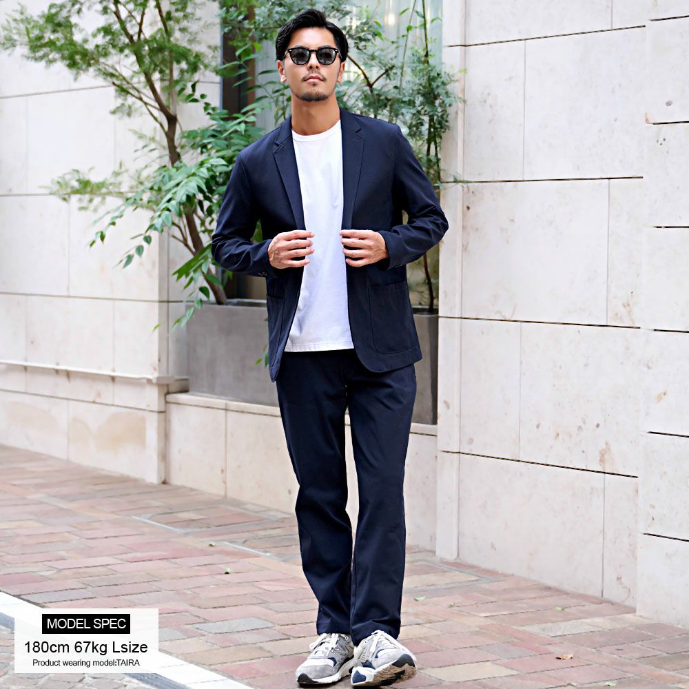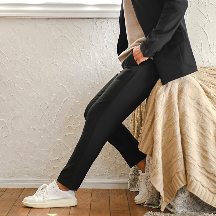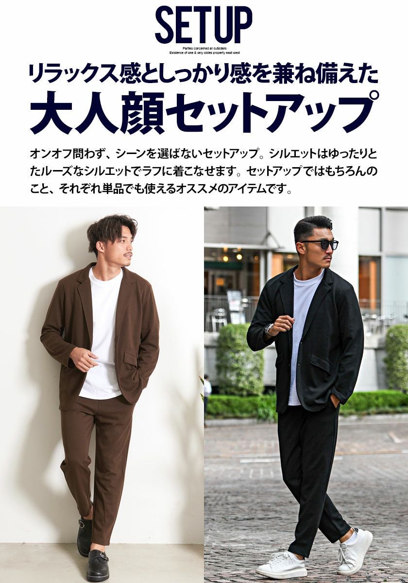 シンプルでベーシックなデザインのテーラードジャケットとイージーパンツの2点セット。