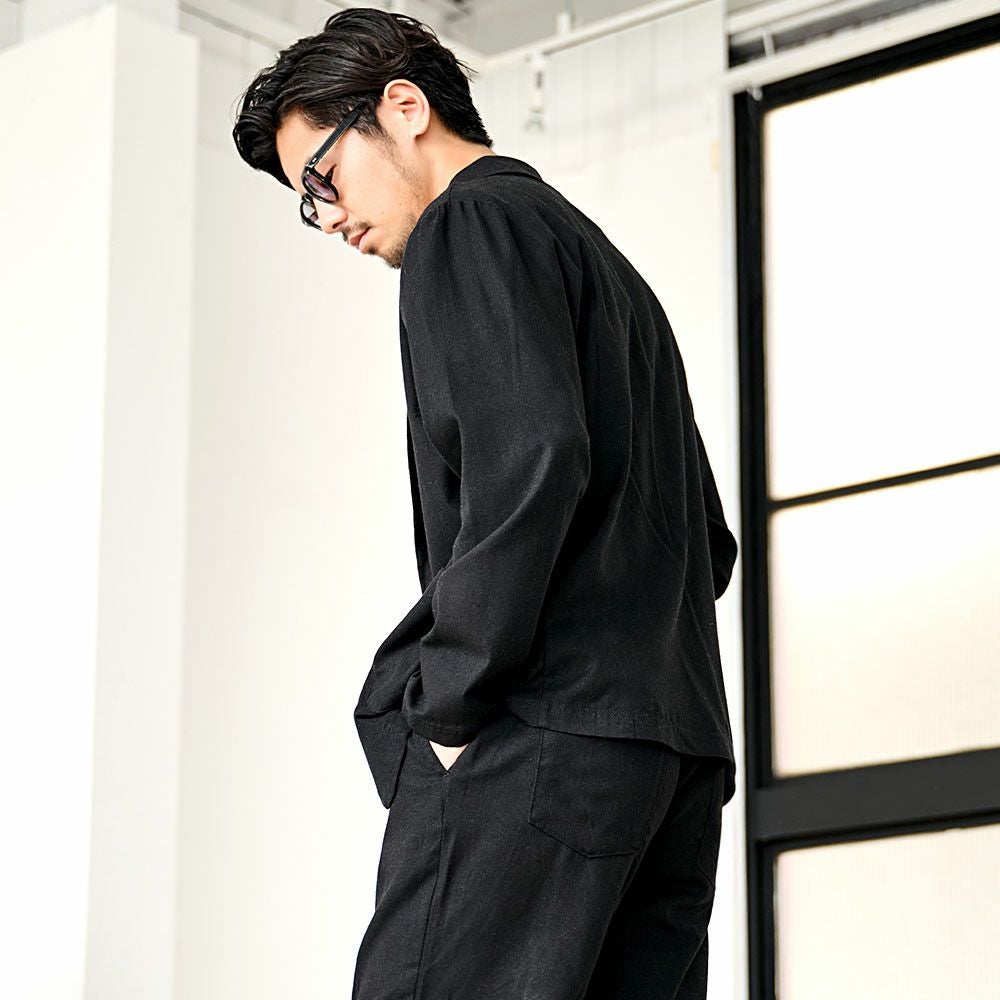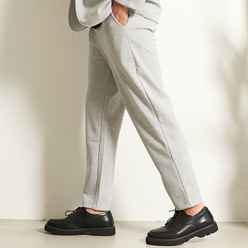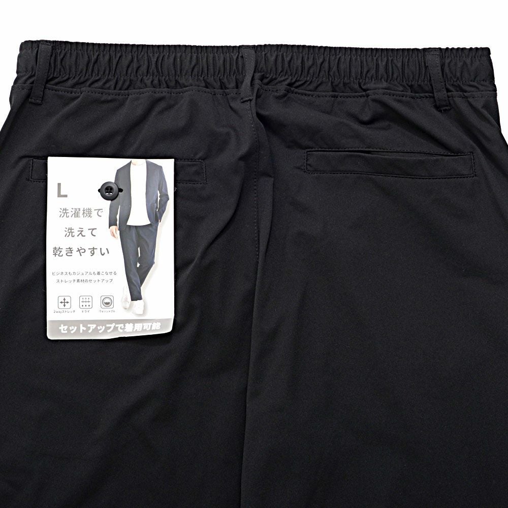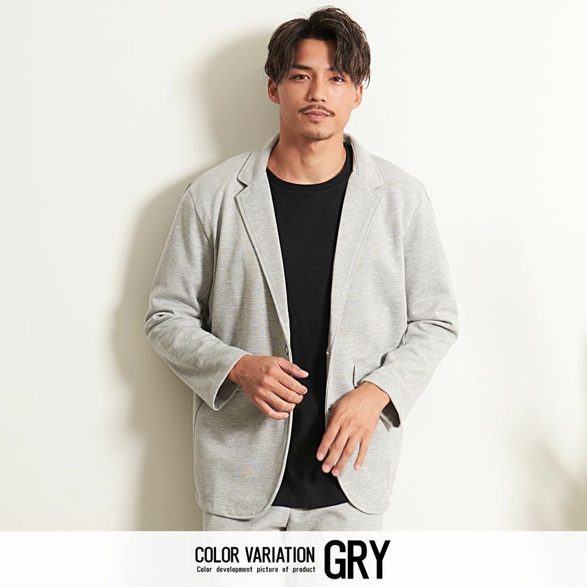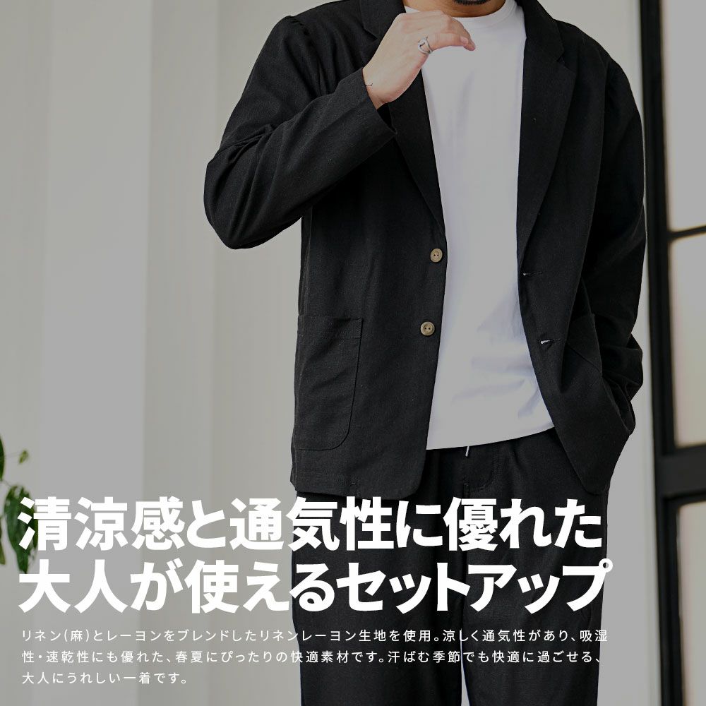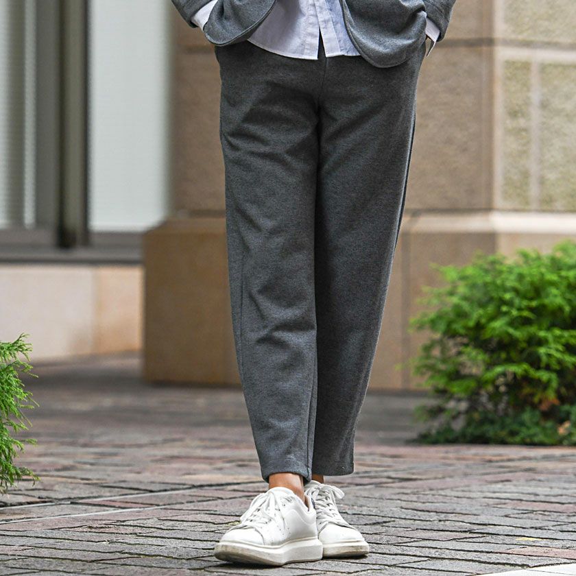 シンプルでベーシックなデザインのテーラードジャケットとイージーパンツの2点セット。