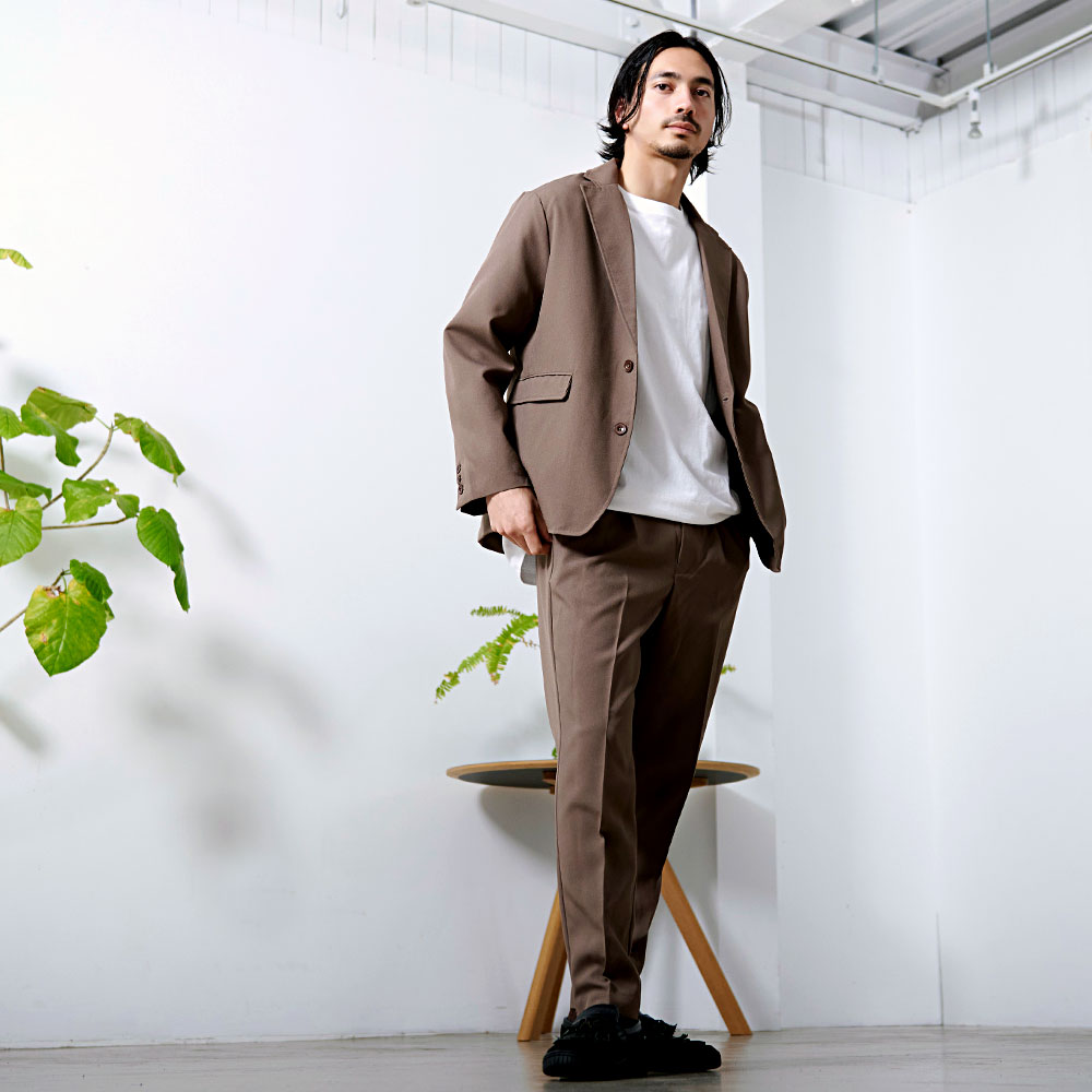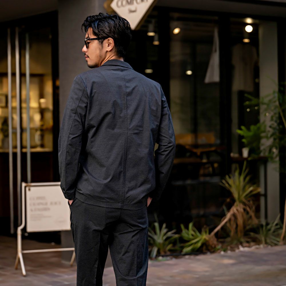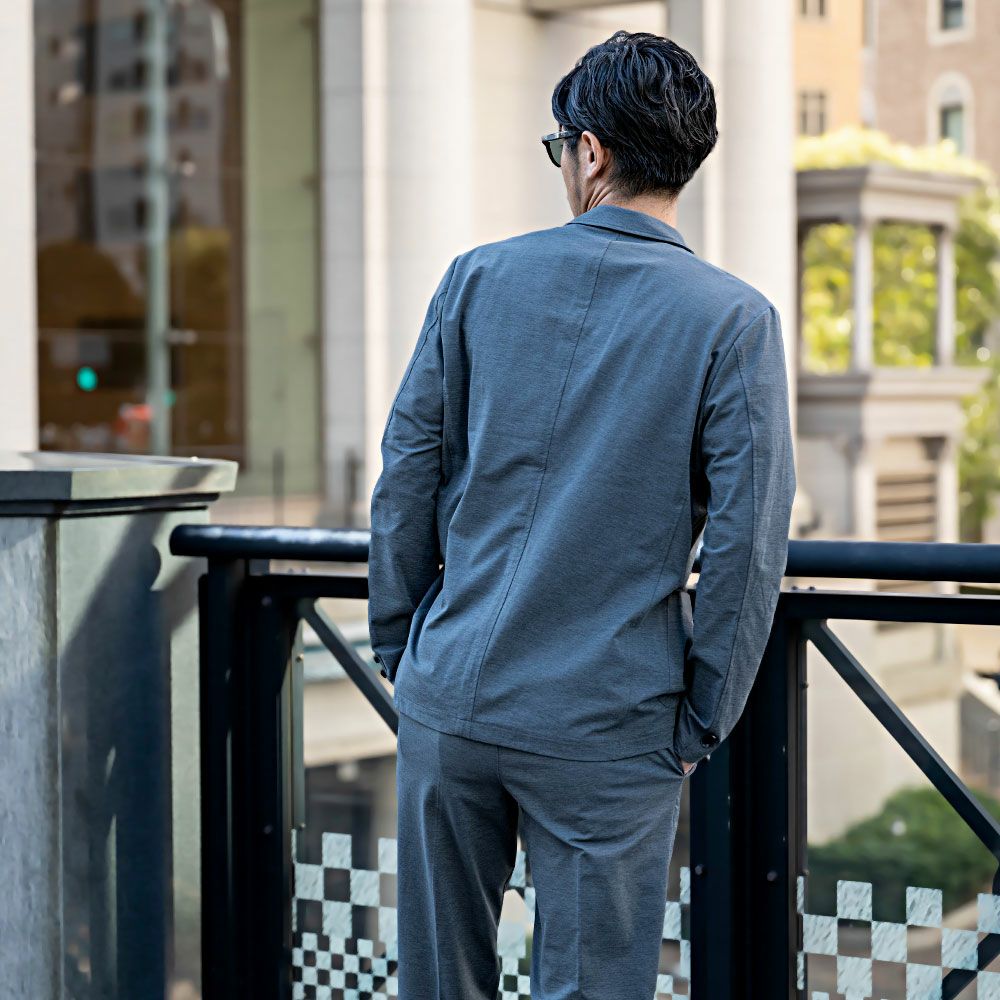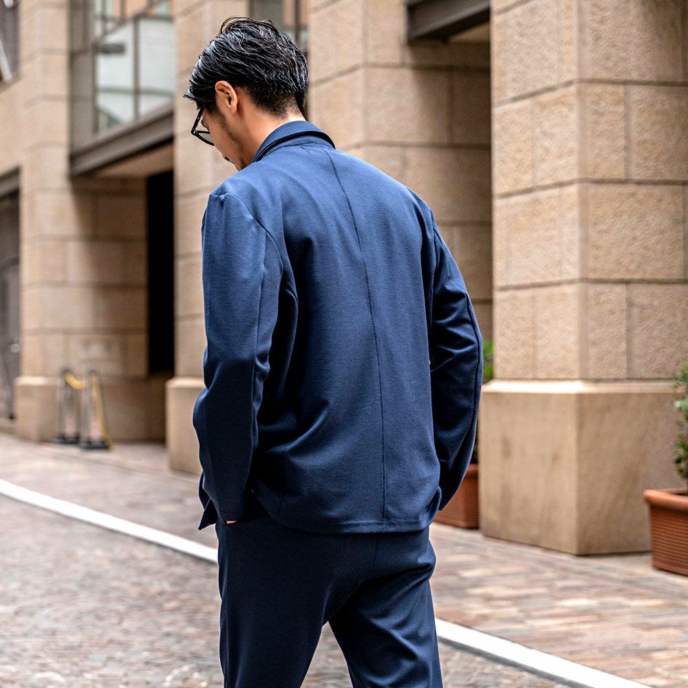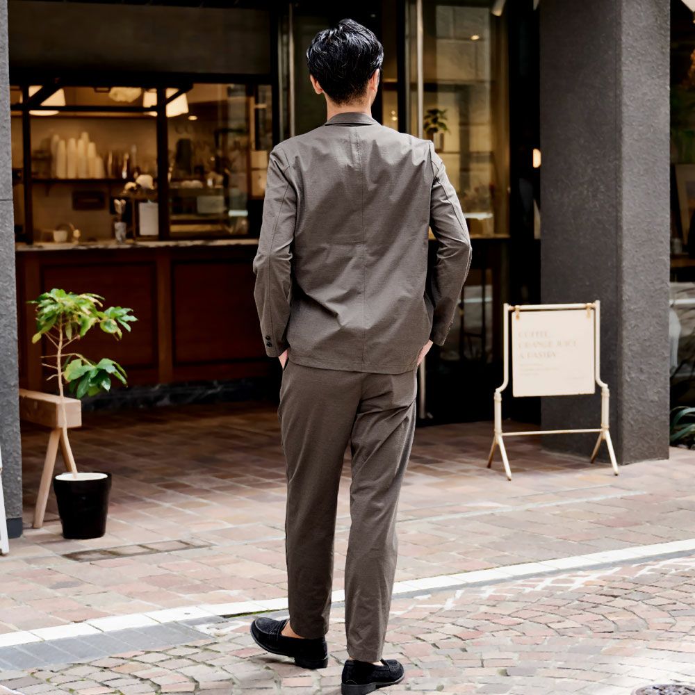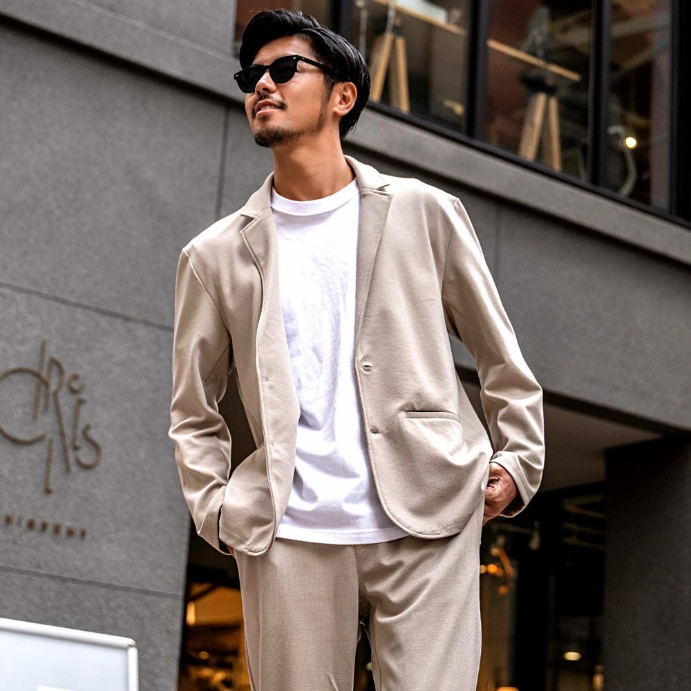 ポンチ素材を使用したテーラードジャケットとパンツのセットアップ。