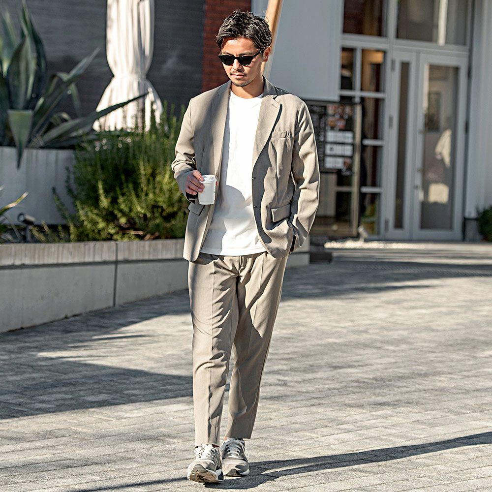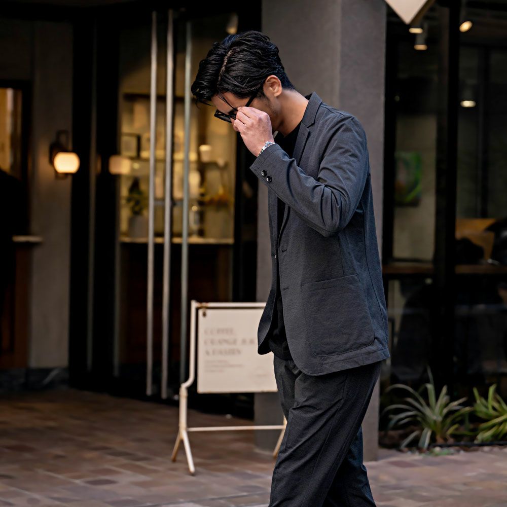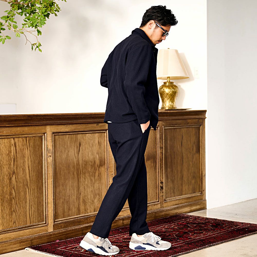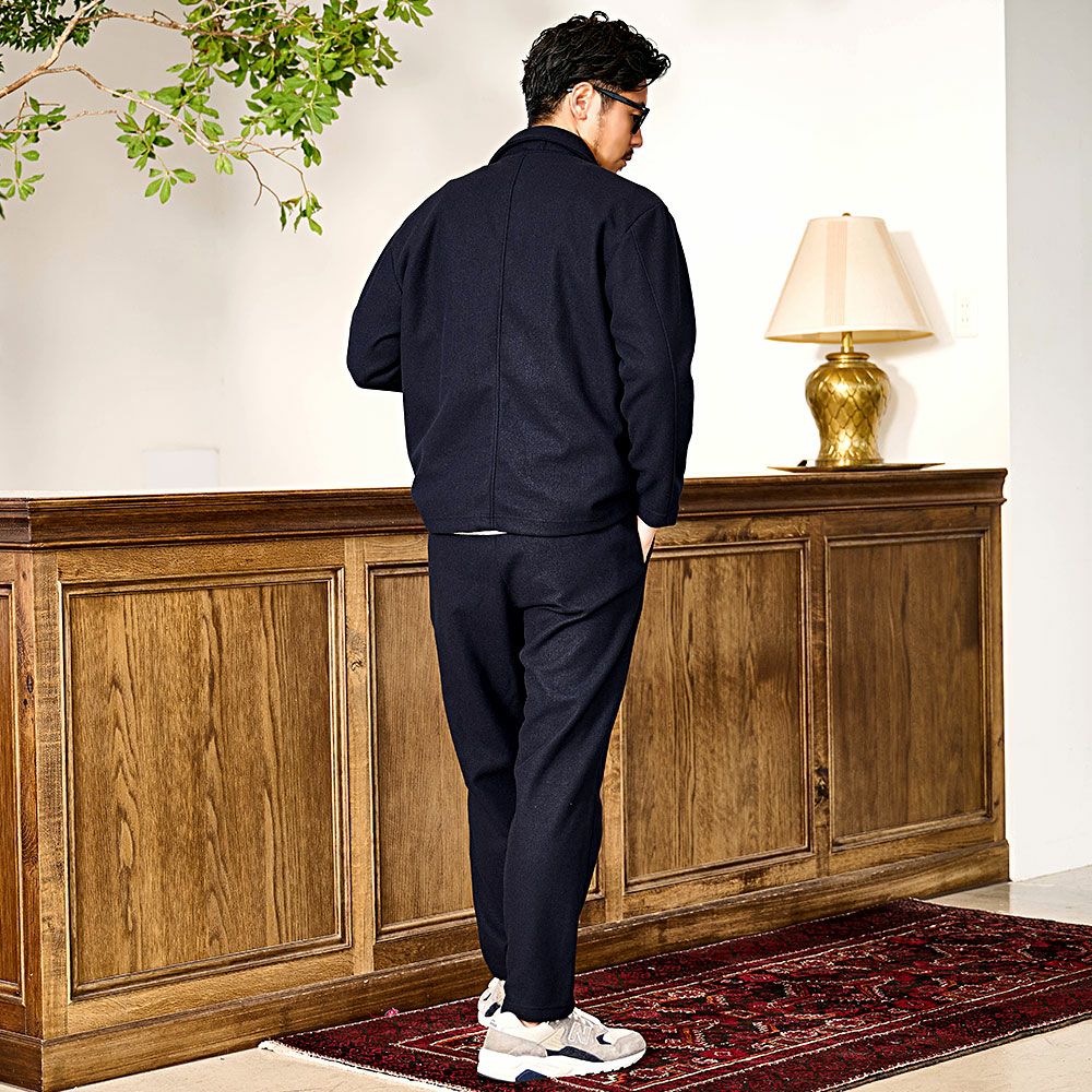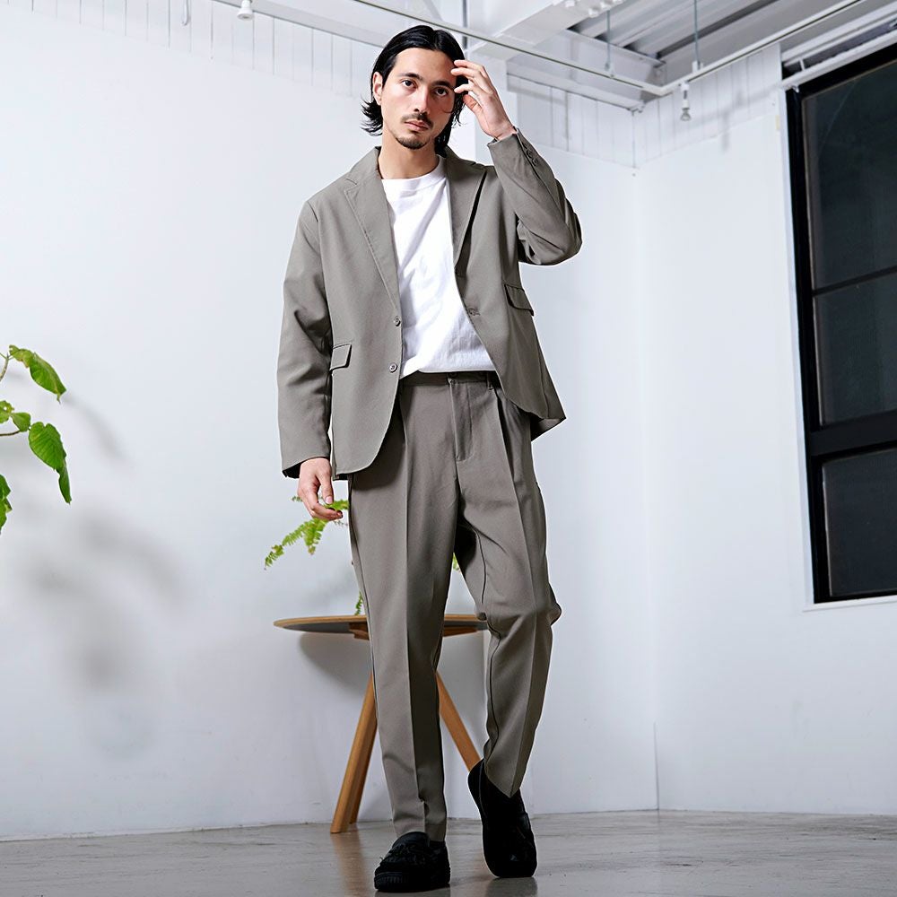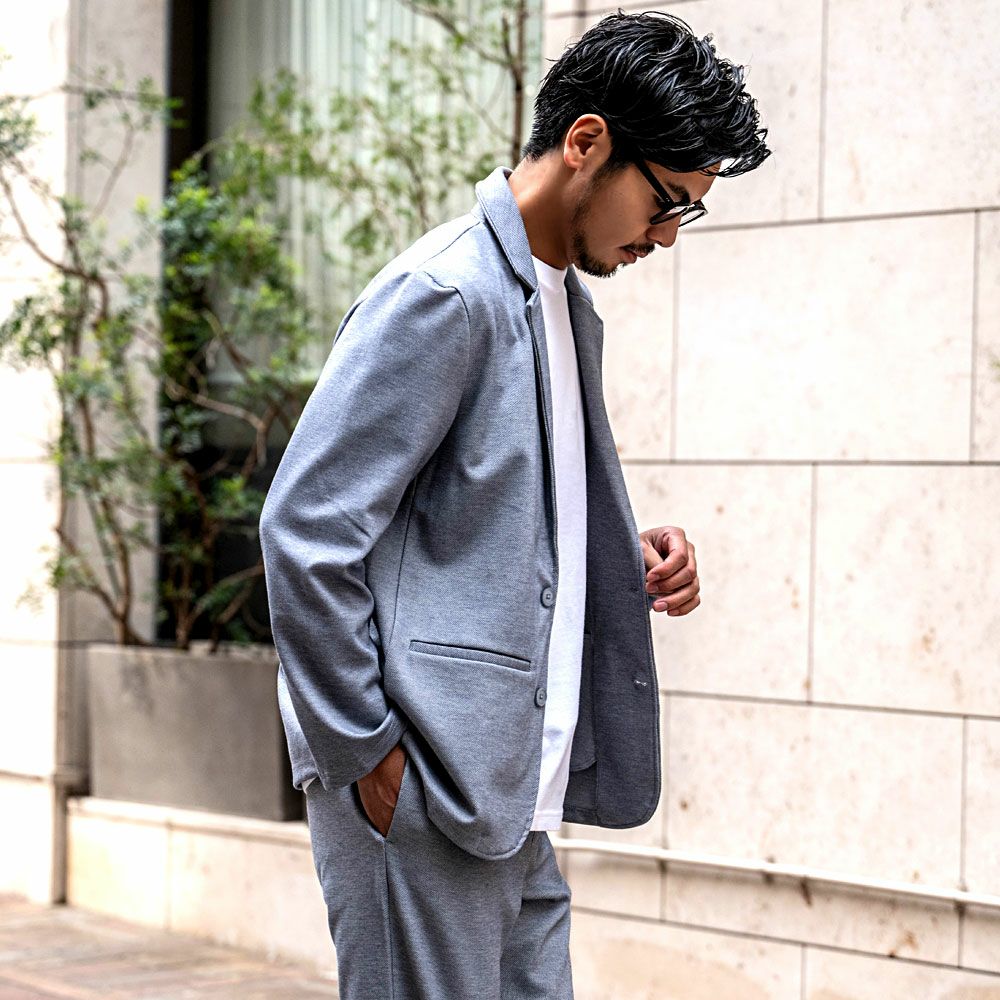 ポンチ素材を使用したテーラードジャケットとパンツのセットアップ。