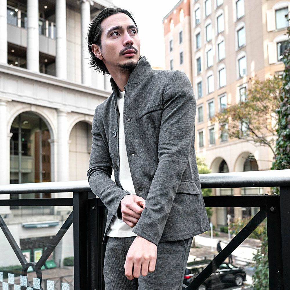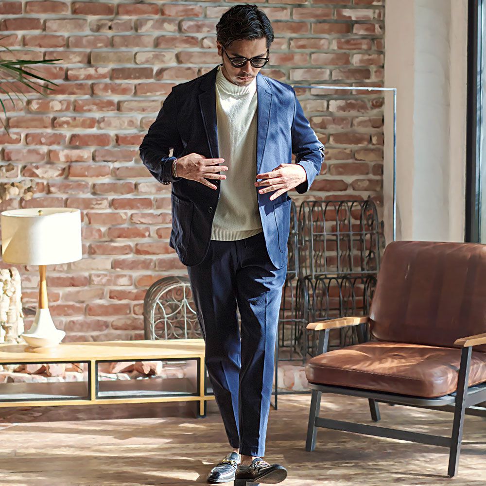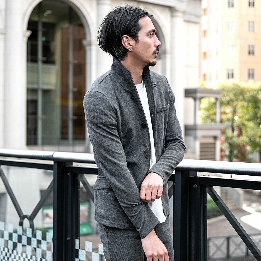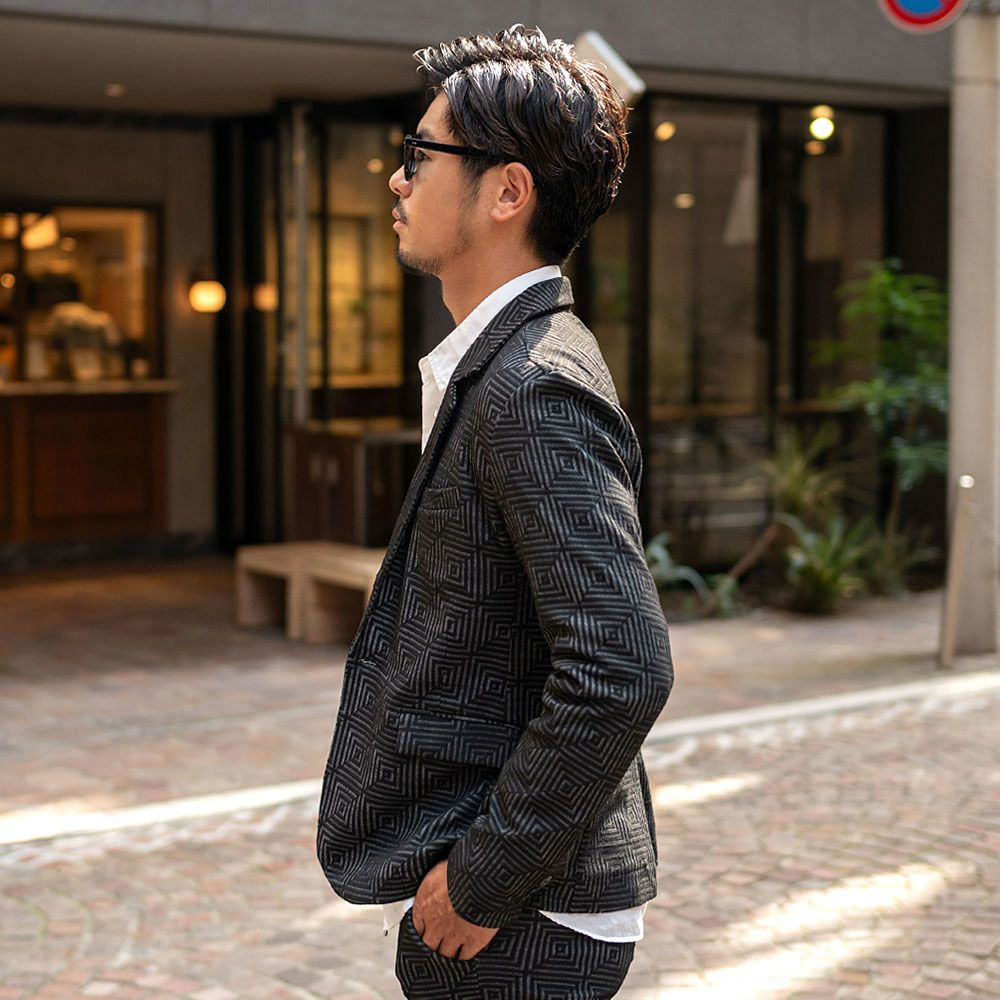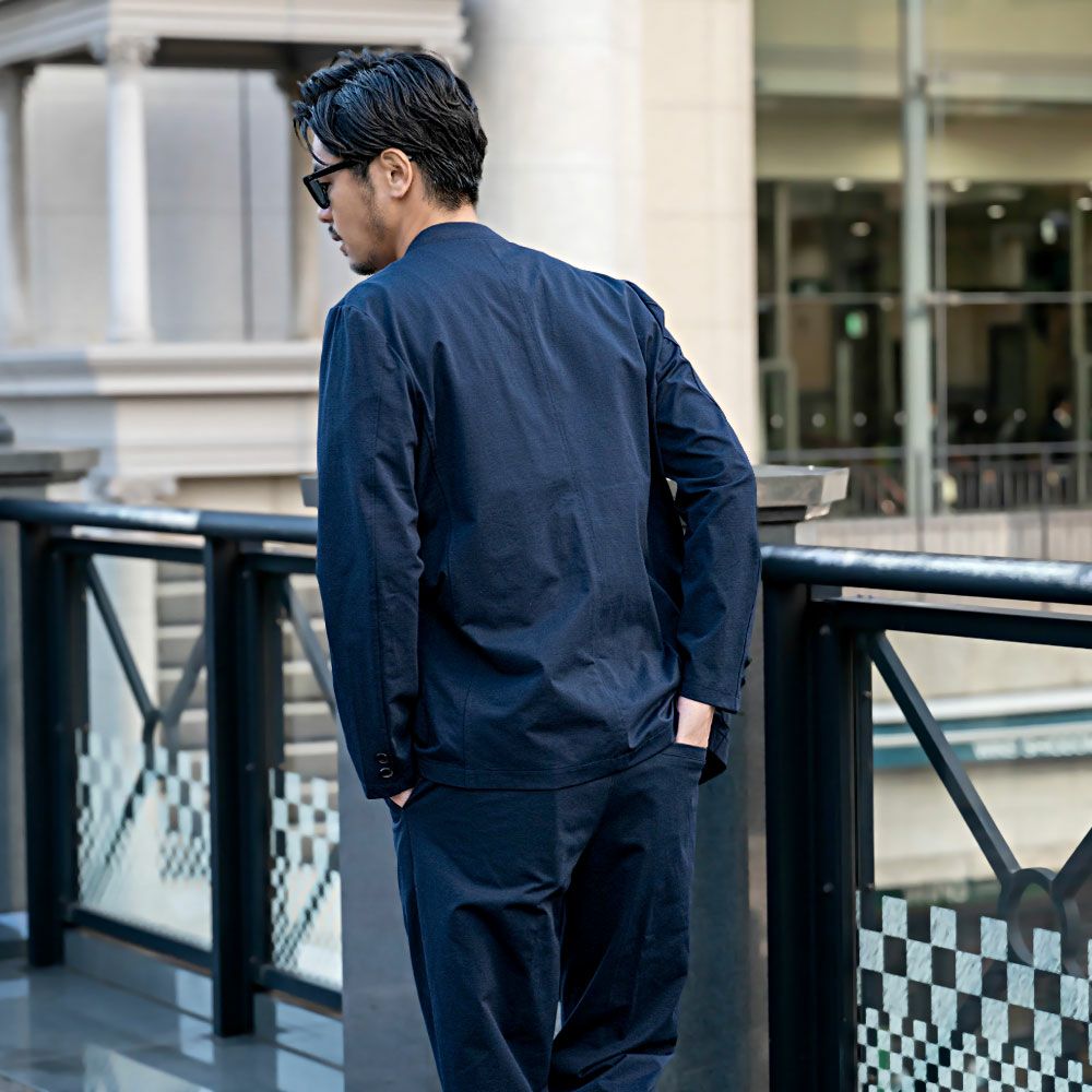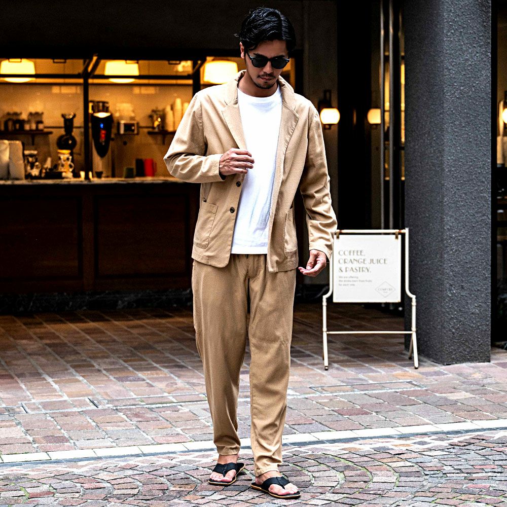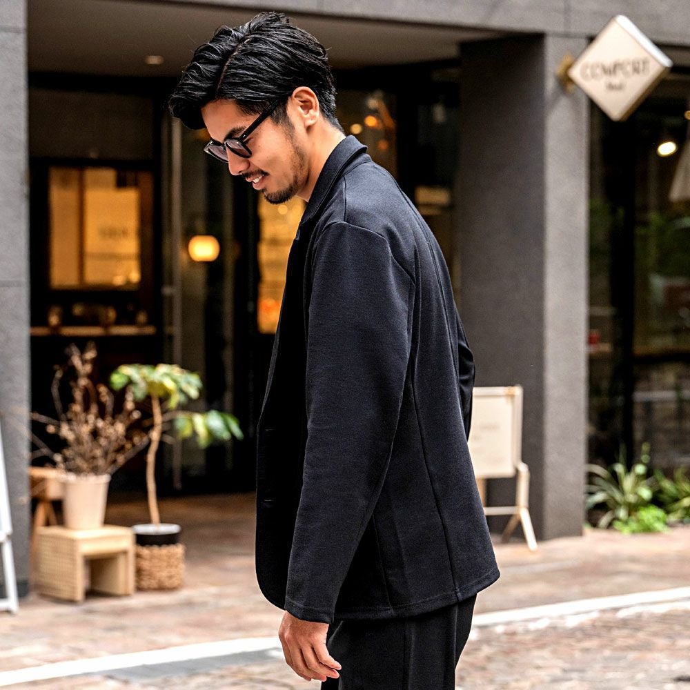 ポンチ素材を使用したテーラードジャケットとパンツのセットアップ。