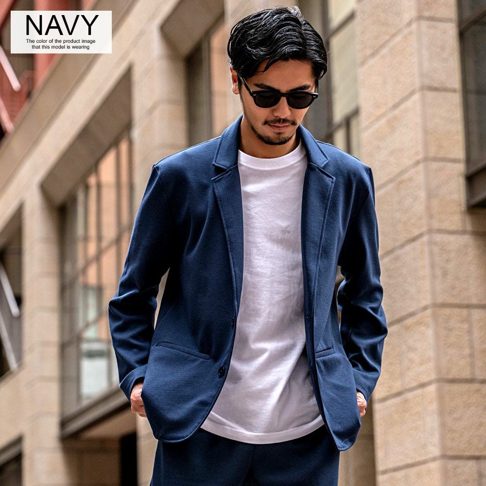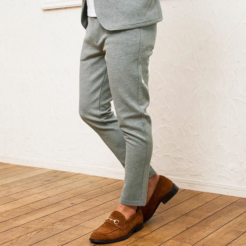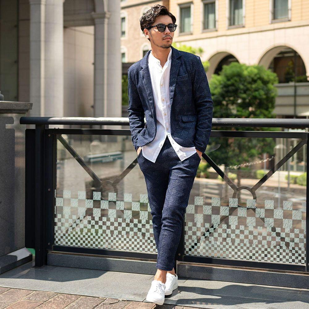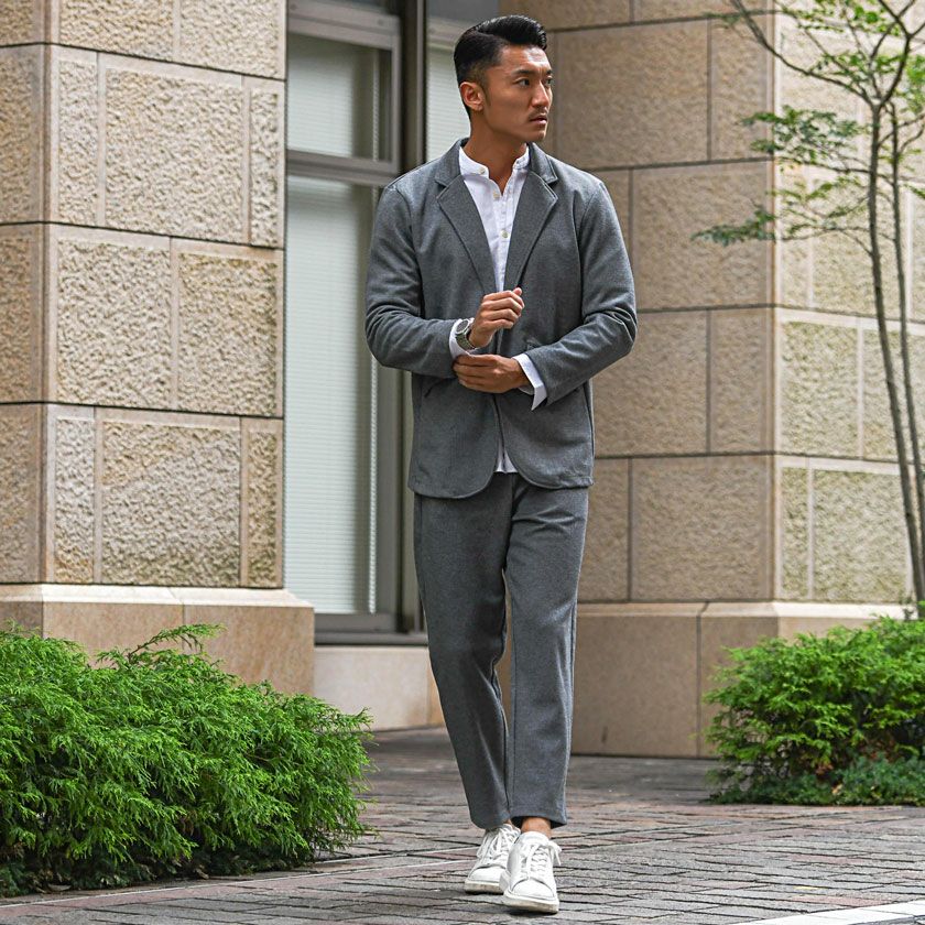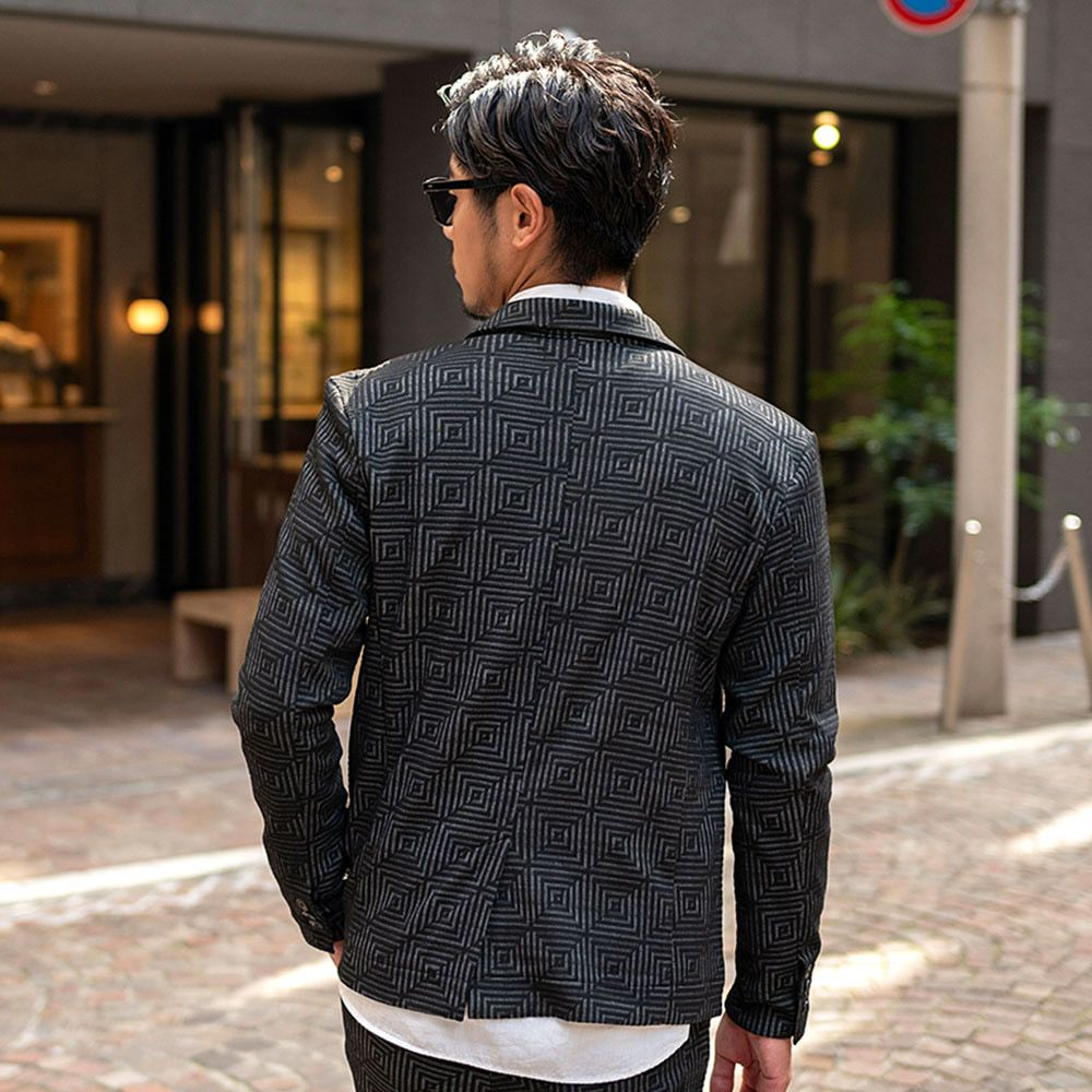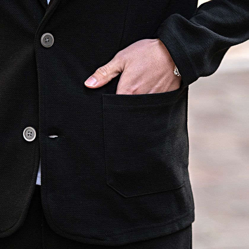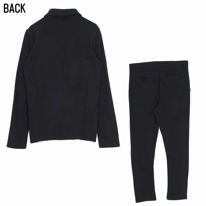 ポンチ素材を使用したテーラードジャケットとパンツのセットアップ。