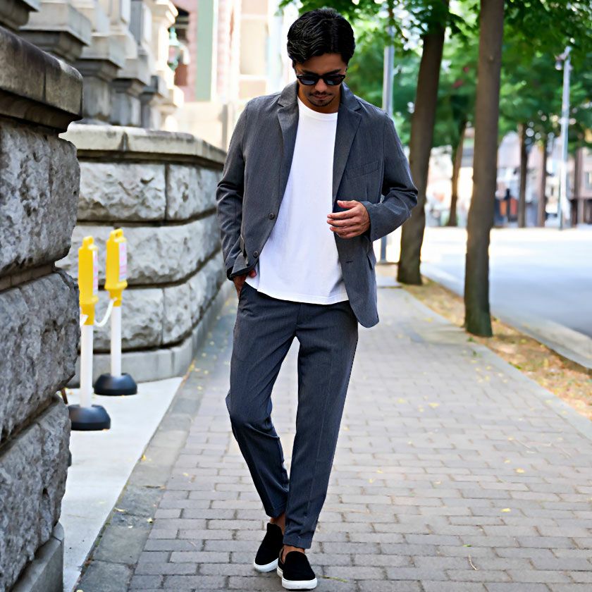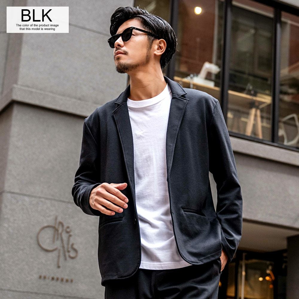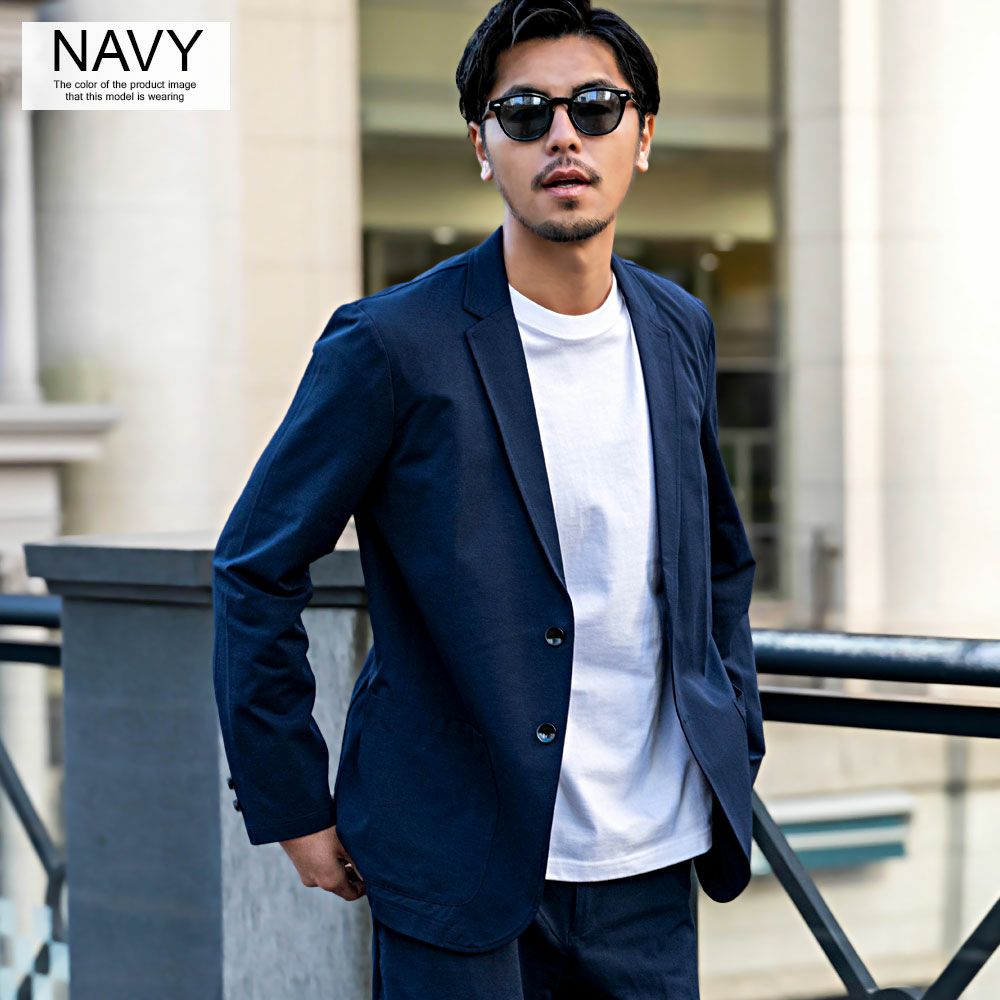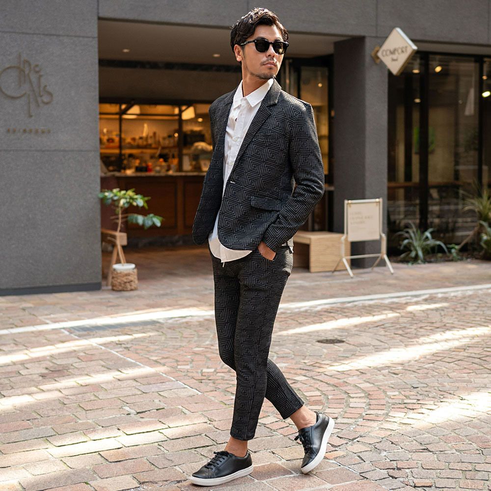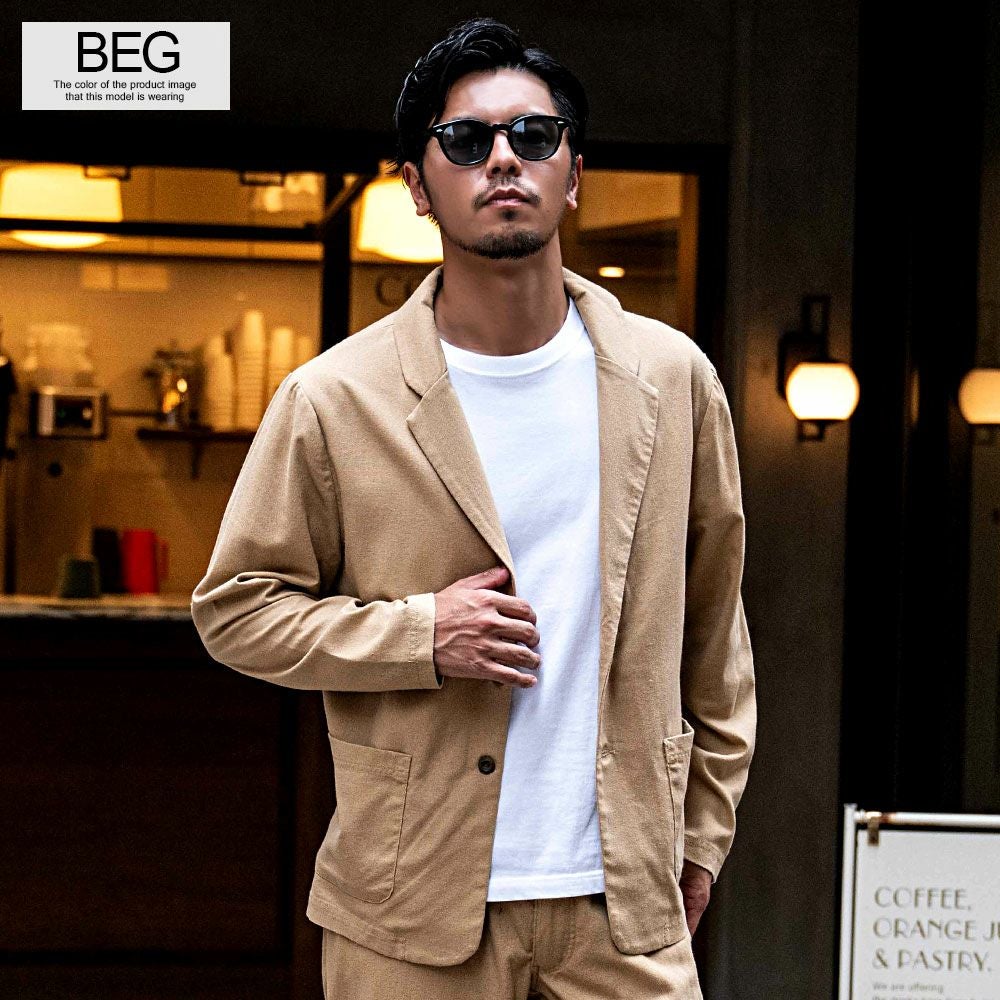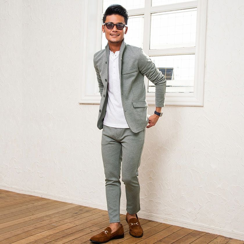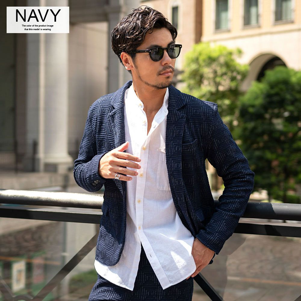 ポンチ素材を使用したテーラードジャケットとパンツのセットアップ。