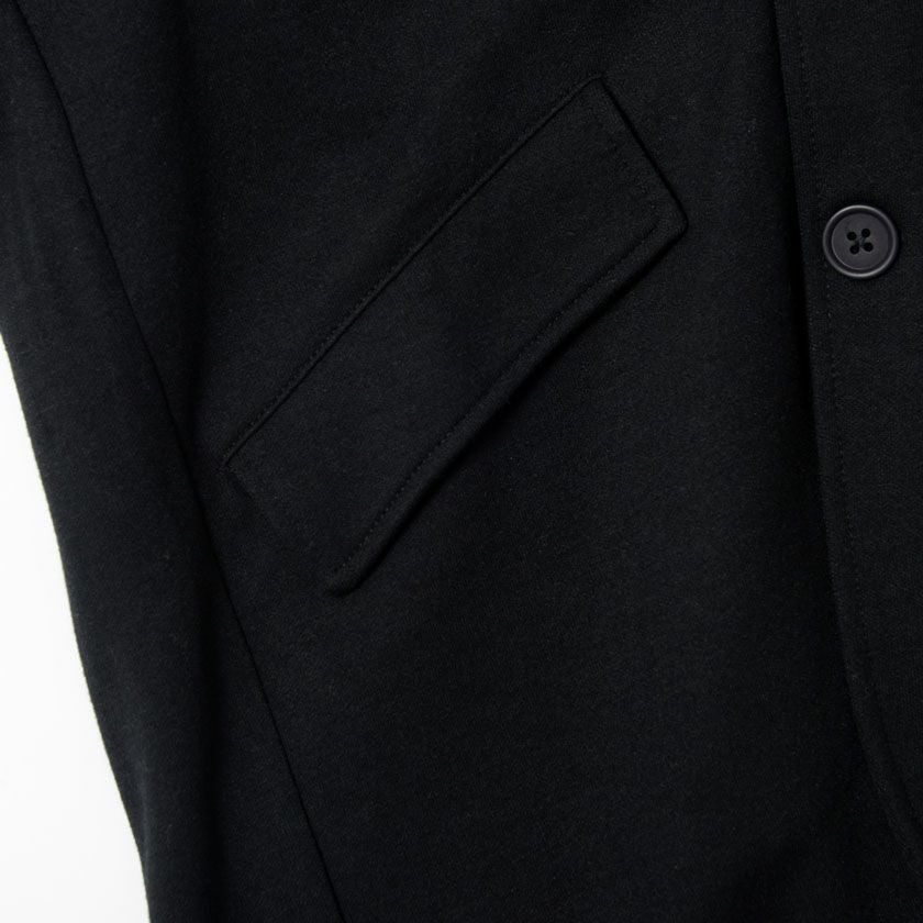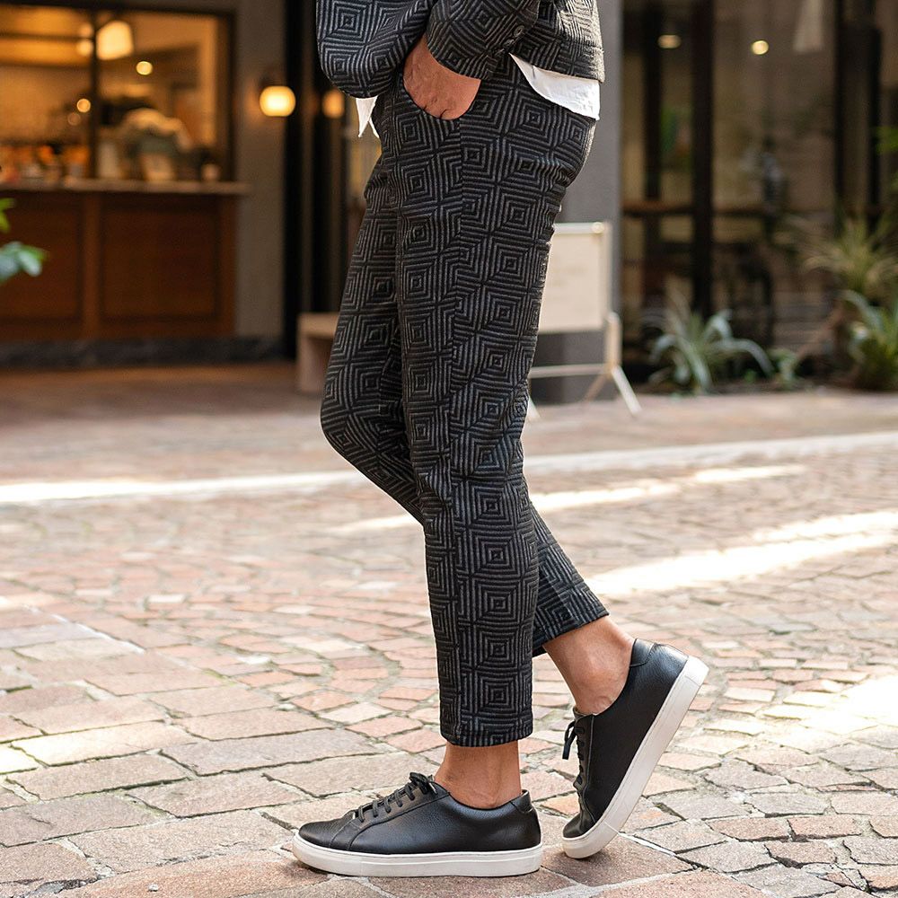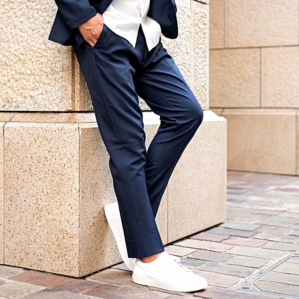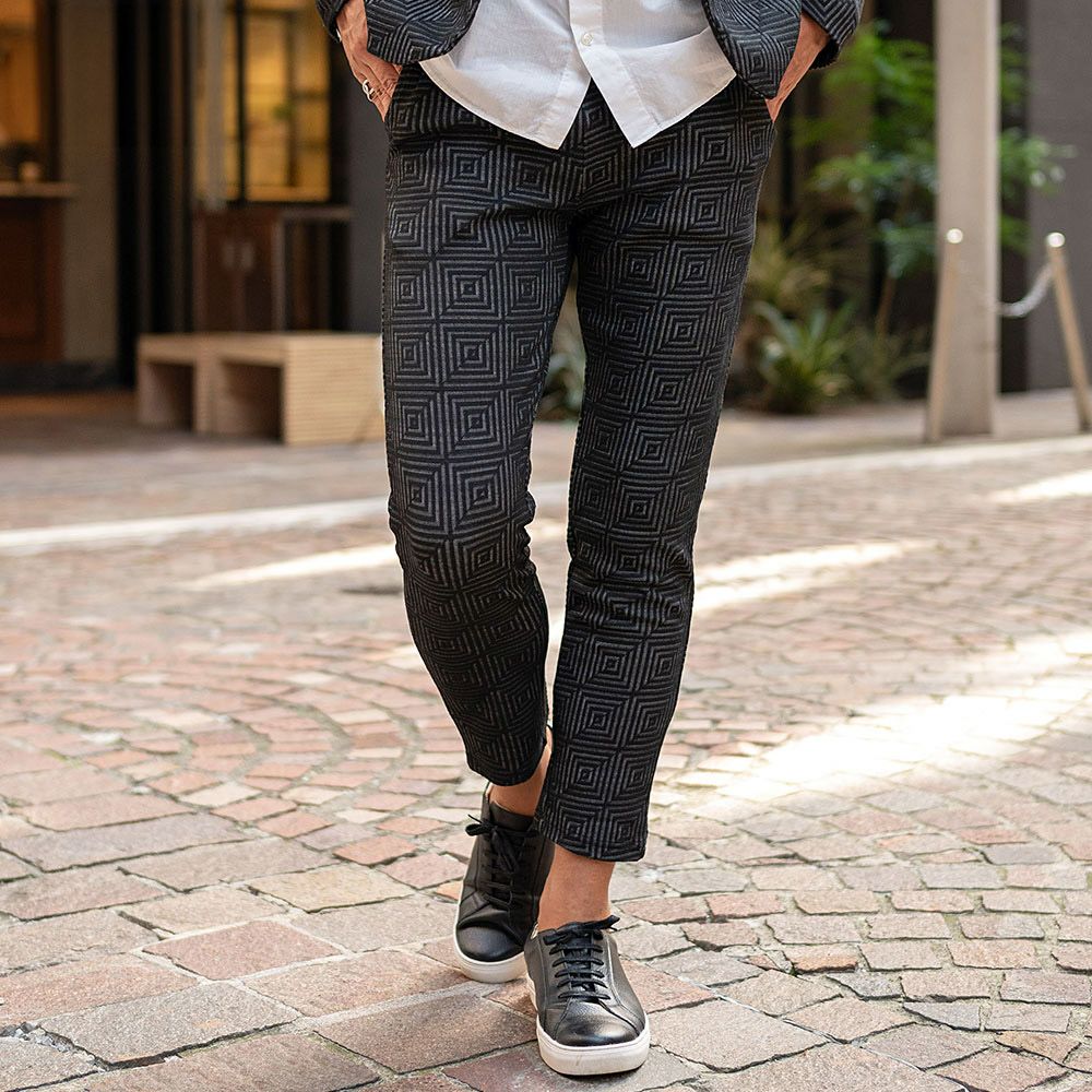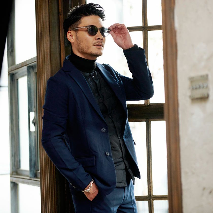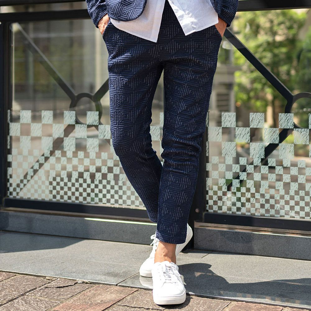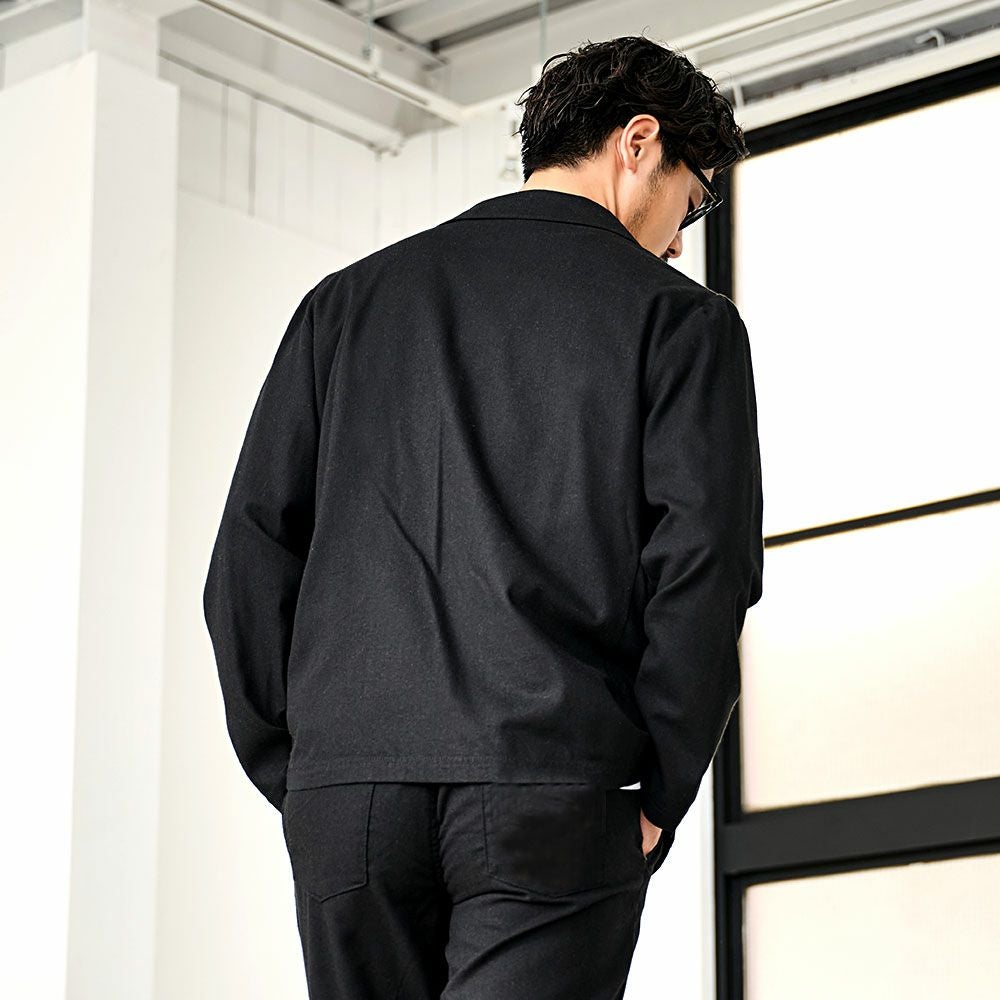 ポンチ素材を使用したテーラードジャケットとパンツのセットアップ。