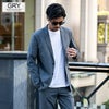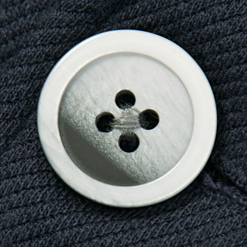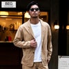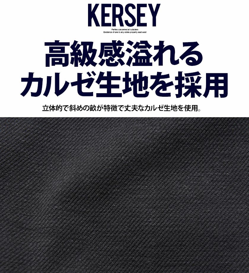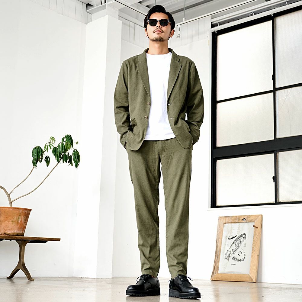 斜めの畝が特徴で程よく光沢感があって丈夫なカルゼ生地を使用。ジャケットはノッチドラペルで、スッキリとしたシルエット。パンツはラインに拘ったテーパードシルエットを採用。