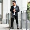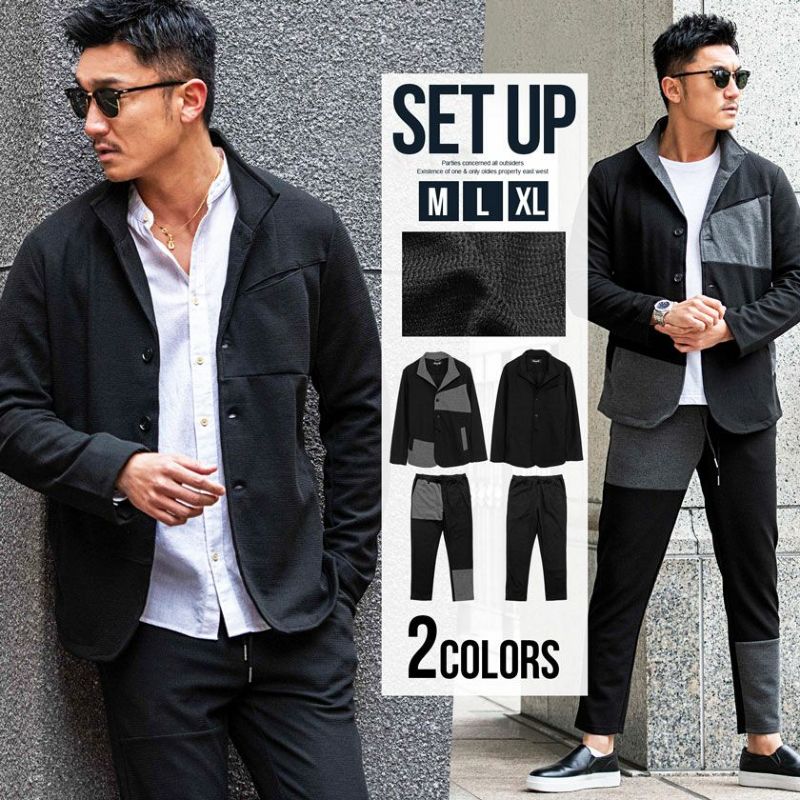 ニット素材を使用したイタリアンカラージャケットとイージーパンツのセットアップ。