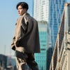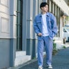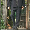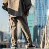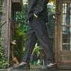 ジャケットは肩の落ちたドロップショルダー仕様、ボトムスはぶかっとしたワイドシルエットが特徴的。