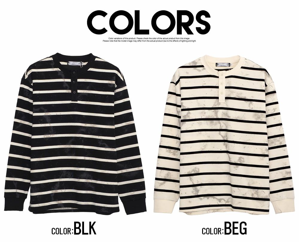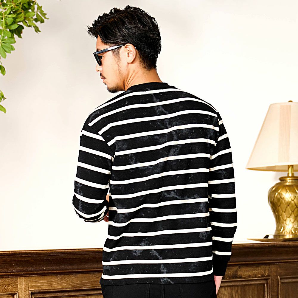 BENUSTA【ベヌスタ】汚し加工ボーダーヘンリーネック長袖Tシャツ/全2色