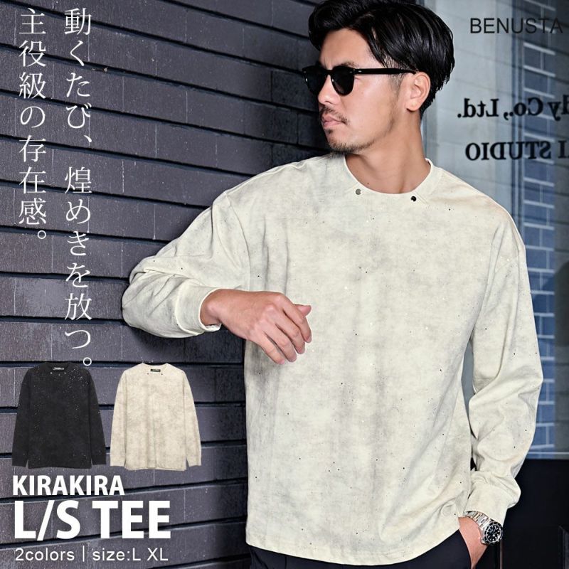 長袖Tシャツ メンズ カットソー シンプル キラキラ 長袖 クルーネック 丸首 カジュアル ビッグシルエット 体型カバー ベーシック コーデ 春 秋 秋服 冬 冬服 秋冬 ファッション ベージュ ブラック L XL 大きいサイズ ゆったり メンズファッション ちょいワル 男性 男 20代 30代 40代 50代 ファッション プレゼント 誕生日 記念日 贈り物 ギフト BENUSTA ベヌスタ