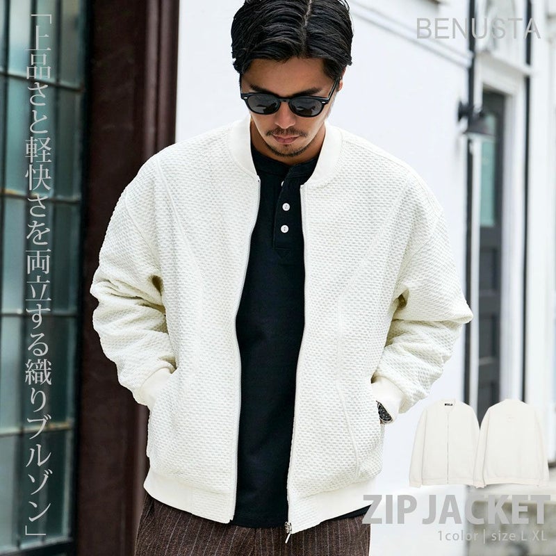 ブルゾン MA-1 ジャケット メンズ ブランド おしゃれ ふくれジャガード ジップアップ ワッフル 織り リブ 上品 大人 シンプル きれいめ カジュアル モード 羽織り アウター 軽量 裏地付き 春 秋 秋服 冬 冬服 秋冬 アイボリー ホワイト 白 L XL LL メンズファッション ちょいワル 男性 男 20代 30代 40代 50代 東京 通勤 通学 旅行 食事会 プレゼント 誕生日 記念日 贈り物 ギフト BENUSTA ベヌスタ
