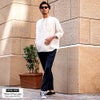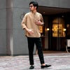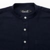 首元をすっきり見せるバンドカラーで、清潔感のある洗練された印象に。