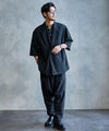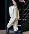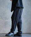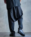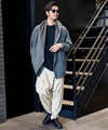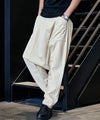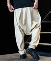 ワタリ・ヒップ・股上を大胆にワイドに設定した、ゆとりのあるシルエットをベースに、裾口をキュッと絞ったサルエルパターンを採用。