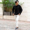 太い毛糸でざっくりと編まれたローゲージニットは厚手な柔らかな着心地と好印象を生み出します。