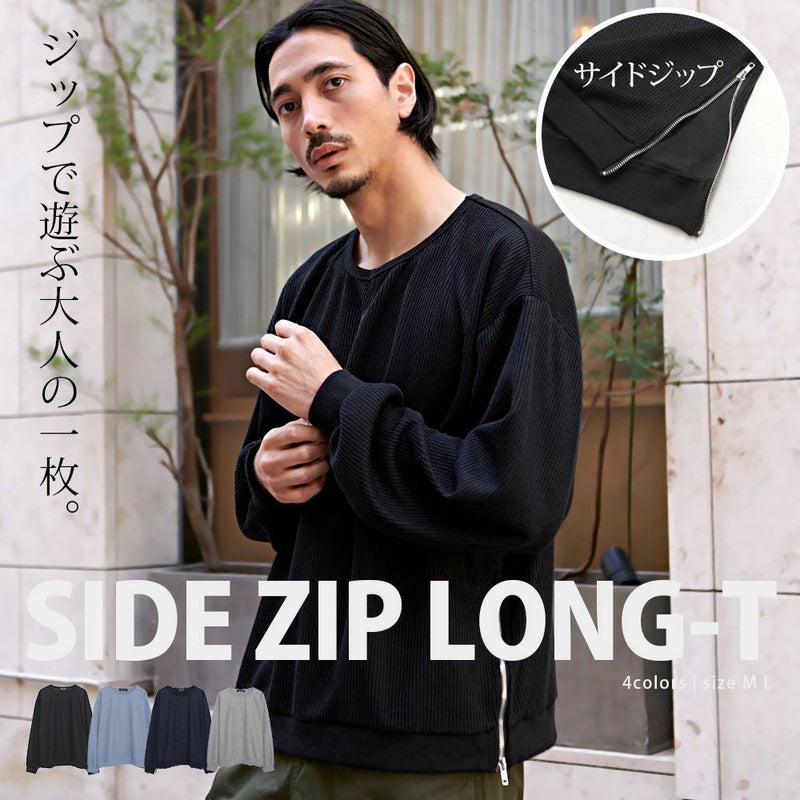 ロンT メンズ 長袖 長袖Tシャツ ブランド おしゃれ 大きいサイズ トップス カットソー インナー クルーネック 無地 シンプル 定番 ベーシック サイドスリット サイドジップ ビッグシルエット オーバーサイズ ゆったり リラックス ストレッチ 伸縮性 ブラック ブルー ネイビー グレー 黒 青 紺 M L CavariA キャバリア 大人 上品 きれいめ モード カジュアル ストリート ストリート系 韓国 韓国系 韓国ファッション 下北沢 下北系 古着 古着系 90s 90年代 2000年代 Y2K ユニセックス レディース 男女兼用 ペア 服 春 夏 春服 夏服 男性 男 父の日 父の日ギフト 父の日プレゼント 20代 30代 40代 ファッション メンズファッション 東京 プレゼント 誕生日 記念日 贈り物 ギフト