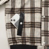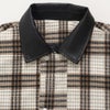 襟元・前立て・ポケット口にはレザー調の素材をあしらい、クラシックなチェック柄にさりげなくモードな印象をプラスしました。
