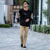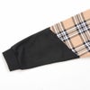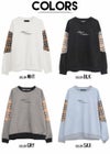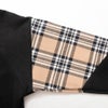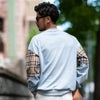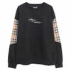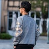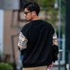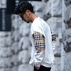 袖に大胆に切り替えたチェックと胸の刺繍が印象的なトレーナーとなっています。