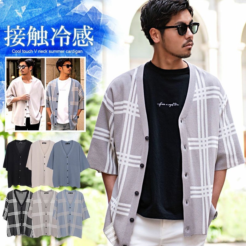 接触冷感 カーディガン メンズ サマーカーディガン 薄手 5分袖 五分袖 ひんやり 無地 チェック柄 おしゃれ ビッグシルエット オーバーサイズ 大きいサイズ ブラック グレー ブルー 黒 青 カジュアル シンプル きれいめ ストリート CavariA キャバリア ブランド M L 春 夏 ストリートファッション 下北沢 下北系 古着 古着系 90s 90年代 2000年代 Y2K 男性 男 父の日 父の日ギフト 父の日プレゼント 20代 30代 40代 メンズファッション 東京 プレゼント 誕生日 記念日 贈り物 ギフト