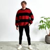 ニット メンズ セーター おしゃれ ボーダー柄 フェザーヤーン ふわふわ ふわもこ 暖かい あったか ビッグシルエット オーバーサイズ ゆったり 大きいサイズ ユニセックス クルーネック ブラック ホワイト チャコール レッド ブルー 黒 白 赤 青 M L CavariA キャバリア ブランド カジュアル ストリート系 シンプル ストリートファッション 韓国 韓国系 韓国ファッション 下北沢 下北系 古着 古着系 90s 90年代 2000年代 Y2K 大人 オシャレ 男性 父の日ギフト プレゼント 誕生日 記念日 贈り物 ギフト フェザーセーター ビッグシルエットニット ゆるニット メンズファッション モード系 秋冬ニット トレンドセーター カジュアルニット ルーズシルエット レイヤードスタイル メンズニットトップス