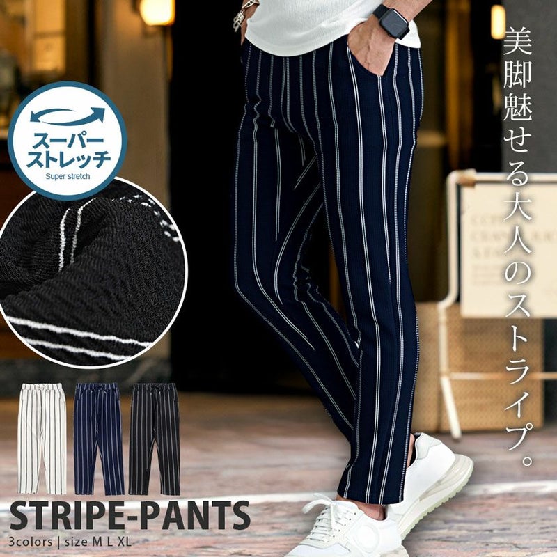 パンツ メンズ ブランド おしゃれ ファッション アンクルパンツ スラックス ボトムス セットアップ可 ストレッチ ストライプ 伸縮性 細身 タイト スリム ホワイト ネイビー ブラック カジュアル きれいめ 大人 春 夏 CavariA キャバリア リモートワーク 在宅勤務 父の日 父の日ギフト 父の日プレゼント 20代 30代 40代 メンズファッション 東京 プレゼント 贈り物 ギフト