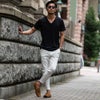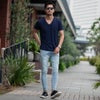 程よく開いたVネックはすっきりとした色気のある首元に魅せてくれます。
