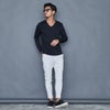 程よく開いたVネックはすっきりとした色気のある首元に魅せてくれます。