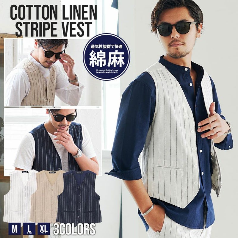 ベスト メンズ ブランド おしゃれ 大人 春夏 ジレ ストライプ 綿麻 ストライプ柄 ボタンベスト コットンリネン キレイめ レイヤード 爽やか 通気性 カジュアル ホワイト ベージュ ネイビー 白 紺 CavariA キャバリア M L 春 春服 夏 夏服 ファッション 父の日 父の日ギフト 東京 プレゼント 贈り物 ギフト