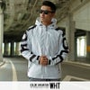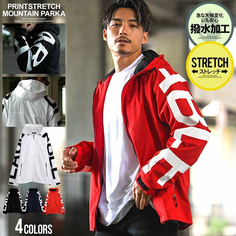 袖に存在感抜群のプリントを施したマウンテンパーカー。