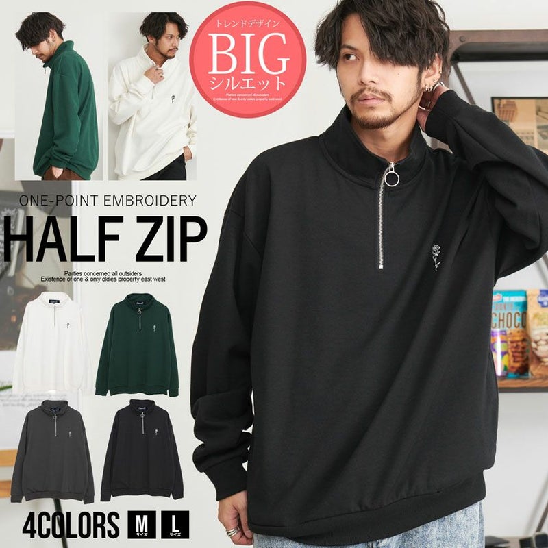 トレーナー メンズ ハーフZIP 長袖 刺繍 薔薇 バラ ローズ ワンポイント スタンドカラー スエット スウェット ハーフジップ トップス スタンド カジュアル ユニセックス ホワイト グリーン ブラック チャコール M L CavariA キャバリア 春 秋 冬 20代 30代 40代 メンズファッション 東京 プレゼント 誕生日 記念日 贈り物 ギフト