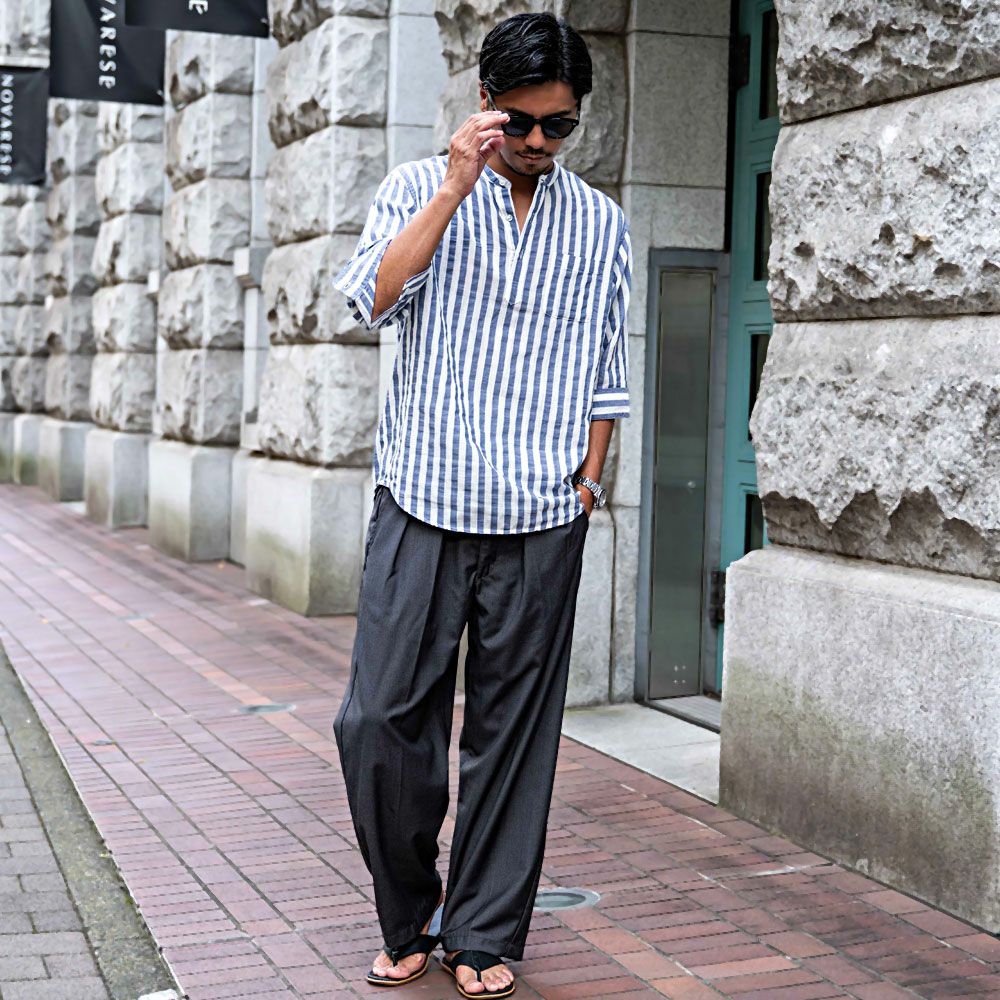 CavariA【キャバリア】パナマ織ストライプバンドカラープルオーバー7分袖シャツ/全2色