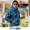 目を惹く迷彩柄のボディにセンターのロゴ刺繍とカンガルーポケットなど細部にまで拘ったアイテムです。