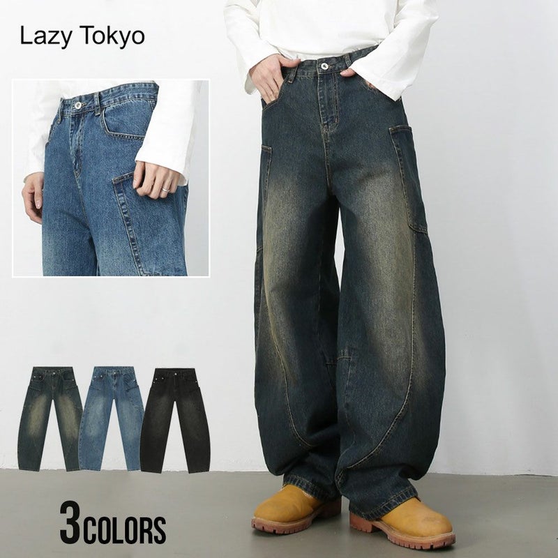 デニムパンツ メンズ おしゃれ バギーパンツ ジーパン テーパードパンツ Gパン 立体裁断 ジーンズ ワイドデニム デニム パンツ ワイドパンツ ダーツ加工 色落ち ヴィンテージ 古着風 ビンテージ カジュアル ストリート インディゴブルー ブルー ブラック 黒 青 Lazy Tokyo オールシーズン 20代 30代 40代 ユニセックス 男性 男 服 夏 夏服 ファッション メンズファッション 東京 プレゼント 誕生日 記念日 贈り物 ギフト